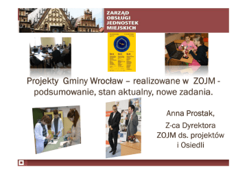 Projekty Gminy Wrocław – realizowane w ZOJM podsumowanie, stan aktualny, nowe zadania. Anna Prostak, Z-ca Dyrektora ZOJM ds. projektów i Osiedli Projekty zakończone „Indywidualizacja procesu nauczania … wychowania uczniów klas II--III wrocławskich szkół podstawowych” adresowany do uczniów szkół podstawowych. Ogólny budżet projektu: 6 517 608 zł, „Badacz i humanista – wrocławski gimnazjalista …” - adresowany do uczniów gimnazjów. Ogólny budżet projektu: 714 245,45 zł. „Nowy model nauczania …” . Lider projektu: Fundacja Promyk Słońca. Ogólny budżet projektu: 1 999 663 zł Projekty w realizacji w 2015 1. „Włączenie nowych technik konsultacyjnych do procesu konsultowania polityk publicznych Gminy Wrocław” dofinansowany z Programu Operacyjnego Kapitał Ludzki, budżet projektu: projektu: 240 330 zł. zł. Lider: Lider: Fundacja Rozwoju Demokracji Lokalnej, Partner: Partner: Gmina Wrocław (Realizator – ZOJM) 2. „Program bezpłatnych szkoleń ECDL dla Rad Osiedlowych” dofinansowany z Programu Operacyjnego Kapitał Ludzki, budżet projektu: projektu: 432 512 zł. zł. Lider - firma CARGO, Partner: Partner: Gmina Wrocław (ZOJM – Realizator). Realizator). 3. „PUNKT EKLEKTIK SESSION” - dofinansowany z funduszy MF EOG, pochodzących z Islandii, Liechtensteinu i Norwegii oraz budżetu Państwa i środków Gminy Wrocław. Wrocław. Budżet projektu: projektu: 1 219 639 zł, Beneficjent: Beneficjent: Gmina Wrocław (Realizator – ZOJM). ZOJM). 4. „Mój pierwszy biznes przed 20tką” 20tką” – skierowany do uczniów wrocławskich szkół ponadgimnazjalnych, przygotowany i realizowany przez Urząd Miasta – Dep. Dep. Edukacji, ZOJM i Wyższą Szkołę Bankową, PKO BP – Sponsor strategiczny. strategiczny. Działania ZOJM na lata 20152015-2020 (obszar „projektowy”) 1. Zakończenie i rozliczenie 3 projektów dofinasowanych ze źródeł zewnętrznych (aktualnie realizowanych). realizowanych). 2. Kontynuacja projektu Projekt „Mój pierwszy biznes przed 20tką” 20tką” w roku 2015/ 2015/2016 (rozszerzenie współpracy z UM Opole). Opole). 3. Dalsza współpraca z Osiedlami – przygotowanie i realizacja projektów dedykowanych wrocławskim Osiedlom. Osiedlom. 4. Współpraca z jednostkami Departamentu Edukacji UM Wrocławia przy pozyskaniu dofinasowania ze środków zewnętrznych i realizacji projektów – np. np. z Wrocławskim Centrum Integracji Społecznej. Społecznej. Działania ZOJM na lata 20152015-2020 (c.d.) 5. Utworzenie bieżącej „bazy programów” – jako nowe zadanie Działu Projektów ZOJM Zakres działania: • wyszukiwanie/zbieranie informacji o programach • udostępnianie informacji jednostkom Departamentu Edukacji • konsultacje możliwości aplikowania o środki zewnętrzne /weryfikacja pomysłów na projekty dofinansowane ze środków zewnętrznych Korzyści dla Szkół: • oszczędność czasu • wsparcie jednostek w pozyskaniu dodatkowych środków • wsparcie merytoryczne w zakresie przygotowania i realizacji projektów Osoby kontaktowe w zakresie „bazy programów”: Zarząd Obsługi Jednostek Miejskich, Dział Projektów ul. Namysłowska 8, 5050-304 Wrocław www.zojm.wroclaw.pl (zakładka projekty) • Agata Szklińska (kierownik Działu Projektów) tel.: 71 798 64 29 , pok. 208 e-mail: [email protected] • Alicja Pietrzyk, osoba odpowiedzialna za „bazę programów” tel. : 71 798 64 28, pok. 206 e-mail: [email protected] Działania ZOJM na lata 20152015-2020 (c.d.) 6. Prace nad przygotowaniem projektu: projektu: „Zintegrowany portal e-usług wspomagający realizację zadań publicznych gmin objętych ZIT WrOF w obszarze kultury… kultury…” w ramach RPO WD 2014 – 2020 ZIT WrOF (udział w spotkaniach roboczych dotyczących ZIT WrOF, udział w spotkaniach z przedstawicielami gmin objętych ZIT WrOF) - Powstanie zintegrowanego innowacyjnego portalu internetowego ee-usług w zakresie kultury - Promocja wydarzeń artystycznych, folkloru na obszarach wiejskich, miejsko – wiejskich - Realizacja zadań publicznych gmin oraz zapisów strategii gmin, strategii Lokalnych Grup Działania - Popularyzacja aktywnej turystyki kulturowej - Promocja gmin oraz innych partnerów projektu – poprzez portal - Nawiązanie szerokiej partnerskiej współpracy gmin należących do ZIT WrOF Korzyści z realizacji projektu: Dziękuję za uwagę