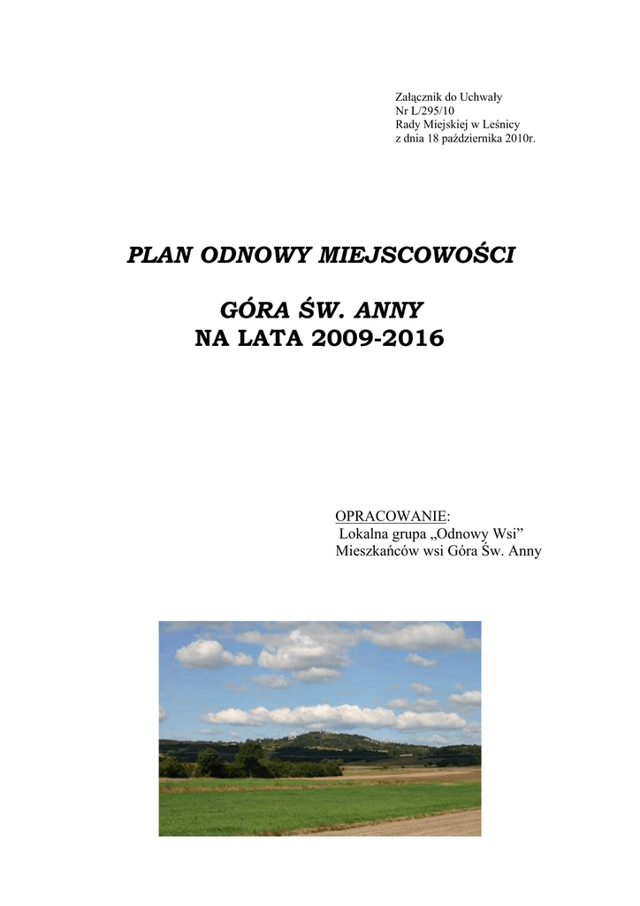 Załącznik do Uchwały Nr L/295/10 Rady Miejskiej w Leśnicy z dnia 18 października 2010r. PLAN ODNOWY MIEJSCOWOŚCI GÓRA ŚW. ANNY NA LATA 2009-2016 OPRACOWANIE: Lokalna grupa „Odnowy Wsi” Mieszkańców wsi Góra Św. Anny SPIS TREŚCI : 1.Wstęp ………………………………………………………………………………..…… 3 2. Zasoby obszaru sołectwa …………………………………….………………….………. 4 2.1 Zasoby przyrodnicze, położenie ………………………...……………….………… 4 2.2 Zasoby kulturowe ……………………………………………………….…………… 5 2.3 Mieszkańcy, organizacje społeczne, instytucje ……………………..….……………..6 2.4. Gospodarka, rolnictwo …………………………………………….………………. 7 2.5 Infrastruktura społeczna i techniczna …………………………………………… 8 2.6 Analiza zasobów i ich znaczenie ………………………………………….………… 9 3. Ocena silnych i słabych stron oraz szans i zagrożeń ……………………….………… 10 4. Analiza potencjału rozwojowego wsi ……………………………………….………... 12 5. Makieta programu długoterminowego……………………………………………….... .13 6. Opis planowanych zadań inwestycyjnych i przedsięwzięć aktywizujących społeczność lokalną …………………………………………………………………………………...….. 18 7. Opis i charakterystyka obszarów o szczególnym znaczeniu dla zaspokojenia potrzeb mieszkańców, sprzyjających nawiązaniu kontaktów społecznych, ze względu na ich położenie oraz cechy funkcjonalno-przestrzenne , a w szczególności poprzez odnawianie lub 20 budowę placów parkingowych, chodników lub oświetlenia ulicznego. 2 1.Wstęp Plan odnowy miejscowości dotyczy sołectwa Góra Św. Anny, w gminie Leśnica, w województwie opolskim. Nasza miejscowość jest na tle innych sołectw w naszej gminie i województwie, wsią specyficzną. Góra Św. Anny, za sprawą cudownej figurki świętej Anny, jej sanktuarium i franciszkanów, jest najbardziej znanym na Śląsku Opolskim miejscem pielgrzymkowym. Co roku odwiedza naszą miejscowość kilkaset tysięcy pielgrzymów i turystów, nie tylko ze względu na sanktuarium św. Anny, ale również na ciekawą historię i piękną przyrodę. Czeka tu na nich największy w Europie Środkowej amfiteatr skalny, monumentalny Pomnik Czynu Powstańczego, a także jedyny w naszym województwie rezerwat geologiczny z ciekawymi skałami oraz piękne bukowe lasy otaczające amfiteatr. Swoją wiedzę na temat historii mogą pogłębić w Muzeum Czynu Powstańczego i Muzeum Klasztornym. Mogą także odwiedzić Muzeum Misyjne, gdzie franciszkanie zebrali i wystawili wiele eksponatów, przywiezionych przez misjonarzy franciszkańskich z całego świata. Góra Św. Anny to nie tylko pielgrzymi i turyści, ale również mieszkańcy, którzy mają swoje potrzeby i chcą żyć w sposób godny, myśląc o dobrej przyszłości. Stąd ta inicjatywa, aby zrobić wspólnie coś, co mogłoby polepszyć nasz wspólny byt i znaleźć sposób na realizację tego planu od strony finansowej. Po spotkaniach w ramach szkolenia oraz konsultacjach we własnym gronie, mieszkańcy Góry Św. Anny, wraz z sołtysem, radą sołecką i grupą „Odnowy wsi”, sformułowali wizję dla naszej miejscowości w sposób następujący: Góra Św. Anny – wieś, w której mieszkańcy żyją dostatnio, bezpiecznie, w zgodzie i harmonii, pod opieką św. Anny. Wizja ta określa, do czego dążą „świętoannicy” i co jest dla nich najważniejsze. Nie wyróżniamy się niczym spośród innych mieszkańców gminy, czy województwa, ale brakuje nam inicjatywy , która mogłoby nas zintegrować i zachęcić do działania. Może właśnie „Odnowa wsi” jest tą szansą dla Góry Św. Anny i jej mieszkańców. 3 2. Zasoby obszaru sołectwa. 2.1. Zasoby przyrodnicze, położenie. Góra Św. Anny leży w paśmie Chełmu, we środkowo-wschodniej części województwa opolskiego, na terenie powiatu strzeleckiego, w gminie Leśnica. Miejscowość jest centrum Parku Krajobrazowego „Góra Św. Anny”. Ze względu na wyniesienie terenu Góry Św. Anny w stosunku do terenów przyległych do niej, cechuje się ona pewną odrębnością klimatyczną (np. nieznaczne obniżenie średniej i maksymalnej temperatury rocznej, większa ilość opadów rocznie – ok. 766 mm, dłużej utrzymujący się w zimie śnieg). Budowa geologiczna rejonu Góry Św. Anny wywarła istotny wpływ na stosunki wodne całego regionu. Zalegające tutaj wapienie i dolomity triasowe wykazują silne uszczelnienie i krasowienie, a co za tym idzie, wody opadowe bardzo szybko przenikają w głąb podłoża i pod powierzchnią odpływają do Odry i Małej Panwi. Z tego powodu sieć wód powierzchniowych jest bardzo uboga, za to podziemne warstwy wodonośne są bardzo zasobne. Charakteryzują się średnią mineralizacją wahającą się w granicach 350-590 mg/dm3. W rejonie Chełma występują utwory gliniaste węglanowe z okresu formacji triasowej, wytworzone z trudno wietrzejących wapieni. Są to utwory powierzchniowo spiaszczone o lekkim składzie granulometrycznym poziomu próchniczego. Ze względu na budowę geologiczną Góra Św. Anny od wieków była miejscem odkrywkowej eksploatacji surowców mineralnych: wapienia, bazaltu i piasku. Szata roślinna Góry Św. Anny i okolic jest bardzo bogata. Dotyczy to zarówno lasów, w których przeważają buczyny z wieloma gatunkami roślin chronionych (w tym również storczyków), jak i zbiorowiska roślin nieleśnych, gdzie na szczególną uwagę zasługują murawy kserotermiczne, występujące na kilku stanowiskach. W samej miejscowości znajduje się jedyny w naszym województwie rezerwat geologiczny „Góra Św. Anny