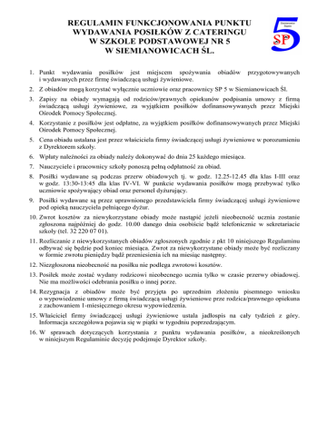 REGULAMIN FUNKCJONOWANIA PUNKTU WYDAWANIA POSIŁKÓW Z CATERINGU W SZKOLE PODSTAWOWEJ NR 5 W SIEMIANOWICACH ŚL. 1. Punkt wydawania posiłków jest miejscem spożywania i wydawanych przez firmę świadczącą usługi żywieniowe. obiadów przygotowywanych 2. Z obiadów mogą korzystać wyłącznie uczniowie oraz pracownicy SP 5 w Siemianowicach Śl. 3. Zapisy na obiady wymagają od rodziców/prawnych opiekunów podpisania umowy z firmą świadczącą usługi żywieniowe, za wyjątkiem posiłków dofinansowywanych przez Miejski Ośrodek Pomocy Społecznej. 4. Korzystanie z posiłków jest odpłatne, za wyjątkiem posiłków dofinansowywanych przez Miejski Ośrodek Pomocy Społecznej. 5. Cena obiadu ustalana jest przez właściciela firmy świadczącej usługi żywieniowe w porozumieniu z Dyrektorem szkoły. 6. Wpłaty należności za obiady należy dokonywać do dnia 25 każdego miesiąca. 7. Nauczyciele i pracownicy szkoły ponoszą pełną odpłatność za obiad. 8. Posiłki wydawane są podczas przerw obiadowych tj. w godz. 12.25-12.45 dla klas I-III oraz w godz. 13:30-13:45 dla klas IV-VI. W punkcie wydawania posiłków mogą przebywać tylko uczniowie spożywający obiad oraz personel dyżurujący. 9. Posiłki wydawane są przez uprawnionego przedstawiciela firmy świadczącej usługi żywieniowe pod opieką nauczyciela pełniącego dyżur. 10. Zwrot kosztów za niewykorzystane obiady może nastąpić jeżeli nieobecność ucznia zostanie zgłoszona najpóźniej do godz. 10.00 danego dnia osobiście bądź telefonicznie w sekretariacie szkoły (tel. 32 220 07 01). 11. Rozliczanie z niewykorzystanych obiadów zgłoszonych zgodnie z pkt 10 niniejszego Regulaminu odbywać się będzie pod koniec miesiąca. Zwrot za niewykorzystane obiady może być rozliczany w formie zwrotu pieniędzy bądź przeniesienia ich na miesiąc następny. 12. Niezgłoszona nieobecność na posiłku nie podlega zwrotowi kosztów. 13. Posiłek może zostać wydany rodzicowi nieobecnego ucznia tylko w czasie przerwy obiadowej. Nie ma możliwości odebrania posiłku o innej porze. 14. Rezygnacja z obiadów może być przyjęta po uprzednim złożeniu pisemnego wniosku o wypowiedzenie umowy z firmą świadczącą usługi żywieniowe prze rodzica/prawnego opiekuna z zachowaniem 1-miesięcznego okresu wypowiedzenia. 15. Właściciel firmy świadczącej usługi żywieniowe ustala jadłospis na cały tydzień z góry. Informacja szczegółowa pojawia się w piątki w tygodniu poprzedzającym. 16. W sprawach dotyczących korzystania z punktu wydawania posiłków, a nieokreślonych w niniejszym Regulaminie decyzję podejmuje Dyrektor szkoły.