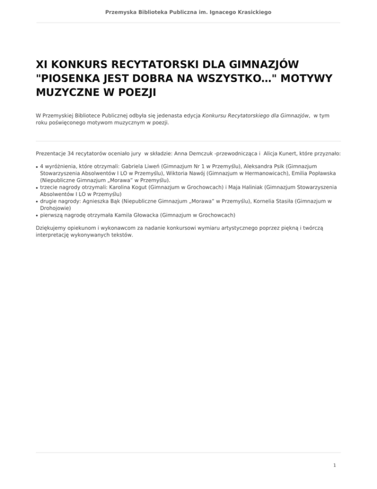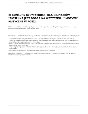 Przemyska Biblioteka Publiczna im. Ignacego Krasickiego XI KONKURS RECYTATORSKI DLA GIMNAZJÓW "PIOSENKA JEST DOBRA NA WSZYSTKO…" MOTYWY MUZYCZNE W POEZJI W Przemyskiej Bibliotece Publicznej odbyła się jedenasta edycja Konkursu Recytatorskiego dla Gimnazjów, w tym roku poświęconego motywom muzycznym w poezji. Prezentacje 34 recytatorów oceniało jury w składzie: Anna Demczuk -przewodnicząca i Alicja Kunert, które przyznało: ● ● ● ● 4 wyróżnienia, które otrzymali: Gabriela Liweń (Gimnazjum Nr 1 w Przemyślu), Aleksandra Psik (Gimnazjum Stowarzyszenia Absolwentów I LO w Przemyślu), Wiktoria Nawój (Gimnazjum w Hermanowicach), Emilia Popławska (Niepubliczne Gimnazjum „Morawa” w Przemyślu). trzecie nagrody otrzymali: Karolina Kogut (Gimnazjum w Grochowcach) i Maja Haliniak (Gimnazjum Stowarzyszenia Absolwentów I LO w Przemyślu) drugie nagrody: Agnieszka Bąk (Niepubliczne Gimnazjum „Morawa” w Przemyślu), Kornelia Stasiła (Gimnazjum w Drohojowie) pierwszą nagrodę otrzymała Kamila Głowacka (Gimnazjum w Grochowcach) Dziękujemy opiekunom i wykonawcom za nadanie konkursowi wymiaru artystycznego poprzez piękną i twórczą interpretację wykonywanych tekstów. 1