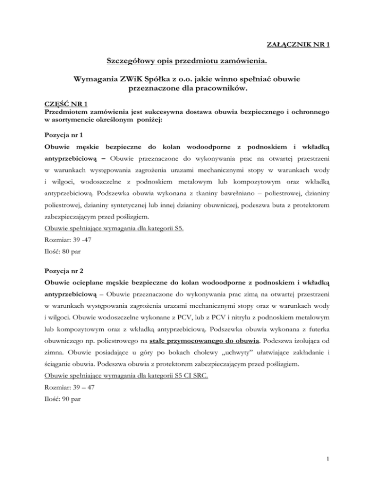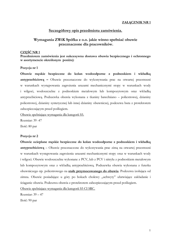 ZAŁĄCZNIK NR 1 Szczegółowy opis przedmiotu zamówienia. Wymagania ZWiK Spółka z o.o. jakie winno spełniać obuwie przeznaczone dla pracowników. CZĘŚĆ NR 1 Przedmiotem zamówienia jest sukcesywna dostawa obuwia bezpiecznego i ochronnego w asortymencie określonym poniżej: Pozycja nr 1 Obuwie męskie bezpieczne do kolan wodoodporne z podnoskiem i wkładką antyprzebiciową – Obuwie przeznaczone do wykonywania prac na otwartej przestrzeni w warunkach występowania zagrożenia urazami mechanicznymi stopy w warunkach wody i wilgoci, wodoszczelne z podnoskiem metalowym lub kompozytowym oraz wkładką antyprzebiciową. Podszewka obuwia wykonana z tkaniny bawełniano – poliestrowej, dzianiny poliestrowej, dzianiny syntetycznej lub innej dzianiny obuwniczej, podeszwa buta z protektorem zabezpieczającym przed poślizgiem. Obuwie spełniające wymagania dla kategorii S5. Rozmiar: 39 -47 Ilość: 80 par Pozycja nr 2 Obuwie ocieplane męskie bezpieczne do kolan wodoodporne z podnoskiem i wkładką antyprzebiciową – Obuwie przeznaczone do wykonywania prac zimą na otwartej przestrzeni w warunkach występowania zagrożenia urazami mechanicznymi stopy oraz w warunkach wody i wilgoci. Obuwie wodoszczelne wykonane z PCV, lub z PCV i nitrylu z podnoskiem metalowym lub kompozytowym oraz z wkładką antyprzebiciową. Podszewka obuwia wykonana z futerka obuwniczego np. poliestrowego na stałe przymocowanego do obuwia. Podeszwa izolująca od zimna. Obuwie posiadające u góry po bokach cholewy „uchwyty” ułatwiające zakładanie i ściąganie obuwia. Podeszwa obuwia z protektorem zabezpieczającym przed poślizgiem. Obuwie spełniające wymagania dla kategorii S5 CI SRC. Rozmiar: 39 – 47 Ilość: 90 par 1 Pozycja nr 3 Kombinezon rybacki męski – Kombinezon przeznaczony dla pracowników kanalizacji oraz sieci wodociągowej jako ochrona przed wodą. Wykonany z jednej części – buty (kalosze) połączone na trwałe ze spodniami. Kombinezon wykonany np. z PCV i poliestru o gramaturze min. 700 g/m2 . Szwy i łączenia poszczególnych części kombinezonu muszą być wodoszczelne. Na kolanach kombinezonu naszyty dodatkowy materiał chroniący go przed przetarciem i uszkodzeniem. Kombinezon wyposażony w obuwie (kalosze) z podnoskiem i wkładką antyprzebiciową.. Kombinezon wyposażony w gumowe szekli. Kombinezon spełniający wymagania dla kategorii S5. Rozmiar: 39-47 Ilość: 30 par. Pozycja nr 4 Obuwie damskie wodoodporne – Obuwie przeznaczone do wykonywania prac na otwartej przestrzeni w różnych warunkach atmosferycznych (również zimą). Obuwie przeznaczone do ochrony stóp przed wilgocią. Podeszwa i obcas muszą posiadać urzeźbienie zabezpieczające przed poślizgiem. Obuwie wodoszczelne. Obuwie z możliwością dopasowania wkładu ocieplającego ujętego w pozycji nr 5. Rozmiar: 36 – 41 Ilość: 16 par. Pozycja nr 5 Wkład ocieplający – wkład ocieplający pasujący do obuwia damskiego ujętego w pozycji nr 4. Wkład ocieplający wykonany z filcu lub innego materiału ocieplającego, wkład musi być dopasowany do obuwia na całej długości obuwia (wysokości). Wkład może być wywijany na zewnątrz obuwia. Rozmiar: 36 – 41 Ilość: 10 par. CZĘŚĆ NR 2 Przedmiotem zamówienia jest sukcesywna w asortymencie określonym poniżej: dostawa obuwia bezpiecznego Pozycja nr 1 Obuwie bezpieczne ocieplane męskie do połowy łydki. 1) Obuwie spełniające wymagania dla kategorii S3 CI SRC 2 2) Rozmiar: 39 – 47 3) Ilość: 200 par. Nazwa/ model: 0157 Producent: PPO Strzelce Opolskie Pozycja nr 2 Obuwie bezpieczne męskie trzewiki. 1) Obuwie spełniające wymagania dla kategorii S3 SRC. 2) Rozmiar: 39 – 47 3) Ilość: 250 par Nazwa/model: 705 Producent: PPO Strzelce Opolskie CZĘŚĆ NR 3 Przedmiotem zamówienia jest sukcesywna w asortymencie określonym poniżej: dostawa obuwia bezpiecznego obuwia bezpiecznego Pozycja nr 1 Obuwie bezpieczne męskie z niską cholewką (półbuty) 1) Obuwie spełniające wymagania dla kategorii S1 P 2) Rozmiar: 39 – 47 3) Ilość – 20 par Nazwa/Model: Seria CITY, STRATEGY S1 P Producent: Delta Plus Spółka z o.o. CZĘŚĆ NR 4 Przedmiotem zamówienia jest sukcesywna w asortymencie określonym poniżej: dostawa Pozycja nr 1 Obuwie damskie profilaktyczne (pełne) 1) Rozmiar: 35 - 41 2) Ilość: 50 par Nazwa/model: 05 AG biały. Producent: Zakład Produkcyjny MEDIBUT 3