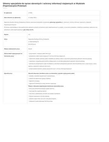 Główny specjalista do spraw obronnych i ochrony informacji niejawnych w Wydziale Organizacyjno-Prawnym 2016-02-11 Nr ogłoszenia 177693 Data ukazania się ogłoszenia 11 lutego 2016 r. Regionalny Dyrektor Ochrony Środowiska w Poznaniu poszukuje kandydatów na stanowisko głównego specjalisty ds. obronnych i ochrony informacji niejawnych w Wydziale Organizacyjno-Prawnym. W miesiącu poprzedzającym datę upublicznienia ogłoszenia wskaźnik zatrudnienia osób niepełnosprawnych w urzędzie, w rozumieniu przepisów o rehabilitacji zawodowej i społecznej oraz zatrudnianiu osób niepełnosprawnych, jest niższy niż 6%. Wymiar 0,2 Adres Regionalna Dyrekcja Ochrony Środowiska ul. Dąbrowskiego 79 60-529 Poznań Miejsce wykonywania pracy Poznań Zakres zadań wykonywanych na • przyjmowanie i realizacja zadań obronnych, stanowisku pracy • prowadzenie całości spraw związanych z ochroną informacji niejawnych, • zapewnienie obsady kadrowej urzędu niezbędnej do realizacji zadań w warunkach podwyższania gotowości obronnej państwa, • organizacja i przygotowywanie systemu stałego dyżuru na potrzeby podwyższania gotowości obronnej państwa, • planistyczne przygotowanie urzędu do działania w warunkach podwyższania gotowości obronnej państwa oraz w czasie kryzysu i wojny zgodnie z nałożonymi zadaniami obronnymi, • przeprowadzanie szkoleń z zakresu spraw obronnych i ochrony informacji niejawnych. Warunki pracy Warunki dotyczące charakteru pracy na stanowisku i sposobu wykonywania zadań • kontakty z klientami zewnętrznymi i wewnętrznymi, • krajowe lub zagraniczne wyjazdy służbowe, • zagrożenie korupcją, • zagrożenie kradzieżą lub utratą materiału niejawnego Miejsce i otoczenie organizacyjno-techniczne stanowiska pracy • praca przy komputerze powyżej 4 godzin dziennie, • brak toalet dla niepełnosprawnych, • brak drzwi o odpowiedniej szerokości dla wózków inwalidzkich, • budynek wyposażony w windę osobową, • siedziba urzędu mieści się na XII i XIII piętrze budynku, • dostępność światła dziennego oraz sztucznego. Wymagania związane ze stanowiskiem niezbędne pracy wykształcenie: wyższe doświadczenie zawodowe/staż pracy: 3 lata doświadczenia zawodowego w pracy związanej z ochroną informacji niejawnych, pozostałe wymagania niezbędne: • 5 lat doświadczenia zawodowego w pracy z zakresu spraw obronnych lub zarządzania kryzysowego, • przeszkolenie w zakresie ochrony informacji niejawnych przeprowadzone przez ABW lub SKW, dające uprawnienia do pełnienia funkcji Pełnomocnika ds. ochrony informacji niejawnych i posiadanie odpowiedniego poświadczenia bezpieczeństwa wydanego przez ABW lub SKW, • znajomość przepisów ustawy o powszechnym obowiązku obrony Rzeczypospolitej Polskiej wraz z aktami wykonawczymi, • znajomość przepisów ustawy o ochronie informacji niejawnych wraz z aktami wykonawczymi, • umiejętność pracy samodzielnej i w zespole, • komunikatywność, • zdolność analitycznego myślenia, • umiejętność trafnej oceny sytuacji, wiązania faktów i wyciągania wniosków, • umiejętność obsługi komputera (Windows, MS Office) wymagania dodatkowe • ukończony kurs kierowników lub pracowników kancelarii tajnej, • specjalistyczne szkolenie dla inspektorów bezpieczeństwa teleinformatycznego przeprowadzone przez ABW lub SKW, • umiejętność prowadzenia szkoleń, • asertywność,odpowiedzialność oraz kreatywność w działaniu, • 1 rok doświadczenia zawodowego w administracji rządowej. Wymagane dokumenty i oświadczenia • życiorys i list motywacyjny, • oświadczenie o wyrażeniu zgody na przetwarzanie danych osobowych do celów rekrutacji, • oświadczenie o korzystaniu z pełni praw publicznych, • oświadczenie o nieskazaniu prawomocnym wyrokiem za umyślne przestępstwo lub umyślne przestępstwo skarbowe, • kopie dokumentów potwierdzających wykształcenie, • kopia dokumentu potwierdzającego posiadanie polskiego obywatelstwa lub oświadczenie o posiadaniu obywatelstwa polskiego, • kopia poświadczenia bezpieczeństwa uprawniającego do dostępu do informacji niejawnych oznaczonych klauzulą "poufne" lub oświadczenie o wyrażeniu zgody na przeprowadzenie postępowania sprawdzającego zgodnie z ustawą z dnia 5 sierpnia 2010 r. o ochronie informacji niejawnych (Dz. U. Nr 182, poz. 1228 ze zm.), • kopie dokumentów potwierdzających doświadczenie zawodowe, • zaświadczenie potwierdzające odbycie przeszkolenia w zakresie ochrony informacji niejawnych dające uprawnienia do pełnienia funkcji Pełnomocnika ds. ochrony informacji niejawnych Inne dokumenty i oświadczenia • kopia dokumentu potwierdzającego niepełnosprawność - w przypadku kandydatek/kandydatów, zamierzających skorzystać z pierwszeństwa w zatrudnieniu w przypadku, gdy znajdą się w gronie najlepszych kandydatek/kandydatów Termin składania dokumentów 22 lutego 2016 r. Miejsce składania dokumentów Regionalna Dyrekcja Ochrony Środowiska ul. Dąbrowskiego 79 60-529 Poznań Inne informacje Na kopercie prosimy podać nr ogłoszenia. Oferty niespełniające wymagań formalnych oraz złożone po terminie nie będą rozpatrywane i zostaną komisyjnie zniszczone. Kandydaci zakwalifikowani do dalszych etapów rekrutacji zostaną powiadomieni telefonicznie bądź drogą elektroniczną. W przypadku dużej liczby kandydatów spełniających wymagania formalne komisja dokonuje analizy merytorycznej dokumentów aplikacyjnych i w wyniku preselekcji wyłania kandydatów najbardziej odpowiadających wymaganiom określonym dla danego stanowiska pracy, do kolejnych etapów naboru. Do udziału w naborze zachęcamy również osoby niepełnosprawne. Prosimy o składanie dokumentów w języku polskim. Nasz urząd jest pracodawcą równych szans i wszystkie aplikacje są rozważane z równą uwagą bez względu na płeć, wiek, niepełnosprawność, rasę, narodowość, przekonania politycz