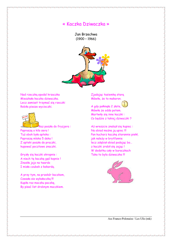 « Kaczka Dziwaczka » Jan Brzechwa (1900 – 1966) Nad rzeczką opodal krzaczka Mieszkała kaczka dziwaczka. Lecz zamiast trzymać się rzeczki Robiła piesze wycieczki. Raz poszła do fryzjera : Poproszę o kilo sera ! Tuż obok była apteka : Poproszę mleka 5 deka ! Z apteki poszła do praczki, kupować pocztowe znaczki. Gryzły się kaczki okropnie : A niech tę kaczkę gęś kopnie ! Znosiła jajo na twardo I miała czubek z kokardą. Zjadając tasiemkę starą Mówiła, że to makaron. A gdy połknęła 2 złote, Mówiła że odda potem. Martwiły się inne kaczki : Co będzie z takiej dziwaczki ? Aż wreszcie znalazł się kupiec : Na obiad można ją upiec !!! Pan kucharz kaczkę starannie piekł, jak należy w brytfannie lecz zdębiał obiad podając bo… z kaczki zrobił się zając ! W dodatku cały w buraczkach Taka to byla dziwaczka !!! A przy tym, na przekór kaczkom, Czesała sie wykałaczką !!! Kupiła raz maczku paczkę, By pisać list drobnym maczkiem. Ass Franco-Polonaise / Les Ulis (mk)