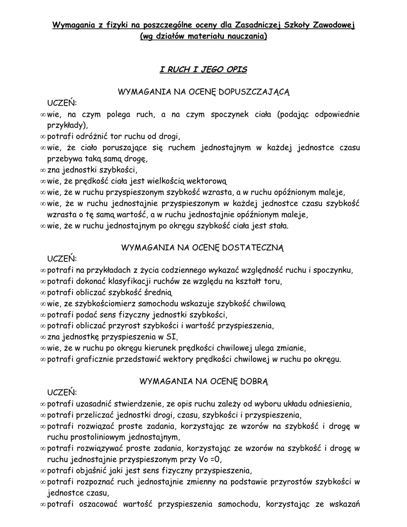 Wymagania z fizyki na poszczególne oceny dla Zasadniczej Szkoły Zawodowej (wg działów materiału nauczania) I RUCH I JEGO OPIS WYMAGANIA NA OCENĘ DOPUSZCZAJĄCĄ • • • • • • • • UCZEŃ: wie, na czym polega ruch, a na czym spoczynek ciała (podając odpowiednie przykłady), potrafi odróżnić tor ruchu od drogi, wie, że ciało poruszające się ruchem jednostajnym w każdej jednostce czasu przebywa taką samą drogę, zna jednostki szybkości, wie, że prędkość ciała jest wielkością wektorową wie, że w ruchu przyspieszonym szybkość wzrasta, a w ruchu opóźnionym maleje, wie, że w ruchu jednostajnie przyspieszonym w każdej jednostce czasu szybkość wzrasta o tę samą wartość, a w ruchu jednostajnie opóźnionym maleje, wie, że w ruchu jednostajnym po okręgu szybkość ciała jest stała. WYMAGANIA NA OCENĘ DOSTATECZNĄ • • • • • • • • • UCZEŃ: potrafi na przykładach z życia codziennego wykazać względność ruchu i spoczynku, potrafi dokonać klasyfikacji ruchów ze względu na kształt toru, potrafi obliczać szybkość średnią wie, ze szybkościomierz samochodu wskazuje szybkość chwilową potrafi podać sens fizyczny jednostki szybkości, potrafi obliczać przyrost szybkości i wartość przyspieszenia, zna jednostkę przyspieszenia w SI, wie, że w ruchu po okręgu kierunek prędkości chwilowej ulega zmianie, potrafi graficznie przedstawić wektory prędkości chwilowej w ruchu po okręgu. WYMAGANIA NA OCENĘ DOBRĄ • • • • • • • UCZEŃ: potrafi uzasadnić stwierdzenie, ze opis ruchu zależy od wyboru układu odniesienia, potrafi przeliczać jednostki drogi, czasu, szybkości i przyspieszenia, potrafi rozwiązać proste zadania, korzystając ze wzorów na szybkość i drogę w ruchu prostoliniowym jednostajnym, potrafi rozwiązywać proste zadania, korzystając ze wzorów na szybkość i drogę w ruchu jednostajnie przyspieszonym przy Vo =0, potrafi objaśnić jaki jest sens fizyczny przyspieszenia, potrafi rozpoznać ruch jednostajnie zmienny na podstawie przyrostów szybkości w jednostce czasu, potrafi oszacować wartość przyspieszenia samochodu, korzystając ze wskazań szybkościomierza. WYMAGANIA NA OCENĘ BARDZO DOBRĄ • • • • • UCZEŃ: potrafi wyjaśnić co to są wielkości wprost proporcjonalne w odniesieniu do: drogi i czasu w ruchu prostoliniowym jednostajnym, drogi i kwadratu czasu w ruchu prostoliniowym jednostajnie przyspieszonym, potrafi sporządzić wykresy v (t) oraz s (t) w ruchu prostoliniowym jednostajnym i jednostajnie przyspieszonym, potrafi na podstawie wykresu s (t) obliczyć szybkość, potrafi rozwiązywać złożone zadania z ruchu prostoliniowego jednostajnego i jednostajnie przyspieszonego, potrafi przygotować (pod kierunkiem nauczyciela) projekt na zadany temat, korzystając z rożnych źródeł informacji (w tym z Internetu). II ODDZIAŁYWANIA W PRZYRODZIE WYMAGANIA NA OCENĘ DOPUSZCZAJĄCĄ • • • • • • • • • • • • • • • • • • • UCZEŃ: potrafi podać przykłady oddziaływań, potrafi poprawnie używać pojęcia siły do opisu oddziaływań, wie, że jednostką siły w SI jest niuton, potrafi dokonać pomiaru siły za pomocą siłomierza, wie, że Ziemia przyciąga wszystkie ciała, wie, że wszystkie ciała wzajemnie przyciągają się siłami grawitacjii, zna nazwy planet Układu Słonecznego, wie, że atomy są zbudowane z jądra i elektronów, wie, że istnieją dwa rodzaje ładunków elektrycznych, rozumie co to znaczy naelektryzować ciało, umie opisać oddziaływania ciał naelektryzowanych, wie, że jednostką ładunku w SI jest 1 kulomb, wie, że każdy magnes posiada dwa bieguny, umie opisać oddziaływanie dwóch biegunów magnetycznych, wie, że prąd elektryczny w metalu to uporządkowany ruch elektronów swobodnych, wie, że jednostką natężenia prądu jest 1 amper, a napięcia 1 wolt, wie, że przewodnik z prądem oddziałuje na igłę magnetyczną wie, że jądro atomowe zbudowane jest z protonów i neutronów, wie, że między nukleonami w jądrze występują siły przyciągania. WYMAGANIA NA OCENĘ DOSTATECZNĄ • • • • • • • • • • • • • • • • • • • • UCZEŃ: potrafi podać przykłady oddziaływań bezpośrednich i na odległość, potrafi dokonać podziału oddziaływań na odległość (grawitacyjne, elektrostatyczne, magnetyczne), rozumie, że siła jest wielkością wektorową i potrafi ją przedstawić graficznie, potrafi rozpoznać statyczne i dynamiczne skutki oddziaływań, potrafi wyjaśnić pojęcie siły wypadkowej, wie jak na podstawie zasad dynamiki uzasadnić, że o spoczynku lub rodzaju ruchu decyduje siła wypadkowa, rozumie związek występujący między wielkościami w równaniu F = m· G, potrafi podać przykłady potwierdzające słuszność pierwszej i drugiej zasady dynamiki, wie, jaka siła spełnia rolę siły dośrodkowej dla planet w Układzie Słonecznym, potrafi objaśnić co to znaczy, że ciało jest naelektryzowane dodatnio lub ujemnie, rozumie, że podczas elektryzowania ciał przemieszczają się jedynie elektrony, wie od czego zależy wartość siły oddziaływania naelektryzowanych ciał kulistych, potrafi objaśnić pojęcie elektronu swobodnego, potrafi wyjaśnić zachowanie się igły magnetycznej na powierzchni Ziemi, potrafi podać przykłady ciał, które można namagnesować, rozumie, że warunkiem koniecznym przepływu prądu przez przewodnik jest przyłożenie do jego końców napięcia, potrafi podać przykłady różnych źródeł napięcia, potrafi za pomocą igły magnetycznej badać oddziaływania magnetyczne magnesów i przewodnika z prądem, wie, w jaki sposób można zwiększyć oddziaływanie magnetyczne przewodnika z prądem, potrafi uzasadnić stwierdzenie, ze w obrębie jądra atomowego siły jądrowe są większe od sił elektrostatycznych odpychania protonów. WYMAGANIA NA OCENĘ DOBRĄ • • • • • 