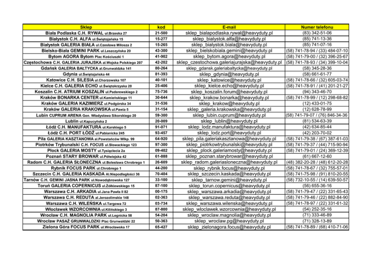 Sklep Biała Podlaska C.H. RYWAL ul.Brzeska 27 Białystok C.H. ALFA ul.Świętojańska 15 Białystok GALERIA BIAŁA ul.Czesława Miłosza 2 Bielsko-Biała GEMINI PARK ul.Leszczyńska 20 Bytom AGORA Bytom Plac Kościuszki 1 Częstochowa C.H. GALERIA JURAJSKA al.Wojska Polskiego 207 Gdańsk GALERIA BAŁTYCKA al.Grunwaldzka 141 Gdynia ul.Świętojańska 44 Katowice C.H. SILESIA ul.Chorzowska 107 Kielce C.H. GALERIA ECHO ul.Świętokrzyska 20 Koszalin C.H. ATRIUM KOSZALIN ul.Paderewskiego 2 Kraków BONARKA CENTER ul.Kamieńskiego 11 Kraków GALERIA KAZIMIERZ ul.Podgórska 34 Kraków GALERIA KRAKOWSKA ul.Pawia 5 Lubin CUPRUM ARENA Gen. Władysława Sikorskiego 20 Lublin ul.Kapucyńska 2 Łódź C.H. MANUFAKTURA ul.Karskiego 5 Łódź C.H. PORT ŁÓDŹ ul.Pabianicka 245 Piła GALERIA KASZTANOWA al.Powstańców Wlkp. 99 Piotrków Trybunalski C.H. FOCUS ul.Słowackiego 123 Płock GALERIA MOSTY ul.Tysiąclecia 2a Poznań STARY BROWAR ul.Półwiejska 42 Radom C.H. GALERIA SŁONECZNA ul.Bolesława Chrobrego 1 Rybnik FOCUS PARK ul.Chrobrego 1 Szczecin C.H. GALERIA KASKADA Al.Niepodległości 36 Tarnów C.H. GEMINI JASNA PARK ul.Nowodąbrowska 127 Toruń GALERIA COPERNICUS ul.Żółkiewskiego 15 Warszawa C.H. ARKADIA ul.Jana Pawła II 82 Warszawa C.H. REDUTA al.Jerozolimskie 148 Warszawa C.H. WILEŃSKA ul.Targowa 72 Włocławek WZORCOWNIA ul.Kilińskiego 3 Wrocław C.H. MAGNOLIA PARK ul.Legnicka 58 Wrocław PASAŻ GRUNWALDZKI Plac Grunwaldzki 22 Zielona Góra FOCUS PARK ul.Wrocławska 17 kod 21-500 15-277 15-265 43-300 41-902 42-202 80-264 81-393 40-101 25-406 75-736 30-644 31-536 31-154 59-300 20-009 91-071 93-457 64-920 97-300 09-402 61-888 26-609 44-200 70-404 33-100 87-100 00-175 02-363 03-734 87-800 54-204 50-363 65-427 E-mail Numer telefonu (83) 342-51-06 [email protected] (85) 741-13-36 [email protected] (85) 741-07-16 [email protected] (58) 741-78-94 / (33) 484-07-10 [email protected] (58) 741-79-00 / (32) 396-25-67 [email protected] [email protected] (58) 741-78-93 / (34) 399-10-04 [email protected] [email protected] [email protected] [email protected] [email protected] [email protected] [email protected] [email protected] [email protected] [email protected] [email protected] [email protected] [email protected] [email protected] [email protected] [email protected] [email protected] [email protected] [email protected] [email protected] [email protected] [email protected] [email protected] [email protected] [email protected] [email protected] [email protected] [email protected] (58) 345-28-36 (58) 661-61-77 (58) 741-78-66 / (32) 605-03-74 (58) 741-78-91 / (41) 201-21-27 (94) 343-46-70 (58) 741-78-99 / (12) 298-68-82 (12) 433-01-75 (12) 628-78-99 (58) 741-79-07 / (76) 846-34-36 (81) 534-63-39 (42) 634-85-44 (42) 203-70-02 (58) 741-79-38 / (67) 387-61-03 (58) 741-79-37 / (44) 715-90-94 (58) 741-79-01 / (24) 369-12-39 (61) 667-12-60 (48) 382-20-28 / (48) 612-20-28 (58) 741-78-67 / (32) 755-57-01 (58) 741-75-98 / (91) 810-20-55 (58) 732-10-55 / (14) 639-50-57 (56) 655-36-16 (58) 741-79-47 / (22) 331-65-43 (58) 741-79-46 / (22) 882-84-90 (58) 741-78-97 / (22) 331-61-32 (54) 252-35-16 (71) 333-46-89 (71) 328-13-89 (58) 741-78-89 / (68) 410-71-06
