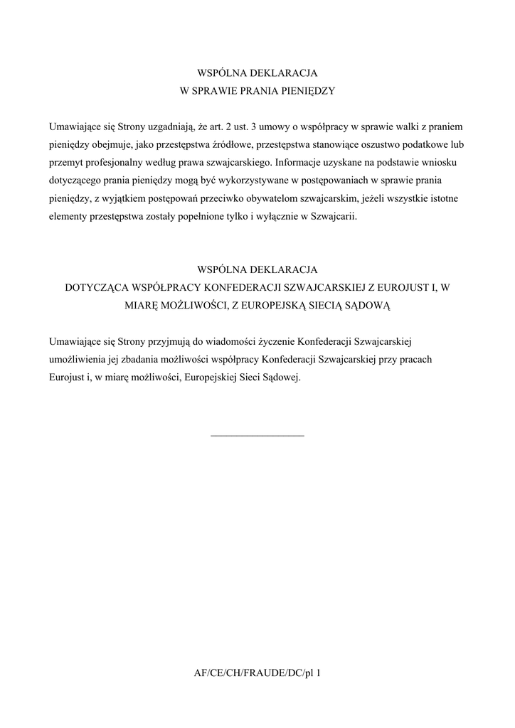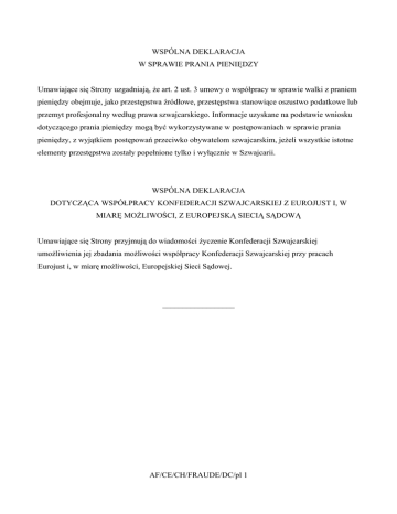 WSPÓLNA DEKLARACJA W SPRAWIE PRANIA PIENIĘDZY Umawiające się Strony uzgadniają, że art. 2 ust. 3 umowy o współpracy w sprawie walki z praniem pieniędzy obejmuje, jako przestępstwa źródłowe, przestępstwa stanowiące oszustwo podatkowe lub przemyt profesjonalny według prawa szwajcarskiego. Informacje uzyskane na podstawie wniosku dotyczącego prania pieniędzy mogą być wykorzystywane w postępowaniach w sprawie prania pieniędzy, z wyjątkiem postępowań przeciwko obywatelom szwajcarskim, jeżeli wszystkie istotne elementy przestępstwa zostały popełnione tylko i wyłącznie w Szwajcarii. WSPÓLNA DEKLARACJA DOTYCZĄCA WSPÓŁPRACY KONFEDERACJI SZWAJCARSKIEJ Z EUROJUST I, W MIARĘ MOŻLIWOŚCI, Z EUROPEJSKĄ SIECIĄ SĄDOWĄ Umawiające się Strony przyjmują do wiadomości życzenie Konfederacji Szwajcarskiej umożliwienia jej zbadania możliwości współpracy Konfederacji Szwajcarskiej przy pracach Eurojust i, w miarę możliwości, Europejskiej Sieci Sądowej. __________________ AF/CE/CH/FRAUDE/DC/pl 1 UZGODNIONY PROTOKÓŁ NEGOCJACJI W SPRAWIE UMOWY O WSPÓŁPRACY MIĘDZY WSPÓLNOTĄ EUROPEJSKĄ I JEJ PAŃSTWAMI CZŁONKOWSKIMI, Z JEDNEJ STRONY, A KONFEDERACJĄ SZWAJCARSKĄ, Z DRUGIEJ STRONY, W SPRAWIE PRZECIWDZIAŁANIA NADUŻYCIOM FINANSOWYCH I WSZELKIM INNYM NIELEGALNYM DZIAŁANIOM NARUSZAJĄCYM ICH INTERESY FINANSOWE AF/CE/CH/FRAUDE/PV/pl 1 Umawiające się Strony postanowiły, co następuje: Ad artykuł 2 ustęp 1 litera a) termin „nadużycia finansowe i wszelkie inne nielegalne działania” obejmują również przemyt, korupcję oraz pranie pieniędzy stanowiących dochód z działań objętych niniejszą Umową, z zastrzeżeniem art. 2 ust. 3; termin „obrót towarami z naruszeniem ustawodawstwa celnego i rolnego” rozumiane są niezależnie od przewozu (miejsca pochodzenia, miejsca przeznaczenia lub tranzytu) lub nie towaru przez terytorium innej Umawiającej się Strony; termin „obrót z naruszeniem ustawodawstwa podatkowego w kwestii podatku od wartości dodanej, specjalnych podatków konsumpcyjnych i akcyzy” rozumiane są niezależnie od przewozu (miejsca pochodzenia, miejsca przeznaczenia lub tranzytu) lub nie towarów bądź usług przez terytorium innej Umawiającej się Strony; Ad artykuł 15 ustęp 2 termin „środki dochodzeniowe” obejmuje przesłuchania osób, kontrole i rewizje w lokalach i środkach transportu, kopiowanie dokumentów, zbieranie informacji i zajmowanie przedmiotów, dokumentów oraz przedmiotów wartościowych; AF/CE/CH/FRAUDE/PV/pl 2 Ad artykuł 16 ustęp 2 akapit 2 niniejszy akapit przewiduje również w szczególności, że osobom obecnym można zezwolić na zadawanie pytań i na proponowanie czynności dochodzeniowych; Ad artykuł 25 ustęp 2 Pojęcie umów wielostronnych pomiędzy Umawiającymi się Stronami obejmuje również, w szczególności, od chwili jej wejścia w życie, Umowę między Unią Europejską, Wspólnotą Europejską a Konfederacją Szwajcarską dotyczącą włączenia tego państwa we wprowadzanie w życie, stosowanie i rozwój dorobku Schengen; Ad artykuł 35 ustęp 1 przez „wniosek o wzajemną pomoc sądową” rozumie się również przekazywanie informacji i dowodów władzom wzywającej Umawiającej się Strony; Ad artykuł 43 Komisja Europejska ogłosi, najdalej w chwili podpisania Umowy, orientacyjny wykaz terytoriów, do których stosuje się niniejszą Umowę. ____________________ AF/CE/CH/FRAUDE/PV/pl 3