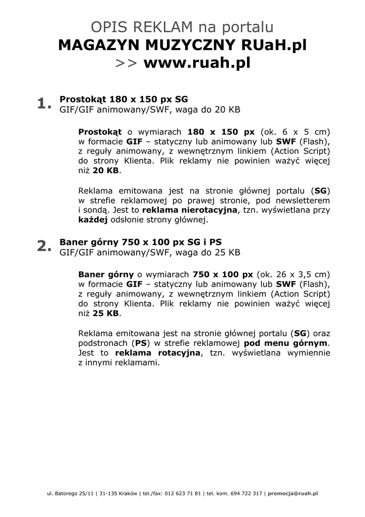 OPIS REKLAM na portalu MAGAZYN MUZYCZNY RUaH.pl >> www.ruah.pl 1. Prostokąt 180 x 150 px SG GIF/GIF animowany/SWF, waga do 20 KB Prostokąt o wymiarach 180 x 150 px (ok. 6 x 5 cm) w formacie GIF – statyczny lub animowany lub SWF (Flash), z reguły animowany, z wewnętrznym linkiem (Action Script) do strony Klienta. Plik reklamy nie powinien ważyć więcej niż 20 KB. Reklama emitowana jest na stronie głównej portalu (SG) w strefie reklamowej po prawej stronie, pod newsletterem i sondą. Jest to reklama nierotacyjna, tzn. wyświetlana przy każdej odsłonie strony głównej. 2. Baner górny 750 x 100 px SG i PS GIF/GIF animowany/SWF, waga do 25 KB Baner górny o wymiarach 750 x 100 px (ok. 26 x 3,5 cm) w formacie GIF – statyczny lub animowany lub SWF (Flash), z reguły animowany, z wewnętrznym linkiem (Action Script) do strony Klienta. Plik reklamy nie powinien ważyć więcej niż 25 KB. Reklama emitowana jest na stronie głównej portalu (SG) oraz podstronach (PS) w strefie reklamowej pod menu górnym. Jest to reklama rotacyjna, tzn. wyświetlana wymiennie z innymi reklamami. ul. Batorego 25/11 | 31-135 Kraków | tel./fax: 012 623 71 81 | tel. kom. 694 722 317 | [email protected]