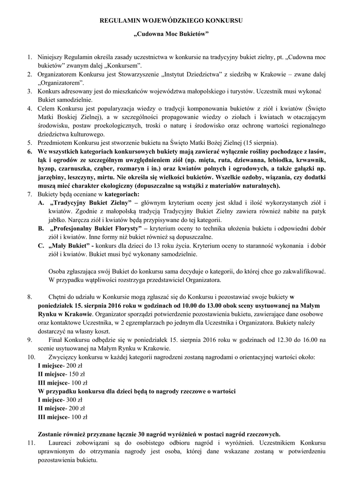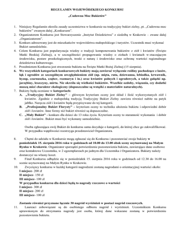 REGULAMIN WOJEWÓDZKIEGO KONKURSU „Cudowna Moc Bukietów” 1. Niniejszy Regulamin określa zasady uczestnictwa w konkursie na tradycyjny bukiet zielny, pt. „Cudowna moc bukietów” zwanym dalej „Konkursem”. 2. Organizatorem Konkursu jest Stowarzyszenie „Instytut Dziedzictwa” z siedzibą w Krakowie – zwane dalej „Organizatorem”. 3. Konkurs adresowany jest do mieszkańców województwa małopolskiego i turystów. Uczestnik musi wykonać Bukiet samodzielnie. 4. Celem Konkursu jest popularyzacja wiedzy o tradycji komponowania bukietów z ziół i kwiatów (Święto Matki Boskiej Zielnej), a w szczególności propagowanie wiedzy o ziołach i kwiatach w otaczającym środowisku, postaw proekologicznych, troski o naturę i środowisko oraz ochronę wartości regionalnego dziedzictwa kulturowego. 5. Przedmiotem Konkursu jest stworzenie bukietu na Święto Matki Bożej Zielnej (15 sierpnia). 6. We wszystkich kategoriach konkursowych bukiety mają zawierać wyłącznie rośliny pochodzące z lasów, łąk i ogrodów ze szczególnym uwzględnieniem ziół (np. mięta, ruta, dziewanna, lebiodka, krwawnik, hyzop, czarnuszka, cząber, rozmaryn i in.) oraz kwiatów polnych i ogrodowych, a także gałązki np. jarzębiny, leszczyny, mirtu. Nie określa się wielkości bukietów. Wszelkie ozdoby, wiązania, czy dodatki muszą mieć charakter ekologiczny (dopuszczalne są wstążki z materiałów naturalnych). 7. Bukiety będą oceniane w kategoriach: A. „Tradycyjny Bukiet Zielny” – głównym kryterium oceny jest skład i ilość wykorzystanych ziół i kwiatów. Zgodnie z małopolską tradycją Tradycyjny Bukiet Zielny zawiera również nabite na patyk jabłko. Naręcza ziół i kwiatów będą przypisywane do tej kategorii. B. „Profesjonalny Bukiet Florysty” – kryterium oceny to technika ułożenia bukietu i odpowiedni dobór ziół i kwiatów. Inne formy niż bukiet również są dopuszczalne. C. „Mały Bukiet” - konkurs dla dzieci do 13 roku życia. Kryterium oceny to staranność wykonania i dobór ziół i kwiatów. Bukiet musi być wykonany samodzielnie. Osoba zgłaszająca swój Bukiet do konkursu sama decyduje o kategorii, do której chce go zakwalifikować. W przypadku wątpliwości rozstrzyga przedstawiciel Organizatora. Chętni do udziału w Konkursie mogą zgłaszać się do Konkursu i pozostawiać swoje bukiety w poniedziałek 15. sierpnia 2016 roku w godzinach od 10.00 do 13.00 obok sceny usytuowanej na Małym Rynku w Krakowie. Organizator sporządzi potwierdzenie pozostawienia bukietu, zawierające dane osobowe oraz kontaktowe Uczestnika, w 2 egzemplarzach po jednym dla Uczestnika i Organizatora. Bukiety należy dostarczyć na własny koszt. 9. Finał Konkursu odbędzie się w poniedziałek 15. sierpnia 2016 roku w godzinach od 12.30 do 16.00 na scenie usytuowanej na Małym Rynku w Krakowie. 10. Zwycięzcy konkursu w każdej kategorii nagrodzeni zostaną nagrodami o orientacyjnej wartości około: I miejsce- 200 zł II miejsce- 150 zł III miejsce- 100 zł W przypadku konkursu dla dzieci będą to nagrody rzeczowe o wartości I miejsce- 300 zł II miejsce- 200 zł III miejsce- 100 zł 8. 11. Zostanie również przyznane łącznie 30 nagród wyróżnień w postaci nagród rzeczowych. Laureaci zobowiązani są do osobistego odbioru nagród i wyróżnień. Uczestnikiem Konkursu uprawnionym do otrzymania nagrody jest osoba, której dane wskazane zostaną w potwierdzeniu pozostawienia bukietu. 12. 13. 14. 15. 16. 17. 18. 19. 20. 21. 22. Laureaci pierwszych miejsc zostaną zaproszeni przez Czesława Siekierskiego – Posła do Parlamentu Europejskiego na wyjazd edukacyjny do Brukseli. Laureaci otrzymają zaproszenia na wyjazd dla 2 osób (w tym przynajmniej jedna osoba pełnoletnia). Nie dotyczy kategorii „Mały” Bukiet – Konkurs dla dzieci. Do wyłonienia laureatów i przyznania nagród uprawnione będzie Jury Konkursu powołane przez Organizatora. Wyniki zostaną ogłoszone w poniedziałek 15. sierpnia 2016 roku w miejscu odbywania się Konkursu w Krakowie oraz opublikowane w dniu 17. sierpnia na stronie www.instytutdziedzictwa.pl oraz na stronie cudownamocbukietow.pl Od decyzji jury nie przysługuje jakiekolwiek odwołanie. Jury nie będzie publikować lub udostępniać w jakiejkolwiek formie sprawozdania ze swojej działalności ani pisemnie uzasadniać swoich decyzji. Pytania dotyczące Konkursu należy przesyłać pocztą elektroniczną na adres: [email protected]. Organizator zastrzega sobie możliwość zmiany niniejszego Regulaminu. Informacje o wprowadzonych zmianach będą publikowane na stronie internetowej www.instytutdziedzictwa.pl. Zmiany wchodzą w życie z dniem publikacji. W sprawach nieuregulowanych w niniejszym Regulaminie rozstrzyga Organizator. Organizator zastrzega sobie prawo do odwołania Konkursu w przypadku wystąpienia okoliczności od niego niezależnych. Każdy z Uczestników wyraża zgodę na zbieranie i przetwarzanie podanych przez niego danych osobowych, przez Organizatora, w celach promocyjno-marketingowych związanych z organizacją Konkursu, zgodnie z Ustawą z dnia 29 sierpnia 1997r. o ochronie danych osobowych. Z chwilą otrzymania przez Uczestnika potwierdzenia pozostawienia bukietu wraz z numerem przyjęcia, na Organizatora przechodzą nieodpłatnie autorskie prawa majątkowe do złożonych na konkurs prac w zakresie publicznego udostępniania dzieła, jak również prawa pokrewne z zastrzeżeniem obowiązku ujawnienia nazwiska Autora. Przeniesienie autorskich praw majątkowych do utworu powoduje przeniesienie na Organizatora własności oryginału dzieła zgłoszonego do Konkursu. Organizator zastrzega sobie prawo zatrzymania bukietów nagrodzonych nagrodami głównymi (I-III miejsce), od czego może jednak odstąpić. Konkurs jest częścią projektu „Cudowna Moc Bukietów” realizowanego przez Stowarzyszenie Instytut Dziedzictwa i współfinansowanego przez: Województwo Małopolskie, Urząd Miasta Krakowa, W
