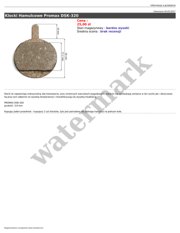 Informacje o produkcie Utworzono 04-03-2017 Klocki Hamulcowe Promax DSK-320 Cena : 25,00 zł er m ar k Stan magazynowy : bardzo wysoki Średnia ocena : brak recenzji Klocki te zapewniają maksymalną siłę hamowania, przy zmiennych warunkach pogodowych, idealnie się sprawdzają zarówno w dni suche jak i deszczowe. Są przy tym odporne na wysoką temperaturę i charakteryzują się wysoką trwałością. PROMAX DSK-320 grubość: 3,9 mm w at Kupując jeden przedmiot - kupujesz 2 szt klocków, tyle jest potrzebne dla jednego hamulca na jednym kole. Wygenerowano w programie www.oscGold.com