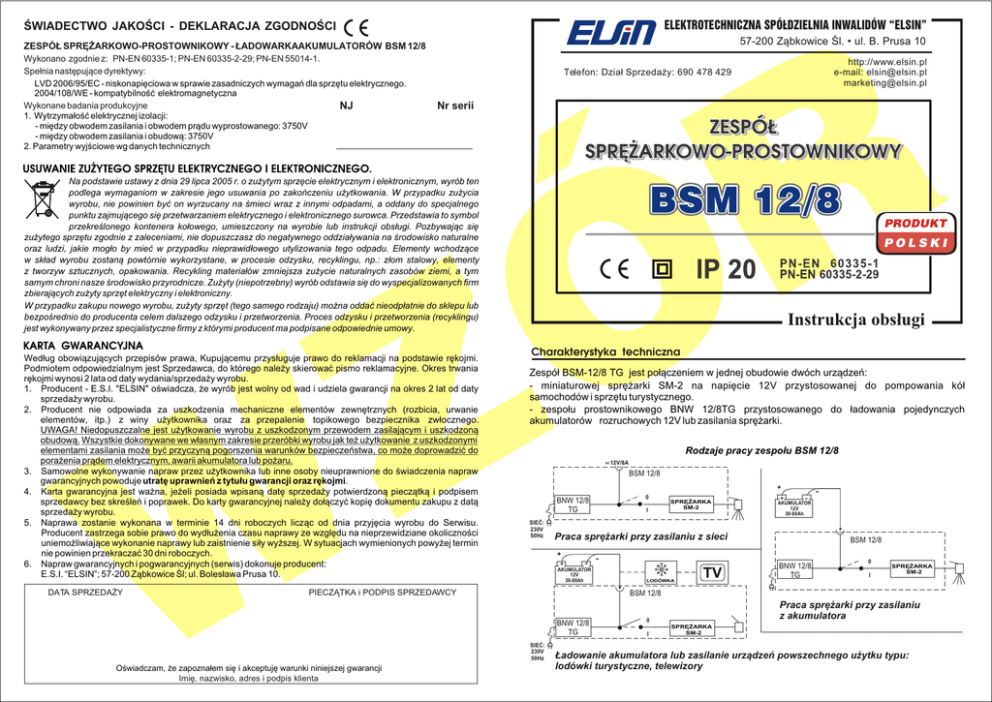 ELEKTROTECHNICZNA SPÓ£DZIELNIA INWALIDÓW “ELSIN” ŒWIADECTWO JAKOŒCI - DEKLARACJA ZGODNOŒCI 57-200 Z¹bkowice Œl. • ul. B. Prusa 10 ZESPÓ£ SPRʯARKOWO-PROSTOWNIKOWY - £ADOWARKAAKUMULATORÓW BSM 12/8 Wykonano zgodnie z: PN-EN 60335-1; PN-EN 60335-2-29; PN-EN 55014-1. Spe³nia nastêpuj¹ce dyrektywy: ! LVD 2006/95/EC - niskonapiêciowa w sprawie zasadniczych wymagañ dla sprzêtu elektrycznego. ! 2004/108/WE - kompatybilnoœæ elektromagnetyczna Wykonane badania produkcyjne NJ 1. Wytrzyma³oœæ elektrycznej izolacji: - miêdzy obwodem zasilania i obwodem pr¹du wyprostowanego: 3750V - miêdzy obwodem zasilania i obudow¹: 3750V 2. Parametry wyjœciowe wg danych technicznych http://www.elsin.pl e-mail: [email protected] [email protected] Telefon: Dzia³ Sprzeda¿y: 690 478 429 Nr serii ZESPÓ£ SPRʯARKOWO-PROSTOWNIKOWY Na podstawie ustawy z dnia 29 lipca 2005 r. o zu¿ytym sprzêcie elektrycznym i elektronicznym, wyrób ten podlega wymaganiom w zakresie jego usuwania po zakoñczeniu u¿ytkowania. W przypadku zu¿ycia wyrobu, nie powinien byæ on wyrzucany na œmieci wraz z innymi odpadami, a oddany do specjalnego punktu zajmuj¹cego siê przetwarzaniem elektrycznego i elektronicznego surowca. Przedstawia to symbol przekreœlonego kontenera ko³owego, umieszczony na wyrobie lub instrukcji obs³ugi. Pozbywaj¹c siê zu¿ytego sprzêtu zgodnie z zaleceniami, nie dopuszczasz do negatywnego oddzia³ywania na œrodowisko naturalne oraz ludzi, jakie mog³o by mieæ w przypadku nieprawid³owego utylizowania tego odpadu. Elementy wchodz¹ce w sk³ad wyrobu zostan¹ powtórnie wykorzystane, w procesie odzysku, recyklingu, np.: z³om stalowy, elementy z tworzyw sztucznych, opakowania. Recykling materia³ów zmniejsza zu¿ycie naturalnych zasobów ziemi, a tym samym chroni nasze œrodowisko przyrodnicze. Zu¿yty (niepotrzebny) wyrób odstawia siê do wyspecjalizowanych firm zbieraj¹cych zu¿yty sprzêt elektryczny i elektroniczny. W przypadku zakupu nowego wyrobu, zu¿yty sprzêt (tego samego rodzaju) mo¿na oddaæ nieodp³atnie do sklepu lub bezpoœrednio do producenta celem dalszego odzysku i przetworzenia. Proces odzysku i przetworzenia (recyklingu) jest wykonywany przez specjalistyczne firmy z którymi producent ma podpisane odpowiednie umowy. Wed³ug obowi¹zuj¹cych przepisów prawa, Kupuj¹cemu przys³uguje prawo do reklamacji na podstawie rêkojmi. Podmiotem odpowiedzialnym jest Sprzedawca, do którego nale¿y skierowaæ pismo reklamacyjne. Okres trwania rêkojmi wynosi 2 lata od daty wydania/sprzeda¿y wyrobu. 1. Producent - E.S.I. "ELSIN" oœwiadcza, ¿e wyrób jest wolny od wad i udziela gwarancji na okres 2 lat od daty sprzeda¿y wyrobu. 2. Producent nie odpowiada za uszkodzenia mechaniczne elementów zewnêtrznych (rozbicia, urwanie elementów, itp.) z winy u¿ytkownika oraz za przepalenie topikowego bezpiecznika zw³ocznego. UWAGA! Niedopuszczalne jest u¿ytkowanie wyrobu z uszkodzonym przewodem zasilaj¹cym i uszkodzon¹ obudow¹. Wszystkie dokonywane we w³asnym zakresie przeróbki wyrobu jak te¿ u¿ytkowanie z uszkodzonymi elementami zasilania mo¿e byæ przyczyn¹ pogorszenia warunków bezpieczeñstwa, co mo¿e doprowadziæ do pora¿enia pr¹dem elektrycznym, awarii akumulatora lub po¿aru. 3. Samowolne wykonywanie napraw przez u¿ytkownika lub inne osoby nieuprawnione do œwiadczenia napraw gwarancyjnych powoduje utratê uprawnieñ z tytu³u gwarancji oraz rêkojmi. 4. Karta gwarancyjna jest wa¿na, je¿eli posiada wpisan¹ datê sprzeda¿y potwierdzon¹ piecz¹tk¹ i podpisem sprzedawcy bez skreœleñ i poprawek. Do karty gwarancyjnej nale¿y do³¹czyæ kopiê dokumentu zakupu z dat¹ sprzeda¿y wyrobu. 5. Naprawa zostanie wykonana w terminie 14 dni roboczych licz¹c od dnia przyjêcia wyrobu do Serwisu. Producent zastrzega sobie prawo do wyd³u¿enia czasu naprawy ze wzglêdu na nieprzewidziane okolicznoœci uniemo¿liwiaj¹ce wykonanie naprawy lub zaistnienie si³y wy¿szej. W sytuacjach wymienionych powy¿ej termin nie powinien przekraczaæ 30 dni roboczych. 6. Napraw gwarancyjnych i pogwarancyjnych (serwis) dokonuje producent: E.S.I. “ELSIN”; 57-200 Z¹bkowice Œl; ul. Boles³awa Prusa 10. DATA SPRZEDA¯Y PRODUKT POLSKI Instrukcja obs³ugi Charakterystyka techniczna Zespó³ BSM-12/8 TG jest po³¹czeniem w jednej obudowie dwóch urz¹dzeñ: - miniaturowej sprê¿arki SM-2 na napiêcie 12V przystosowanej do pompowania kó³ samochodów i sprzêtu turystycznego. - zespo³u prostownikowego BNW 12/8TG przystosowanego do ³adowania pojedynczych akumulatorów rozruchowych 12V lub zasilania sprê¿arki. Rodzaje pracy zespo³u BSM 12/8 12V/8A BSM 12/8 + SIEÆ: 230V 50Hz I SPRʯARKA SM-2 + - AKUMULATOR 12V 30-80Ah Praca sprê¿arki przy zasilaniu z sieci + + - AKUMULATOR 12V 30-80Ah PIECZ¥TKA i PODPIS SPRZEDAWCY BSM 12/8 - LODÓWKA TV BNW 12/8 TG 0 I SPRʯARKA SM-2 BSM 12/8 BNW 12/8 TG SIEÆ: 230V 50Hz Oœwiadczam, ¿e zapozna³em siê i akceptujê warunki niniejszej gwarancji Imiê, nazwisko, adres i podpis klienta 0 BNW 12/8 TG Praca sprê¿arki przy zasilaniu z akumulatora 0 I SPRʯARKA SM-2 £adowanie akumulatora lub zasilanie urz¹dzeñ powszechnego u¿ytku typu: lodówki turystyczne, telewizory Zespó³ jest umieszczony w obudowie z tworzywa sztucznego (12) z rêkojeœci¹ w drugiej klasie ochronnoœci elektrycznej symbol , drugim stopniu ochrony przed dotkniêciem do czêœci niebezpiecznych oraz zerowym stopniem ochrony przed przedostaniem siê wody do wnêtrza (brak ochrony) - informuje symbol IP20. Zasilanie od sieci uzyskuje siê za pomoc¹ 1,5 m d³ugoœci przy³¹czeniowego przewodu sieciowego (13), sygnalizuje o tym dioda LED (8). Obwód zasilania od sieci jest zabezpieczony samoczynnym bezpiecznikiem termicznym, a obwód wyjœciowy zewnêtrznym bezpiecznikiem topikowym 8A (11). Akumulator do ³adowania mo¿e byæ przy³¹czony za pomoc¹ zespo³u przewodów (4) o d³ugoœci 4 m z wtykiem koncentrycznym (5) oraz zaciskami typu „krokodyl” (14) 