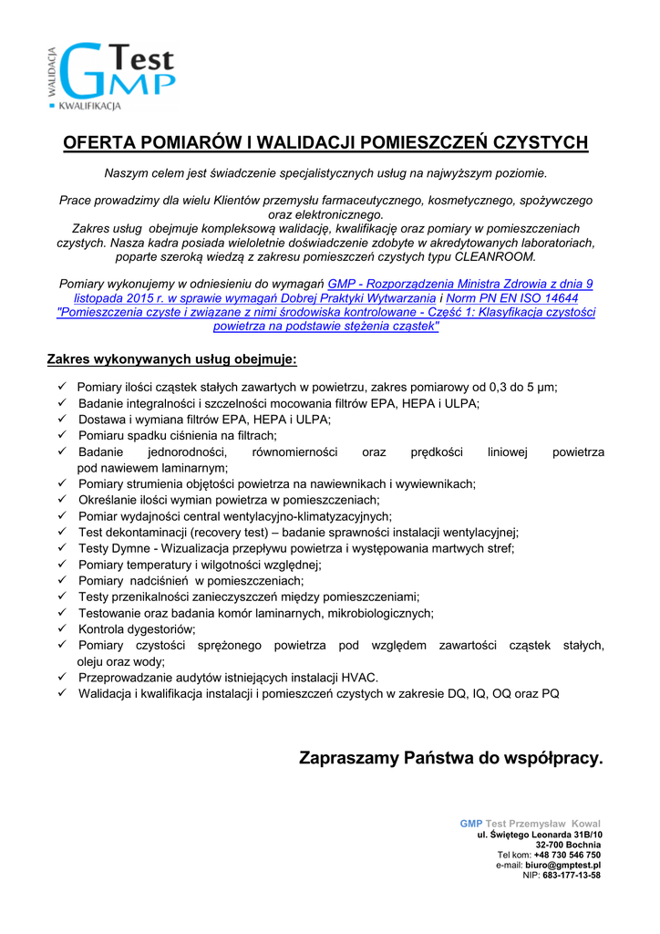 OFERTA POMIARÓW I WALIDACJI POMIESZCZEŃ CZYSTYCH Naszym celem jest świadczenie specjalistycznych usług na najwyższym poziomie. Prace prowadzimy dla wielu Klientów przemysłu farmaceutycznego, kosmetycznego, spożywczego oraz elektronicznego. Zakres usług obejmuje kompleksową walidację, kwalifikację oraz pomiary w pomieszczeniach czystych. Nasza kadra posiada wieloletnie doświadczenie zdobyte w akredytowanych laboratoriach, poparte szeroką wiedzą z zakresu pomieszczeń czystych typu CLEANROOM. Pomiary wykonujemy w odniesieniu do wymagań GMP - Rozporządzenia Ministra Zdrowia z dnia 9 listopada 2015 r. w sprawie wymagań Dobrej Praktyki Wytwarzania i Norm PN EN ISO 14644 "Pomieszczenia czyste i związane z nimi środowiska kontrolowane - Część 1: Klasyfikacja czystości powietrza na podstawie stężenia cząstek" Zakres wykonywanych usług obejmuje: Pomiary ilości cząstek stałych zawartych w powietrzu, zakres pomiarowy od 0,3 do 5 μm; Badanie integralności i szczelności mocowania filtrów EPA, HEPA i ULPA; Dostawa i wymiana filtrów EPA, HEPA i ULPA; Pomiaru spadku ciśnienia na filtrach; Badanie jednorodności, równomierności oraz prędkości liniowej powietrza pod nawiewem laminarnym; Pomiary strumienia objętości powietrza na nawiewnikach i wywiewnikach; Określanie ilości wymian powietrza w pomieszczeniach; Pomiar wydajności central wentylacyjno-klimatyzacyjnych; Test dekontaminacji (recovery test) – badanie sprawności instalacji wentylacyjnej; Testy Dymne - Wizualizacja przepływu powietrza i występowania martwych stref; Pomiary temperatury i wilgotności względnej; Pomiary nadciśnień w pomieszczeniach; Testy przenikalności zanieczyszczeń między pomieszczeniami; Testowanie oraz badania komór laminarnych, mikrobiologicznych; Kontrola dygestoriów; Pomiary czystości sprężonego powietrza pod względem zawartości cząstek stałych, oleju oraz wody; Przeprowadzanie audytów istniejących instalacji HVAC. Walidacja i kwalifikacja instalacji i pomieszczeń czystych w zakresie DQ, IQ, OQ oraz PQ Zapraszamy Państwa do współpracy. GMP Test Przemysław Kowal ul. Świętego Leonarda 31B/10 10 32-700 Bochnia Tel kom: +48 730 546 750 e-mail: [email protected] NIP: 683-177-13-58