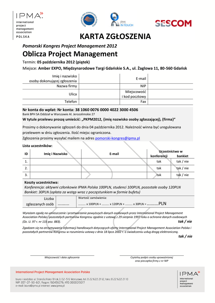 W tytule przelewu proszę umieścid: „PKPM2012, {imię nazwisko osoby zgłaszającej}, {firma}”