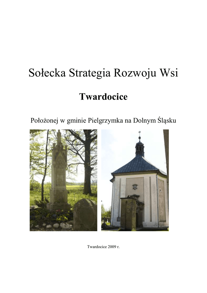 Sołecka Strategia Rozwoju Wsi Twardocice Położonej w gminie Pielgrzymka na Dolnym Śląsku Twardocice 2009 r. W opracowaniu dokumentu udział wzięli mieszkańcy wsi : 1. Antoni Kwakszys 2. Andrzej Dudek 3. Elżbieta Michałek 4. Krzysztof Terlecki 5. Krystyna Kostrzewa Warsztaty z cyklu “Planowanie w procesie odnowy wsi” przeprowadzili moderatorzy Regionalnego Programu “Odnowa Wsi w Województwie Dolnośląskim” – Łukasz Żuber oraz Gabriela Męczyńska. Spis treści: 1. Analiza zasobów wsi, cz. I. 2. Analiza zasobów wsi, cz. II. 3. Analiza zasobów wsi, cz. III. 4. SWOT – analiza mocnych i słabych stron oraz szans i zagrożeń wsi. 5. Analiza potencjału rozwojowego wsi. 6. Program krótkoterminowy odnowy wsi zaplanowany do osiągnięcia w pierwszym roku działań. 7. Plan i program odnowy wsi na lata 2009-2015 Urząd Marszałkowski Województwa Dolnośląskiego ANALIZA ZASOBÓW WSI Twardocice CZ I Rodzaj zasobu 1 Przyrodniczy -walory krajobrazu, rzeźby terenu -stan środowiska -walory klimatu -walory szaty roślinnej -cenne przyrodniczo obszary lub obiekty -świat zwierzęcy (ostoje, siedliska) -wody powierzchniowe (cieki, rzeki, stawy) - Wody podziemne - gleby Opis (nazwanie) zasobu jakim wieś dysponuje 2 Znaczenie zasobu (odpowiednio wstaw X) Wyró żMałe Duże niając e 3 Krajobraz pogórza Kaczawskiego, z malowniczym krajobrazem. Położona na szlaku Wygasłych Wulkanów, położona nad rzeką Gajowa Czyste środowisko, liczne miejsca rekreacyjne, możliwość aktywnego wypoczynku na łonie natury, pomniki przyrody (wiąz szypułkowy, aleja lipowa) Klimat łagodny ma charakter przejściowy, jest to klimat o średniej przewadze wpływów oceanicznych oraz ze słabym wpływem gór, dominują wiatry z kierunku zachodniego i północno-zachodniego, dość ciepłe lata i małe różnice temperatur w ciągu roku. 4 5 X X X Park podworski założony w połowie XIX wieku w stylu angielskim wpisany do rejestru zabytków, aleja lipowa, liczne pomniki przyrody, bogactwo roślinności zielnej, Szczególnie cennym zasobem przyrodniczym są rozciągające się na terenie wsi park podworski oraz pobliskie lasy i łąki. Czyste powietrze, duża powierzchnia lasów to idealne warunki dla żyjących tu zwierząt leśnych Przez miejscowość płynie rzeka Gajowa Występują źródła wód naturalnych, studnie przydomowe oraz podziemny zbiornik wodny . Duży procent ziem uprawnych, szczególnie VI i III klasy. X X X X X Urząd Marszałkowski Województwa Dolnośląskiego -kopaliny - walory geotechniczne Kulturowy -walory architektury - walory przestrzeni wiejskiej publicznej - walory przestrzeni wiejskiej prywatnej - zabytki i pamiątki historyczne Znaczenie szczególnie dla rolnictwa BRAK BRAK Na terenie wsi występują: zespół dworski, dominuje zabudowa powstała przed 1945 rokiem Świetlica wiejska, remiza strażacka, Skałka, boisko sportowe nie występują takie miejsca Kościół filialny p.w. Św. Piotra i Pawła wzniesiony w 1732 roku przez jezuitów, w wewnątrz znajduje się barokowy wystrój – drewniane polichromowe ołtarze, ambona, obrazy olejne z połowy XVIII wieku; Ruiny kościoła ewangelickiego pierwsza wzmianka w 1448 roku; Pomnik Schwenckfeldystów – kamienny smukły obelisk o cechach neogotyckich ufundowany w 1863 roku przez potomków emigrantów z USA. X X X X X X -osobliwości kulturowe najważniejszą osobistością jest szefowa zespołu Macierzanki X -miejsca, osoby i przedmioty kultu Kościół p.w. Św. Piotra i Pawła X - święta, odpusty, pielgrzymki -tradycje, obrzędy, gwara - legendy, podania i fakty historyczne -przekazy literackie -ważne postacie i przekazy historyczne -specyficzne nazwy -specyficzne potrawy - dawne zawody - zespoły artystyczne, twórcy Coroczne dożynki, festyny, Andrzejki , zabawy sylwestrowe Tradycyjne potrawy kulinarne, tradycyjny wieniec dożynkowy, śpiewy tradycyjnych pieśni Banda Czarnego Janka, historia schwenckfeldyzmu opowiadania mieszkańców wsi o przeżyciach wojennych. Historia miejscowości Caspar Schwenckfeld, ród Mauschwitz i Braun Twardoczicze, Harpersdorff, tradycyjne ludowe potrawy kulinarne brak informacji Zespół Folklorystyczny Macierzanka X X X X X X X X X Urząd Marszałkowski Województwa Dolnośląskiego Zasoby – wszelkie elementy materialne i niematerialne wsi i związanego z nią obszaru, które mogą być wykorzystane obecnie bądź w przyszłości w realizacji publicznych bądź prywatnych przedsięwzięć odnowy wsi. Zwrócić uwagę na elementy specyficzne i rzadkie (wyróżniające wieś). Opracowanie: Ryszard Wilczyński Urząd Marszałkowski Województwa Dolnośląskiego ANALIZA ZASOBÓW WSI Twardocice CZ I Rodzaj zasobu 1 Przyrodniczy -walory krajobrazu, rzeźby terenu -stan środowiska -walory klimatu -walory szaty roślinnej -cenne przyrodniczo obszary lub obiekty -świat zwierzęcy (ostoje, siedliska) -wody powierzchniowe (cieki, rzeki, stawy) - Wody podziemne - gleby Opis (nazwanie) zasobu jakim wieś dysponuje 2 Znaczenie zasobu (odpowiednio wstaw X) Wyró żMałe Duże niając e 3 Krajobraz pogórza Kaczawskiego, z malowniczym krajobrazem. Położona na szlaku Wygasłych Wulkanów, położona nad rzeką Gajowa Czyste środowisko, liczne miejsca rekreacyjne, możliwość aktywnego wypoczynku na łonie natury, pomniki przyrody (wiąz szypułkowy, aleja lipowa) Klimat łagodny ma charakter przejściowy, jest to klimat o średniej przewadze wpływów oceanicznych oraz ze słabym wpływem gór, dominują wiatry z kierunku zachodniego i północno-zachodniego, dość ciepłe lata i małe różnice temperatur w ciągu roku. 4 5 X X X Park podworski założony w połowie XIX wieku w stylu angielskim wpisany do rejestru zabytków, aleja lipowa, liczne pomniki przyrody, bogactwo roślinności zielnej, Szczególnie cennym zasobem przyrodniczym są rozciągające się na terenie wsi park podworski oraz pobliskie lasy i łąki. Czyste powietrze, duża powierzchnia lasów to idealne wa