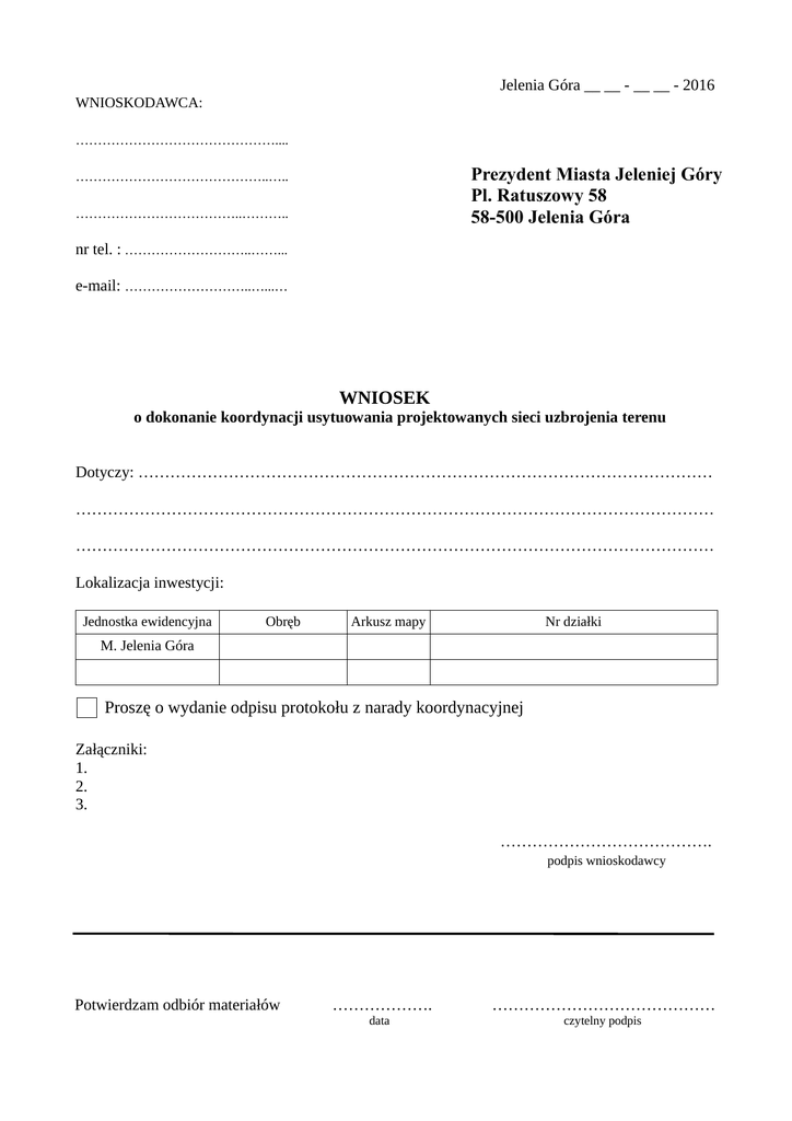 Jelenia Góra __ __ - __ __ - 2016 WNIOSKODAWCA: ……………………………………….... Prezydent Miasta Jeleniej Góry Pl. Ratuszowy 58 58-500 Jelenia Góra ……………………………………..….. ………………………………..……….. nr tel. : ………………………..……... e-mail: ………………………..…...… WNIOSEK o dokonanie koordynacji usytuowania projektowanych sieci uzbrojenia terenu Dotyczy: ……………………………………………………………………………………………… ………………………………………………………………………………………………………… ………………………………………………………………………………………………………… Lokalizacja inwestycji: Jednostka ewidencyjna Obręb Arkusz mapy Nr działki M. Jelenia Góra Proszę o wydanie odpisu protokołu z narady koordynacyjnej Załączniki: 1. 2. 3. …………………………………. podpis wnioskodawcy Potwierdzam odbiór materiałów ………………. …………………………………… data czytelny podpis