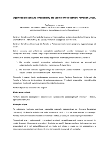 Ogólnopolski konkurs stypendialny dla uzdolnionych uczniów romskich 2016r. Realizowany w ramach PROGRAMU INTEGRACJI SPOŁECZNOŚCI ROMSKIEJ W POLSCE NA LATA 2014-2020 dzięki dotacji Ministra Spraw Wewnętrznych i Administracji Centrum Doradztwa i Informacji dla Romów w Polsce realizuje system stypendialny Ministra Spraw Wewnętrznych i Administracji dla uczniów romskich szczególnie uzdolnionych. Centrum Doradztwa i Informacji dla Romów w Polsce jest realizatorem programu stypendialnego od 2005 r. Celem konkursu jest wyłonienie szczególnie uzdolnionych uczniów należących do romskiej mniejszości etnicznej z terenu całego kraju i udzielenie im wsparcia finansowego i warsztatowego. W roku 2016 zostaną przyznane dwa rodzaje stypendiów obejmujących rok szkolny 2015/2016: 1. Dla uczniów romskich szczególnie uzdolnionych, którzy legitymują się szczególnymi osiągnięciami w swojej dziedzinie – zaplanowano 7 stypendiów, 2. Dla finalistów konkursu stypendialnego dla uzdolnionych uczniów romskich – zaplanowano 25 nagród Ministra Spraw Wewnętrznych i Administracji . Stypendia i nagrody będą przekazywane przelewem przez Centrum Doradztwa i Informacji dla Romów w Polsce na konto rodzica lub opiekuna prawnego. Wysokość stypendiów i nagród będzie zależała od ilości osób wyłonionych przez Komisję Konkursową. Konkurs będzie się składał z kilku etapów: W pierwszym etapie Konkurs zostanie szczegółowo zaplanowany: opracowanie poszczególnych miesięcy i działań, ogłoszenie konkursu. W drugim etapie Po ogłoszeniu konkursu uczniowie przesyłają materiały zgłoszeniowe do Centrum Doradztwa i Informacji dla Romów w Polsce do dnia 20 czerwca 2016r. ( liczy się data stempla pocztowego). Komisja konkursowa ocenia nadesłane materiały i wskazuje osoby do poszczególnych stypendiów. Stypendyści wraz z opiekunami i pozostałymi uczniami zakwalifikowanymi zostaną zaproszeni do części finałowej. Zaproszenie wszystkich finalistów na część finałową zarówno tych nagrodzonych stypendiami jak i tych zakwalifikowanych do finału jest istotne z uwagi na ich uczestnictwo w planowanych warsztatach artystycznych oraz konieczność obserwacji ich postępów. W trzecim etapie Odbędzie się spotkanie finałowe złożone z warsztatów, przesłuchań konkursowych i koncertu finałowego: PLAN KONKURSU 31 lipca wieczorem: do Łodzi przyjadą stypendyści i finaliści w kategoriach artystycznych wraz z opiekunami oraz organizatorzy. Wszyscy zostaną zakwaterowani w Hotelu Boss ul. Tatrzańska 11 w Łodzi. Po kolacji, odbędzie się spotkanie organizacyjne z finalistami i opiekunami. 01.08.2016r:: 10.00 – 17.00 warsztaty artystyczne w Miejskim Ośrodku Kultury w Konstantynowie Ł. 02.08.2016r.: 10.30 -11.30 uroczystości rocznicowe w miejscu upamiętnienia zagłady Romów przed tablicą pamiątkową Getta Łódzkiego przy ul. Wojska Polskiego 84. 12.00- 17.00 warsztaty artystyczne w Miejskim Ośrodku Kultury w Konstantynowie Ł. 03.08.2016r.: 10.00- 14.00 wycieczka do Chełmna, odsłonięcie pomnika - uroczystości upamiętniające zagładę Romów, zwiedzanie. 16.00 – 20.00 warsztaty artystyczne w Miejskim Ośrodku Kultury w Konstantynowie Ł. Wieczorem, do hotelu przyjadą pozostali finaliści z opiekunami w kategorii sport i pozostałych. 04.08.2016r.: 10.00 – 13.00 przygotowania do przesłuchań konkursowych w Bałuckim Ośrodku Kultury w Łodzi. 14.00- 17.00 przesłuchania konkursowe. 18.00 – 20.00 podsumowanie warsztatów . 05.08.2016r. 12.00 – 19.30 przygotowania do koncertu galowego, koncert i ogłoszenie wyników konkursu, wręczenie dyplomów. 20.00 – uroczysta kolacja połączona z zabawą muzyczno - taneczną. 06.08.2016r. – po śniadaniu wyjazd uczestników konkursu. W czasie trwania konkursu organizatorzy zaplanowali dodatkowe atrakcje dla uczestników, o których poinformują na spotkaniu organizacyjnym. Informacje o nagrodzonych finalistach będą umieszczone na stronie Stowarzyszenia i Ministerstwa Spraw Wewnętrznych i Administracji. Do wszystkich laureatów zostanie wysłany dodatkowy upominek w postaci zarejestrowanego przebiegu konkursu stypendialnego na płycie DVD. Przekazanie nagród odbędzie się w następujący sposób: Centrum Doradztwa i Informacji dla Romów w Polsce przekaże przelewem jednorazową nagrodę Ministra Administracji i Cyfryzacji na wskazane konto rodzica lub opiekuna prawnego, bez konieczności rozliczania się fakturami/rachunkami Wszystkich chętnych zapraszamy do udziału w konkursie.