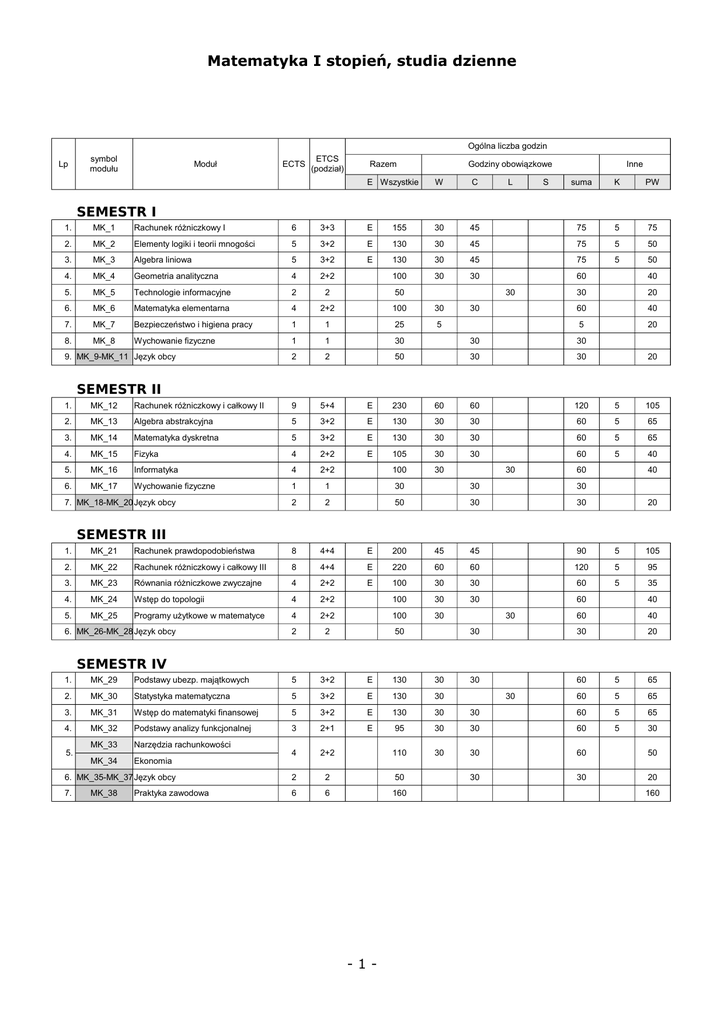 Matematyka I stopień, studia dzienne Ogólna liczba godzin Lp symbol modułu Moduł ETCS ECTS (podział) Razem Godziny obowiązkowe E Wszystkie W C L S Inne suma K PW SEMESTR I 1. MK_1 Rachunek różniczkowy I 6 3+3 E 155 30 45 75 5 75 2. MK_2 Elementy logiki i teorii mnogości 5 3+2 E 130 30 45 75 5 50 3. MK_3 Algebra liniowa 5 3+2 E 130 30 45 75 5 50 4. MK_4 Geometria analityczna 4 2+2 100 30 30 60 40 5. MK_5 Technologie informacyjne 2 2 50 30 20 6. MK_6 Matematyka elementarna 4 2+2 100 30 60 40 7. MK_7 Bezpieczeństwo i higiena pracy 1 1 25 5 5 20 8. MK_8 Wychowanie fizyczne 1 1 30 30 30 2 2 50 30 30 9. MK_9-MK_11 Język obcy 30 30 20 SEMESTR II 1. MK_12 Rachunek różniczkowy i całkowy II 9 5+4 E 230 60 60 120 5 105 2. MK_13 Algebra abstrakcyjna 5 3+2 E 130 30 30 60 5 65 3. MK_14 Matematyka dyskretna 5 3+2 E 130 30 30 60 5 65 4. MK_15 Fizyka 4 2+2 E 105 30 30 60 5 40 5. MK_16 Informatyka 4 2+2 100 30 6. MK_17 Wychowanie fizyczne 1 1 30 30 30 2 2 50 30 30 7. MK_18-MK_20 Język obcy 30 60 40 20 SEMESTR III 1. MK_21 Rachunek prawdopodobieństwa 8 4+4 E 200 45 45 90 5 105 2. MK_22 Rachunek różniczkowy i całkowy III 8 4+4 E 220 60 60 120 5 95 3. MK_23 Równania różniczkowe zwyczajne 4 2+2 E 100 30 30 60 5 35 4. MK_24 Wstęp do topologii 4 2+2 100 30 30 60 40 5. MK_25 Programy użytkowe w matematyce 4 2+2 100 30 60 40 2 2 50 30 20 6. MK_26-MK_28 Język obcy 30 30 SEMESTR IV 1. MK_29 Podstawy ubezp. majątkowych 5 3+2 E 130 30 2. MK_30 Statystyka matematyczna 5 3+2 E 130 30 3. MK_31 Wstęp do matematyki finansowej 5 3+2 E 130 30 4. MK_32 Podstawy analizy funkcjonalnej 3 2+1 E 95 30 MK_33 Narzędzia rachunkowości MK_34 Ekonomia 4 2+2 110 30 6. MK_35-MK_37 Język obcy 2 2 50 7. 6 6 160 5. MK_38 Praktyka zawodowa -1- 30 60 5 65 60 5 65 30 60 5 65 30 60 5 30 30 60 30 30 30 50 20 160 Matematyka I stopień, studia dzienne Ogólna liczba godzin Lp symbol modułu Moduł ECTS ETCS (podział) Razem Godziny obowiązkowe E Wszystkie W C 30 L S Inne suma K PW SEMESTR V 1. MK_39 Podstawy ubezp. życiowych 5 3+2 E 130 30 60 5 65 2. MK_40 Wstęp do metod numerycznych 5 3+2 E 140 30 30 60 5 75 3. MK_41 Ekonometria 4 2+2 E 100 30 30 60 5 35 MK_42 Teoria gier w finansach i ubezpieczeniach 5 3+2 125 30 4 2+2 110 30 5 3+2 125 30 2 2 60 5 3+2 125 3 3 75 3 2+1 80 20 20 40 40 5 3+2 125 30 30 60 65 1 1 30 15 15 15 2 1+1 60 20 40 20 11 285 4. MK_43 5. 6. 7. MK_45 Badania operacyjne Statystyczne modele liniowe i nieliniowe Modelowanie matematyczne MK_46 Teoria systemów MK_47 Proseminarium MK_44 30 60 65 30 60 50 30 60 65 30 30 30 30 60 65 SEMESTR VI 1. 2. 3. 4. 5. 6. 7. MK_48 Przedmiot obieralny I MK_49 Przedmiot obieralny II MK_50 Seminarium MK_51 Metoda Monte Carlo MK_52 Symulacje molekularne w naukach przyrodniczych MK_53 Wielowymiarowa analiza danych MK_54 Prognozowanie i szeregi czasowe MK_55 Ochrona własności intelektualnej MK_56 Socjologia MK_57 Psychologia MK_58 Przygotowanie pracy dyplomowej 11 ECTS łącznie 30 30 20 30 5 10 180 ECTS obieralne 59 wykłady 975 82 ćwiczenia 950 59 19 laboratoria 290 seminarium 30 3 Praktyka zawodowa 160 6 zajęcia o charakterze praktycznym 87 przedmioty podstawowe dla kierunku 77 przedmioty ogólnouczelniane 2 obowiązkowe razem 2245 konsultacje 100 kontaktowe razem 2345 90 praca własna 2345 godziny kontaktowe/godziny ogółem 50% % ECTS obieralnych 33% moduły obieralne oznaczone kolorem szarym sem I l. egz. 3 sem II sem III sem IV sem V sem VI 4 3 4 3 0 l. godz. tyg. 29,33 28 28 22 26 24,5 ECTS 30 30 30 30 30 30 -2- 40 275