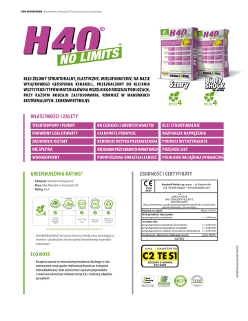 LINIA DO UKŁADANIA / Kleje Mineralne w Technologii SAS do Ceramiki i Kamienia Naturalnego KLEJ ŻELOWY STRUKTURALNY, ELASTYCZNY, WIELOFUNKCYJNY, NA BAZIE WYJĄTKOWEGO GEOSPOIWA KERAKOLL, PRZEZNACZONY DO KLEJENIA WSZYSTKICH TYPÓW MATERIAŁÓW NA WSZELKIEGO RODZAJU PODŁOŻACH, PRZY KAŻDYM RODZAJU ZASTOSOWANIA, RÓWNIEŻ W WARUNKACH EKSTREMALNYCH. EKOKOMPATYBILNY. ® ® 4 4 WŁAŚCIWOŚCI I ZALETY TIKSOTROPOWY I PŁYNNY DO CIENKICH I GRUBYCH WARSTW KLEI STRUKTURALNIE PODWÓJNY CZAS OTWARTY CAŁKOWITE POKRYCIE ROZPRASZA NAPRĘŻENIA ZACHOWUJE KSZTAŁT REDUKUJE RYZYKO PRZEMARZANIA PODNOSI WYTRZYMAŁOŚĆ NIE SPŁYWA NIE OSIADA PRZY GRUBYCH WARSTWACH PRZENOSI SIŁY WODOODPORNY PODWYŻSZONA ODKSZTAŁCALNOŚĆ ZGODNOŚĆ I CERTYFIKATY -- Kategoria: Mineralne Nieorganiczne -- Klasa: Kleje Mineralne w Technologii SAS -- Rating: Eco 4 1599 0407 25 0 g/ kg Emisja CO2/kg 246 g oo IAQ VOC y ≤ lit % 30 % 60 Zawartość minerałów naturalnych 63% l M i n e r al ≥ Ind 4 na io io l M i n e r al ≥ Reg Reg na Emissio ow n L Recyc led r Air Qua Bardzo niska emisja VOC Re cyclable Odpowiedni do recyklingu jako kruszywo SYSTEM POMIARU ATESTOWANY PRZEZ JEDNOSTKĘ CERTYFIKUJĄCĄ SGS -- GreenBuilding Rating® jest jasną i klarowną metodą oceny, pozwalającą na mierzenie i udoskonalanie zrównoważenia środowiskowego materiałów budowlanych. Kerakoll Polska sp. z o.o. – ul. Katowicka 128 95-030 Rzgów - www.kerakoll.com 14 DWU nr 0238 EN 12004:2007+A1:2012 H40 NO LIMITS Klej cementowy o podwyższonych parametrach do mocowania płytek wewnątrz i na zewnątrz Reakcja na ogień Klasa A1/A1fl Wytrzymałość złącza jako: przyczepność początkowa ≥ 1,0 N/mm2 Trwałość dla: przyczepność po starzeniu termicznym ≥ 1,0 N/mm2 przyczepność po zanurzeniu w wodzie ≥ 1,0 N/mm2 przyczepność po cyklach zamrażania-rozmrażania ≥ 1,0 N/mm2 Uwalnianie substancji niebezpiecznych C2 TES1 KLASA patrz MSDS CHARAKTERYSTYKI ECO NOTA CO ZGODNY Z NORMĄ EN 12004 NT R I BUTES PO TO --Receptura oparta na minerałach pochodzenia lokalnego w celu zmniejszenia emisji gazów cieplarnianych podczas transportu --Jednoskładnikowy; brak konieczności używania pojemników z tworzywa sztucznego redukuje emisję CO2 i utylizację odpadów specjalnych INTS 00713H40® No Limits Code: P887 2014/04-PL GREENBUILDING RATING® POCHŁANIA OBCIĄŻENIA DYNAMICZNE WANIE Łączenie wskazanych podłoży, materiałów i zastosowań, nie zawsze może być możliwe. Konieczne jest zapoznanie się z poszczególnymi kartami technicznymi produktu, w celu sprawdzenia możliwości przeznaczenia. W sytuacjach nie wymienionych w zestawieniu, należy kierować pytania bezpośrednio do Kerakoll Worldwide Global Service. PODŁOŻA MATERIAŁY ZASTOSOWANIA ISTNIEJĄCE PŁYTKI HYDROIZOLACJE OGRZEWANIA PODŁOGOWE JASTRYCHY CEMENTOWE JASTRYCHY ASFALTOWE BETON PŁYTY GIPSOWO-KARTONOWE PŁYTY WŁÓKNOWO-CEMENTOWE GIPS I ANHYDRYT BETON KOMÓRKOWY CEGŁY TYNKI WAPIENNE I CEMENTOWE ŚCIANY MALOWANE PANELE IZOLACYJNE PODKŁADY DZWIĘKOCHŁONNE DREWNO METAL PCV GRES PORCELANOWY GRES LAMINOWANY PŁYTY GRESOWE POCIENIONE PŁYTKI CERAMICZNE DUŻE FORMATY PŁYTY GRESOWE 300 X 150 CM MARMURY - KAMIENIE NATURALNE KOMPOZYTY MOZAIKI SZKLANE PŁYTKI SZKLANE PANELE IZOLACJI TERMOAKUSTYCZNYCH KLINKIER KLEJ I SZPACHLA PODŁOGI I ŚCIANY WEWNĄTRZ - ZEWNĄTRZ “PŁYTKA NA PŁYTKĘ” TARASY I BALKONY ELEWACJE BASENY I FONTANNY SAUNY I SPA BUDOWNICTWO MIESZKANIOWE BUDOWNICTWO HANDLOWE BUDOWNICTWO PRZEMYSŁOWE INFRASTRUKTURA MIEJSKA • PRZYGOTOWANIE PODŁOŻY Wszystkie podłoża muszą być równe, wysezonowane, niespękane, zwarte, twarde, mocne, suche, pozbawione środków utrudniających przyczepność i kapilarnego podciągania wilgoci. Dobrym zwyczajem jest zwilżanie bardzo nasiąkliwych podłoży cementowych lub jednokrotne zagruntowanie Primer A Eco. • PRZYGOTOWANIE KLEJU Konsystencja Płynna do układania na cienkiej warstwie przy całkowitym pokryciu: Szary ≈ 9 litrów czystej wody/worek Biały Shock ≈ 8,6 litra czystej wody/worek Konsystencja Tiksotropowa do układania na grubej warstwie i na ścianach: Szary ≈ 7 litrów czystej wody/worek Biały Shock ≈ 6,6 litra czystej wody/worek • NANOSZENIE Dla uzyskania maksymalnej przyczepności strukturalnej nanieść taką warstwę kleju, która zapewni całkowite pokrycie. W przypadku płyt wielkoformatowych, płytek prostokątnych o boku > 60 cm oraz płytek pocienionych może zaistnieć potrzeba naniesienia kleju również bezpośrednio na ich rewersie. Wykonać próbę pokrycia klejem rewersu płytki. Wykonać elastyczne spoiny dylatacyjne: - ≈ 10 m2 na zewnątrz, - ≈ 25 m2 wewnątrz, - co 8 mb w przypadku długich i wąskich powierzchni. Zachować wszystkie szczeliny konstrukcyjne, podziałowe i obwiedniowe obecne w podłożu. 00713H40® No Limits Code: P887 2014/04-PL ZASTOSO DANE OBRÓBKOWE Opakowanie kg 25 Przechowywanie ≈ 12 miesięcy w oryginalnym opakowaniu Chronić przed wilgocią Grubości warstwy kleju od 2 do 15 mm Wydajność na mm grubości warstwy Szary (R.I. 32,5%) ≈ 1,63 kg/m2 Biały Shock (R.I. 30,5%) ≈ 1,56 kg/m2 Temperatura powietrza, podłoża i materiału od +5 °C do +35 °C Pot life przy +23 °C Szary Biały ≈7h ≈7h Czas otwarty (płytka BIII) +23 °C +35 °C ≥ 60 min. ≥ 20 min. EN 1346 EN 1346 Czas korygowania (płytka BIII) +23 °C ≥ 20 min. +35 °C ≥ 15 min. Czas uodpornienia na ryzyko przemrożenia przy spadku temperatury (płytka BIa) od +5°C do -5°C ≈8h Ruch pieszy/spoinowanie (płytka BIa) +23 °C ≈ 24 h +5 °C ≈ 70 h Spoinowanie ścian (płytka BIa) +23 °C ≈ 20 h Oddanie do użytku w +23 °C / +5 °C (płytka BIa) - małe natężenie ruchu ≈ 2 / 4 dni - duże natężenie ruchu ≈ 3 / 6 dni - baseny (+23 °C) ≈ 14 dni • PRZYGOTOWANIE PODŁOŻY SPECJALNYCH Drewno (wewnątrz) o grubości ≥ 25 mm: Keragrip Eco Metal (wewnątrz): Keragrip Eco Jastrych asfaltowy (wewnątrz): Primer A Eco Gips i anhydryt (wewnątrz): Primer A