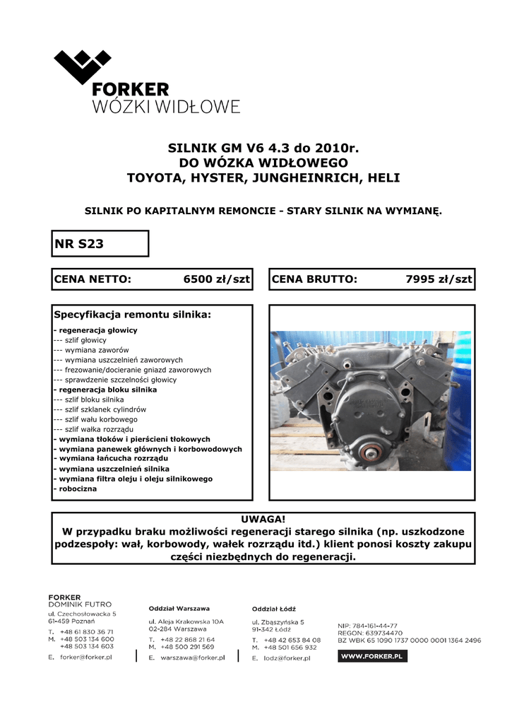 SILNIK GM V6 4.3 do 2010r. DO WÓZKA WIDŁOWEGO TOYOTA, HYSTER, JUNGHEINRICH, HELI SILNIK PO KAPITALNYM REMONCIE - STARY SILNIK NA WYMIANĘ. NR S23 CENA NETTO: 6500 zł/szt CENA BRUTTO: 7995 zł/szt Specyfikacja remontu silnika: - regeneracja głowicy --- szlif głowicy --- wymiana zaworów --- wymiana uszczelnień zaworowych --- frezowanie/docieranie gniazd zaworowych --- sprawdzenie szczelności głowicy - regeneracja bloku silnika --- szlif bloku silnika --- szlif szklanek cylindrów --- szlif wału korbowego --- szlif wałka rozrządu - wymiana tłoków i pierścieni tłokowych - wymiana panewek głównych i korbowodowych - wymiana łańcucha rozrządu - wymiana uszczelnień silnika - wymiana filtra oleju i oleju silnikowego - robocizna UWAGA! W przypadku braku możliwości regeneracji starego silnika (np. uszkodzone podzespoły: wał, korbowody, wałek rozrządu itd.) klient ponosi koszty zakupu części niezbędnych do regeneracji.