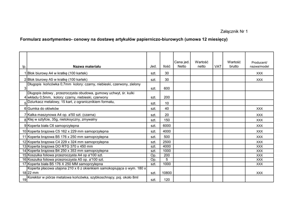Załącznik Nr 1 Formularz asortymentwo- cenowy na dostawę artykułów papierniczo-biurowych (umowa 12 miesięcy) Cena jed. Netto Wartość netto Wartość brutto Producent/ nazwa/model Jed. Ilość 1 Blok biurowy A4 w kratkę (100 kartek) szt. 30 XXX 2 Blok biurowy A5 w kratkę (100 kartek) Długopis końcówka 0,7mm kolory: czarny, niebieski, czerwony, zielony 3 Długopis żelowy , przezroczysta obudowa, gumowy uchwyt, śr. kulki 4 wkładu 0,5mm, kolory: czarny, niebieski, czerwony 5 Dziurkacz metalowy, 15 kart, z ogranicznikiem formatu, szt. 30 XXX szt. 600 szt. 200 szt. 10 6 Gumka do ołówków szt. 40 XXX 7 Kalka maszynowa A4 op. a'50 szt. (czarna) 8 Klej w sztyfcie, 35g, nietoksyczny, zmywalny szt. szt. 20 150 XXX 9 Koperta biała C6 samoprzylepna szt. 6000 XXX 10 Koperta brązowa C5 162 x 229 mm samoprzylepna szt. 4000 XXX Koperta brązowa B5 176 x 250 mm samoprzylepna Koperta brązowa C4 229 x 324 mm samoprzylepna Koperta brązowa DO RTG 370 x 450 mm Koperta brązowa B4 250 x 353 mm samoprzylepna Koszulka foliowa przezroczysta A4 op a'100 szt. Koszulka foliowa przezroczysta A5 op. a'100 szt. Koperta biała B5 176 X 250 MM samoprzylepna Koperta płacowa utajona 210 x 6 z okienkiem samokopiująca o wym. 180 x 18 22 mm Korektor w piórze metalowa końcówka, szybkoschnący, poj. około 8ml 19 szt. szt. szt. szt. Op. Op. szt. 500 2500 4000 1000 200 5 1000 XXX szt. 10800 XXX szt. 120 lp. 11 12 13 14 15 16 17 Nazwa materiału VAT XXX XXX XXX XXX XXX XXX XXX 20 Linijka plastikowa 30 cm Marker do trwałego znakowania tkanin z okrągłą końcówką o śr. około 21 1mm Marker do opisywania klisz RTG biały, olejowy,końcówka okrągła około 0,8 22 mm 23 Marker do znakowania płyt CD/DVD cienkopiszący szt. 20 szt. 80 szt. 20 szt. szt. 400 160 szt. 40 XXX 26 szt. 30 XXX 27 Ołówek, bez gumki, z drewna, o twardości HB Papier komputerowy 240x12x3 z perforacją, z napisami (oryginał i kopia), 28 kolory: oryginał biały, kopie żółty i różowy), składanka 600 szt. szt. 80 XXX karton 8 XXX ryza 8 XXX ryza 1680 31 Papier do ksera A4, żółty, gramatura 80g/m , opak. 500 kartek 32 Papier do ksera A3, biały, gramatura 80g/m2, opak. 500 kartek 33 Rolka do faksu, 216mmx30m ryza ryza 15 3 XXX szt. 20 XXX 34 Rolka termoczuła 57 mmx30m szt. 50 XXX 35 Rolka termoczuła 110 mmx30m szt. 20 XXX 36 Rozszywacz do zszywek 24/6 Segregator A4, grzbiet 75mm wykonany z grubego kartonu, klasyczny 37 mechanizm dźwigniowy, naklejona etykieta opisowa Segregator A4, grzbiet 75mm, oklejony na zewn. poliolefiną lub folią PP, dwustr., wym. etykieta na grzbiecie, okuty otwór na palec, na dolnych 38 krawędziach metalowe okucia Segregator A4, grzbiet 50mm, oklejony na zewn. poliolefiną lub folią PP, dwustr., wym. etykieta na grzbiecie, okuty otwór na palec, na dolnych 39 krawędziach metalowe okucia szt. 20 XXX szt. 300 XXX szt. 400 XXX szt. 100 XXX 24 Marker zwykły kolory: czarny, czerwony, zielony Nożyczki biurowe, metalowe, z nierdzewnej stali, z rączką z niełamiącego plastiku, średnie 25 XXX Karteczki w bloczku, samoprzylepne, 75x75mm, 100 karteczek w bloczku 2 29 Papier do ksera A5, biały, gramatura 80g/m , opak. 500 kartek 2 30 Papier do ksera A4, biały, gramatura 80g/m , opak. 500 kartek 2 XXX Segregator A5, grzbiet 75mm, oklejony na zewn. poliolefiną lub folią PP, dwustr., wym. etykieta na grzbiecie, okuty otwór na palec, na dolnych 40 krawędziach metalowe okucia Segregator A5, grzbiet 50mm, oklejony na zewn. poliolefiną lub folią PP, dwustr., wym. etykieta na grzbiecie, okuty otwór na palec, na dolnych 41 krawędziach metalowe okucia Skoroszyt kartonowy A4, oczkowy, połówkowy, biały, z wąsami 42 Skoroszyt kartonowy A4, oczkowy, pełny, biały, z wąsami 43 Skoroszyt PCV A4, przednia okładka przezroczysta, tylna kolorowa, 44 wysuwany pasek opisowy, papierowy z wąsami, do wpinania szt. 10 XXX szt. 10 XXX szt. 240 XXX szt. 200 XXX szt. 600 XXX 45 Skoroszyt plastikowy przezroczysty z klipsem A4 o pojemności 30 kartek szt. 50 XXX 46 Spinacze metalowe 28 mm op. a'100szt. szt. 800 XXX 47 Spinacze metalowe 50 mm op. a'100szt. Teczka wiązana A4, biała, z kartonu 48 szt. 100 XXX szt. 1200 XXX szt. 500 XXX szt. 20 XXX szt. 100 XXX szt. 150 XXX szt. 60 XXX szt. 20 49 Teczka z gumką, kartonowa, lakierowana, na dokumenty formatu A4 Temperówka metalowa jednostronna 50 Tusz do stempli gumowych, poj. około 25ml, kolory: czarny, czerwony, 51 zielony, niebieski Taśma klejąca biurowa, 24mmx30m, przezroczysta 52 Taśma klejąca pakowa, 48mmx50m, brązowa 53 Teczka do akt osobowych A4 wyposażona w mechanizm 2 ringowy na grzbiecie znajduje się kieszeń i kartonik na dane personalne (miękka 54 oprawa) Teczka do akt osobowych A4 wyposażona w mechanizm 2 ringowy na grzbiecie znajduje się kieszeń i kartonik na dane personalne (twarda 55 oprawa) Zakreślacz fluorescencyjny, na bazie wody, ścięta końcówka, szerokość 56 linii 2-5mm, kolory: żółty, zielony, pomarańczowy Zszywacz biurowy metalowy, min. 12 kart zszywania, na zszywki 24/6, 57 głębokość zszywania 6-7 cm XXX szt. 50 XXX szt. 50 XXX szt. 50 58 59 60 61 Zszywacz biurowy, 100 kart zszywania, metalowy, na zszywki od 23/6 do 23/15 Zeszyt A4, kratka, 96 kartek, miękka oprawa, szyty Zeszyt A5, kratka, 96 kartek, miękka oprawa, szyty Pinezki Zszywki 23/ 8, opak. 1000 szt. (do 40 kart) szt. szt. szt. op. 10 250 400 5 XXX XXX XXX 62 63 Zszywki 23/ 10, opak. 1000 szt. (do 60 kart) Zszywki 23/ 13, opak. 1000 szt. (do 90 kart) 64 65 Zszywki 23/ 15, opak. 1000 szt. (do 100 kart) op. op. 80 20 XXX XXX op. 20 XXX op. 20 XXX 66 Zszywki 24/6, opak. 1000 szt. 67 Pojemnik kartonowy, stojący, na dokumenty formatu A4, grzebiet 80mm szt. 800 XXX szt. 30 XXX szt. 20 XXX szt. 10 XXX 68 Szuflada na dokumenty o formacie A4, przezroczysta, leżąca, z wcięciem z przodu, z możliwością łączenie w pionie Poduszka do stempli, 50x90mm, kolory wkładki: czarny, 69 Zamawiajacy wymaga dołączenia próbek po 1 szt. z następujących pozyc