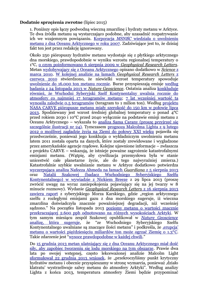 Dodatnie sprzężenia zwrotne (lipiec 2015) 1. Poniższy opis łączy podwodną wieczną zmarzlinę i hydraty metanu w Arktyce. Te dwa źródła metanu są wystarczająco podobne, aby uzasadnić rozpatrywanie ich we wzajemnym powiązaniu. Korporacja MSNBC wiedziała o uwolnieniu metanu z dna Oceanu Arktycznego w roku 2007. Zadziwiające jest to, że dzisiaj fakt ten jest przez redakcję ignorowany. Około 250 pióropuszy hydratów metanu wydostaje się z płytkiego arktycznego dna morskiego, prawdopodobnie w wyniku wzrostu regionalnej temperatury o 1°C, o czym poinformowano 6 sierpnia 2009 w Geophysical Research Letters. Metan wydobywający się z Oceanu Arktycznego opisano dodatkowo w Science z marca 2010. W kolejnej analizie na łamach Geophysical Research Letters z czerwca 2010 stwierdzono, że niewielki wzrost temperatury spowoduje uwolnienie do 16.000 ton metanu rocznie. Burze przyspieszają emisje według badania z 24 listopada 2013 w Nature Geoscience. Ostatnia analiza konkluduje również, że Wschodni Syberyjski Szelf Kontynentalny uwalnia rocznie do atmosfery co najmniej 17 teragramów metanu; 7 lat wcześniej wartość ta wynosiła zaledwie 0.5 teragramów (teragram to 1 milion ton). Według projektu NASA CARVE pióropusze metanu miały szerokość do 150 km w połowie lipca 2013. Spodziewany jest wzrost średniej globalnej temperatury o ponad 4°C przed rokiem 2030 i 10°C przed 2040 wyłącznie na podstawie emisji metanu z Oceanu Arktycznego – wykazała to analiza Sama Carany (proszę przyjrzeć się szczególnie ilustracji nr 24). Tymczasem prognoza Malcolma Lighta z 9 lutego 2012 o możliwej zagładzie życia na Ziemi do połowy XXI wieku pojawiła się przedwcześnie, ponieważ jego konkluzja o wykładniczym uwolnieniu metanu latem 2011 została oparta na danych, które zostały zrewidowane i wygładzone przez amerykańskie agencje rządowe. Kolejne ujawnione informacje – zwłaszcza z projektu CARVE – wskazują, że istnieje poważne zagrożenie katastrofalnymi emisjami metanu. (Wątpię, aby cywilizacja przemysłowa była w stanie unicestwić całe planetarne życie, ale do tego najwyraźniej zmierza.) Katastrofalnie szybkie uwalnianie metanu w Arktyce dodatkowo potwierdza wyczerpująca analiza Nafeeza Ahmeda na łamach Guardiana z 5 sierpnia 2013 oraz Natalii Szakowej (badacz Wschodniego Syberyjskiego Szelfu Kontynentalnego) w wywiadzie z Nickiem Breeze z 29 lipca 2013 (proszę zwrócić uwagę na wyraz zaniepokojenia pojawiający się na jej twarzy w 8 minucie rozmowy). Wydanie Geophysical Research Letters z 16 sierpnia 2013 zawiera raport z syberyjskiego Morza Karskiego, gdzie „region arktycznego szelfu z rozległymi emisjami gazu z dna morskiego sugeruje, iż wieczna zmarzlina doświadczyła znacznie poważniejszej degradacji, niż wcześniej sądzono.” Na początku listopada 2013 poziomy metanu o wartości znacznie przekraczającej 2.600 ppb odnotowano na różnych wysokościach Arktyki. W tym samym miesiącu zespół Szakowej opublikował w Nature Geoscience analizę, która sugeruje, że “ze Wschodniego Syberyjskiego Szelfu Kontynentalnego uwalniane są znaczące ilości metanu” i podkreśla, że ‚erupcja’ metanu o wartości pięćdziesięciu miliardów ton może ogrzać Ziemię o 1.3° C. Takie zdarzenie jest “wysoce prawdopodobne w każdej chwili.” Do 15 grudnia 2013 metan ulatniający się z dna Oceanu Arktycznego miał dość siły, aby zapobiec tworzeniu się lodu morskiego na tym obszarze. Prawie dwa lata po swojej wstępnej, często lekceważonej analizie Malcolm Light sformułował 22 grudnia 2013 wniosek, że „przekroczyliśmy punkt krytyczny hydratów metanu i obecnie przyspieszamy w stronę wymarcia, ponieważ ‚działo klatratu’ wystrzeliwuje salwy metanu do atmosfery Arktyki”. Według analizy Lighta z końca 2013, temperatura atmosfery Ziemi będzie przypominać atmosferę Wenus jeszcze przed rokiem 2100. Dwa tygodnie później, w eseju akcentującym wyginięcie gatunku ludzkiego w bliskiej przyszłości, Light stwierdza: „Tempo przenoszenia prądu zatokowego uruchomiło w Arktyce ‚działo klatratu metanu’ w 2007 roku, kiedy jego energia/rok przekroczyła 10 milionów razy ilość energii/rok niezbędnej do dysocjacji arktycznych hydratów metanu.” Nic dziwnego, że nastąpiło to w 2007 roku, kiedy zasięg arktycznego lodu morskiego osiągnął punkt krytyczny. Uruchomienie ‚działa klatratu metanu’ potwierdza również Örjan Gustafsson z Uniwersytetu w Sztokholmie, który w dniu 23 lipca 2014 podzielił się raportem z rejsu po Morzu Łaptiewów: „Wyniki wstępnych analiz próbek wody morskiej wykazały poziom rozpuszczonego metanu, który jest od 10 do 50 razy wyższy niż poziom tła.” [Glacjolog] Jason Box odpowiada na tę wiadomość w zachowawczy sposób – niczego innego nie spodziewam się po naukowcach akademickich – w dniu 27 lipca 2014 roku: „Jakie znaczenie ma według mnie ta wiadomość? Podwyższony poziom atmosferycznego węgla ze spalania paliw kopalnych jest mechanizmem spustowym szturchającym klimatycznego smoka. Trajektoria, którą zdążamy prowadzi do obudzenia niekontrolowanego ogrzania klimatu, które zdewastuje globalne systemy rolne, powodując masowy głód i konflikty. W porównaniu z nimi wzrost poziomu morza będzie drobnostką.” Później, podczas wywiadu z Vice opublikowanego 1 sierpnia 2014, Box nieco się rozluźnił mówiąc, „Nawet jeśli niewielki ułamek arktycznego węgla został uwolniony do atmosfery, mamy przesrane.” Zaufaj mi Jason, jest po wszystkim. Równolegle z misją na Morzu Łaptiewów na Syberii odkryto kilka ogromnych dziur. Wstępna reakcja w literaturze naukowej, analiza opublikowana 31 lipca 2014 w Nature, wskazuje na poziom atmosferycznego metanu 50.000 razy wyższy od normalnego. Artykuł z 4 sierpnia 2014 w TruthOut rozważa kwestię kraterów: „Jeśli kiedykolwiek zastanawialiście się, czy może zobaczycie koniec znanego nam świa