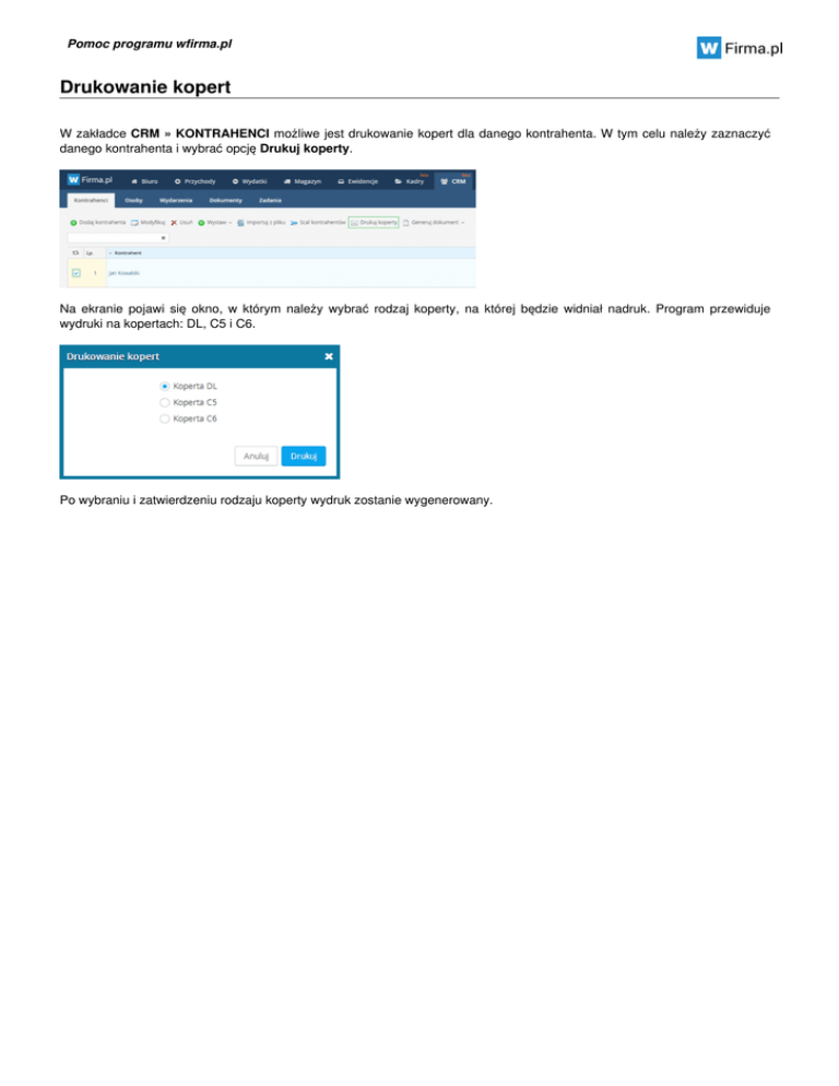 Pomoc programu wfirma.pl Drukowanie kopert W zakładce CRM » KONTRAHENCI możliwe jest drukowanie kopert dla danego kontrahenta. W tym celu należy zaznaczyć danego kontrahenta i wybrać opcję Drukuj koperty. Na ekranie pojawi się okno, w którym należy wybrać rodzaj koperty, na której będzie widniał nadruk. Program przewiduje wydruki na kopertach: DL, C5 i C6. Po wybraniu i zatwierdzeniu rodzaju koperty wydruk zostanie wygenerowany. Powered by TCPDF (www.tcpdf.org)