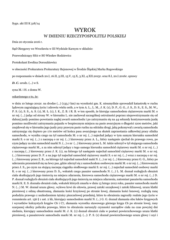 Sygn. akt III K 318/14 WYROK W IMIENIU RZECZYPOSPOLITEJ POLSKIEJ Dnia 20 stycznia 2016 r. Sąd Okręgowy we Wrocławiu w III Wydziale Karnym w składzie: Przewodniczący SSA w SO Wiesław Rodziewicz Protokolant Ewelina Doroszkiewicz w obecności Prokuratora Prokuratury Rejonowej w Środzie Śląskiej Marka Rogowskiego po rozpoznaniu w dniach 20.I, 16.II, 5.III, 15.V, 15.X, 3.XI, 4.XII.2015r. oraz 8.I, 20.I.2016r. sprawy D. C. urodz. (...) w S. syna M. i H. z domu W. oskarżonego o to, że: w dniu 10 lutego 2012r. na drodze (...) (133,7 km) na wysokości gm. K. nieumyślnie sprowadził katastrofę w ruchu lądowym zagrażającą życiu i zdrowiu wielu osób, a w tym A. L., L. M., J. K. (1), D. P., G. G., J. S., D. S., E. S., M. W., P. S. (1), S. S., A. S. (1), M. Ł. (1), I. K., Z. B. i R. B. w ten sposób, że kierując samochodem ciężarowym marki M. o nr rej. (...) jadąc od strony W. w kierunku L. nie zachował szczególnej ostrożności poprzez niepowstrzymanie się od dalszej jazdy pomimo powstania nagłej awarii samochodu i po zatrzymaniu się na 44 sekundy kontynuowania jazdę pomimo możliwości zatrzymania pojazdu w bezpiecznym miejscu na pasie awaryjnym o długości 1200 metrów, jaki znajdował się w kierunku jego jazdy przy prawym pasie ruchu na odcinku drogi, jaką pokonywał z awarią samochodu zatrzymując się dopiero po 170 metrów od końca pasa awaryjnego na skutek zaprzestania całkowitej pracy silnika samochodu, w wyniku czego na tył samochodu M. o nr rej. (...) najechał jadący w tym samym kierunku samochód marki S. o nr rej. (...) z naczepą o nr rej. (...) kierowany przez A. L., który następnie zjechał do prawego rowu, po czym jadący za nim samochód marki N. (...) o nr (...) kierowany przez L. M. także uderzył w tył stojącego samochodu ciężarowego marki M., a za nim uderzył jadący z tego samego kierunku samochód ciężarowy marki M. o nr rej. (...) z naczepą (...) kierowany przez J. K. (1), na którego tył następnie najechał samochód ciężarowy marki M. o nr rej. (...) kierowany przez D. P. a na jego tył najechał samochód ciężarowy marki S. o nr rej. (...) wraz z naczepą o nr rej. (...) kierowany przez Z. B., na którego tył najechał samochód maki N. (...) nr rej. (...) kierowany przez G. G., który po uderzeniu przemieścił się na lewy pas, gdzie zderzył się z samochodem osobowym marki M. o nr rej. (...) kierowanym przez J. S., po czym na stojącą naczepę ciągnika siodłowego marki S. nr rej. (...) najechał samochód osobowy marki K. o nr rej. (...) kierowany przez D. S., wskutek czego pasażer samochodu N. (...) L. M. doznał rozległych obrażeń ciała skutkujących jego śmiercią na miejscu zdarzenia, kierowca samochodu ciężarowego marki M. o nr rej. (...) D. P. doznał rozległych obrażeń ciała skutkujących jego śmiercią na miejscu zdarzenia, natomiast pasażerka samochodu marki K. E. S. doznała obrażeń ciała, wskutek których zmarła w dniu 13 lutego 2012 roku, pasażer samochodu marki N. (...) M. W. doznał urazu głowy, wylewu krwi do sitowia, prawej zatoki szczękowej i zatoki klinowej, urazu klatki piersiowej z odmą obustronną, złamania kości krzyżowej po stronie lewej, złamania kości łonowej, rozległą ranę podudzia prawego z uszkodzeniem tętnicy piszczelowej przedniej, które to obrażenia zagroziły realnie jego życiu w rozumieniu art. 156 § 1 ust. 2 kk, kierujący samochodem marki N. (...) G. G. doznał złamania obu łuków kręgowych i wyrostków kolczystych kręgów C6 i C7, złamania wyrostka stawowego górnego kręgu C6 po stronie lewej, rany szarpanej okolicy policzka prawego, które to obrażenia naruszyły czynności narządów ciała na czas powyżej dni siedmiu, kierujący samochodem marki M. J. K. (1) doznał obrażeń ciała w postaci powierzchownego urazu klatki piersiowej, a pasażerowie samochodu marki M. nr rej. (...): P. S. (1) doznał powierzchownego urazu głowy i szyi i klatki piersiowej, S. S. doznał stłuczenia kręgosłupa szyjnego i lędźwiowego oraz stłuczenia kolana, które to obrażenia naruszyły czynności narządów ich ciał na czas powyżej dni siedmiu, A. S. (1) doznała stłuczenia odcinka szyjnego kręgosłupa, natomiast pasażer samochodu marki M. nr rej. (...) M. Ł. (1) doznał stłuczenia i otarcia naskórka okolicy lędźwiowej prawej, kierujący samochodem marki K. D. S. doznał rany na głowie, stłuczenia kręgosłupa szyjnego i stłuczenia kolana lewego, kierujący samochodem marki S. A. L. doznał wstrząśnienia mózgu i stłuczenia prawego przedramienia, natomiast pasażer samochodu marki N. (...) I. K. doznał stłuczenia okolicy lędźwiowej po stronie lewej i ranę ciętą przedramienia lewego, kierujący samochodem marki S. Z. B. doznał skręcenia kręgosłupa szyjnego i klatki piersiowej, które to obrażenia naruszyły czynności narządów ciała u wyżej wymienionych na czas poniżej dni siedmiu, tj. o przestępstwo z art. 173 § 2 i 4 kk i ar. 177 § 1 i 2 kk i art. 157 § 3 kk w zw. z art. 11 § 2 kk ***************************************************************************** I. uniewinnia oskarżonego D. C. od popełnienia zarzucanego mu czynu, II. na podstawie art. 632 pkt 2 k.p.k. kosztami postępowania, za wyjątkiem kosztów udziału pełnomocników oskarżycieli posiłkowych, obciąża Skarb Państwa. Sygn. akt III K 318/14 UZASADNIENIE Na podstawie zgromadzonego materiału dowodowego Sąd Okręgowy ustalił następujący stan faktyczny: D. C. i M. Ł. (1) byli zatrudnieni jako kierowcy w firmie (...) M. P. (1) w S.. Dowód: - wyjaśnienia oskarżonego k. 1279v-1282v; - zeznania M. P. (1) k. 773-775, 1316-1318; - zeznania M. Ł. (1) k. 145-146, 949-950, 1318-1320. W firmie (...) wykorzystywany był samochód marki M. o nr rej. (...). Serwis i naprawy samochodu odbywały się w serwisie (...) Sp. z o.o.”. Ostatnią naprawę przed zdarzeniem samochód przeszedł w dniu 1 lutego 2012r. W jej trakcie wymieniono filtr 