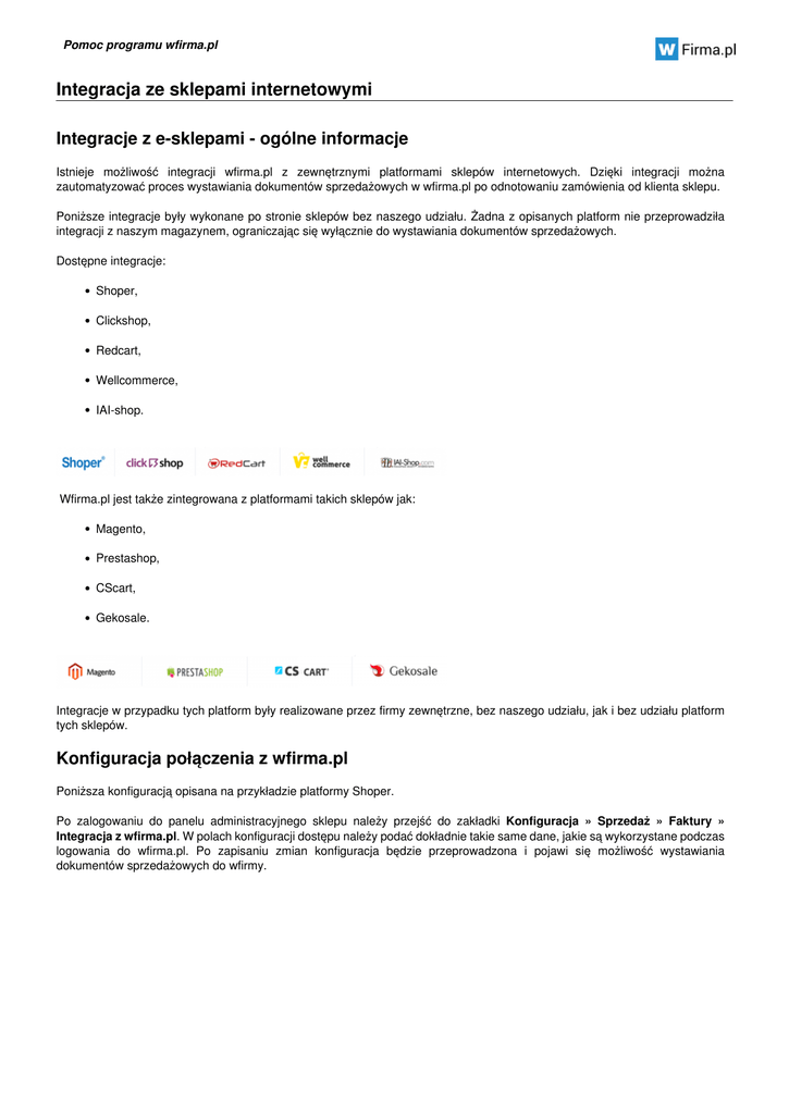 Pomoc programu wfirma.pl Integracja ze sklepami internetowymi Integracje z e-sklepami - ogólne informacje Istnieje możliwość integracji wfirma.pl z zewnętrznymi platformami sklepów internetowych. Dzięki integracji można zautomatyzować proces wystawiania dokumentów sprzedażowych w wfirma.pl po odnotowaniu zamówienia od klienta sklepu. Poniższe integracje były wykonane po stronie sklepów bez naszego udziału. Żadna z opisanych platform nie przeprowadziła integracji z naszym magazynem, ograniczając się wyłącznie do wystawiania dokumentów sprzedażowych. Dostępne integracje: Shoper, Clickshop, Redcart, Wellcommerce, IAI-shop. Wfirma.pl jest także zintegrowana z platformami takich sklepów jak: Magento, Prestashop, CScart, Gekosale. Integracje w przypadku tych platform były realizowane przez firmy zewnętrzne, bez naszego udziału, jak i bez udziału platform tych sklepów. Konfiguracja połączenia z wfirma.pl Poniższa konfiguracją opisana na przykładzie platformy Shoper. Po zalogowaniu do panelu administracyjnego sklepu należy przejść do zakładki Konfiguracja » Sprzedaż » Faktury » Integracja z wfirma.pl. W polach konfiguracji dostępu należy podać dokładnie takie same dane, jakie są wykorzystane podczas logowania do wfirma.pl. Po zapisaniu zmian konfiguracja będzie przeprowadzona i pojawi się możliwość wystawiania dokumentów sprzedażowych do wfirmy. Pomoc programu wfirma.pl Podczas konfiguracji dostępne są również ustawienia opcjonalne, jak określenie czy dokument sprzedaży (oraz który) ma się automatycznie wystawić po stronie wfirma.pl i czy po tej operacji ma zostać automatycznie wysłany do kontrahenta. Do wyboru są następujące typy dokumentów sprzedaży: faktura VAT, faktura proforma, paragon niefiskalny, paragon fiskalny, inne przychody. Dodatkowo, można określić z jaką serią numeracji mają być wystawiane dokumenty po stronie wfirma.pl. Podczas integracji wystarczy podać dokładnie taką samą nazwę serii, jaka jest wykorzystywana po stronie wfirma.pl. W systemie wfirma.pl nowe serie dodaje się w zakładce USTAWIENIA » FAKTURY » SERIE NUMERACJI. Po stronie panelu administracyjnego sklepu w zakładce Sprzedaż » Zamówienia można wysyłać do wfirma.pl dany typ dokumentu. W tym celu przy danym zamówieniu należy rozwinąć listę akcji i przejść do opcji Faktura » Operacje. Własne integracje Pomoc programu wfirma.pl Udostępniamy API, za pośrednictwem którego można integrować zewnętrzne systemy z wfirma.pl. Dokumentacja API jest pod adresem: https://doc.wfirma.pl/ Powered by TCPDF (www.tcpdf.org)