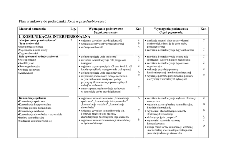 Plan wynikowy do podręcznika Krok w przedsiębiorczość Materiał nauczania L.g. Wymagania podstawowe Uczeń poprawnie: Kat. Wymagania podstawowe Uczeń poprawnie: Kat. I. KOMUNIKACJA INTERPERSONALNA Kim jest osoba przedsiębiorcza? Typy osobowości Osoba przedsiębiorcza Moje mocne i słabe strony Typy osobowości Role społeczne i rodzaje zachowań Role społeczne Konflikty ról Role organizacyjne Rodzaje zachowań Asertywność Komunikacja społeczna Komunikacja społeczna Komunikacja interpersonalna Przebieg procesu komunikacji Komunikacja werbalna Komunikacja niewerbalna – mowa ciała Bariery komunikacyjne Skuteczne komunikowanie się 7 wyjaśnia, czym jest przedsiębiorczość wymienia cechy osoby przedsiębiorczej definiuje osobowość A B A definiuje pojęcie „rola społeczna” rozróżnia i charakteryzuje role przypisane i osiągane wyjaśnia, czym są napięcie ról oraz konflikt ról i podaje przykłady występowania tych sytuacji definiuje pojęcie „rola organizacyjna” rozpoznaje podstawowe rodzaje zachowań, w tym zachowania asertywne, podaje przyczyny i konsekwencje poszczególnych rodzajów zachowań omawia poszczególne rodzaje zachowań w kontekście osoby przedsiębiorczej A C wyjaśnia znaczenie terminów: „komunikacja społeczna”, „komunikacja interpersonalna”, „komunikacja werbalna”, „komunikacja niewerbalna” wyjaśnia, czym jest komunikowanie się, i omawia przebieg tego procesu, charakteryzując poszczególne jego elementy wyjaśnia znaczenie komunikacji niewerbalnej w życiu codziennym A C A C analizuje mocne i słabe strony własnej osobowości, odnosi je do cech osoby przedsiębiorczej rozróżnia i charakteryzuje typy osobowości C rozróżnia i charakteryzuje własne role społeczne i typowe dla nich zachowania rozróżnia i charakteryzuje typowe role organizacyjne wskazuje przykłady postawy konformistycznej i nonkonformistycznej wykazuje potrzebę przyjmowania postawy asertywnej w określonych sytuacjach C rozróżnia i charakteryzuje wybrane elementy mowy ciała wyjaśnia, czym są bariery komunikacyjne, i podaje ich przykłady wymienia i charakteryzuje elementy skutecznej komunikacji definiuje pojęcie „empatia” wymienia i rozróżnia poziomy komunikowania stosuje różne formy komunikacji werbalnej i niewerbalnej w celu autoprezentacji oraz prezentacji własnego stanowiska C C C C C C C B B B A C D Podejmowanie decyzji Proces decyzyjny i jego fazy Rodzaje decyzji Wady oraz zalety indywidualnego i grupowego podejmowania decyzji Bariery w podejmowaniu decyzji Racjonalność decyzji wyjaśnia znaczenie terminów: „decyzja”, „decydent”, „problem decyzyjny” rozróżnia i charakteryzuje fazy procesu decyzyjnego omawia wady oraz zalety decyzji indywidualnych i zbiorowych wymienia i charakteryzuje bariery w podejmowaniu decyzji A Konflikty i ich rozwiązywanie. Negocjacje Konflikt i jego rodzaje Metody rozwiązywania konfliktów Negocjacje Mediacje i arbitraż wyjaśnia znaczenie terminów: „konflikt”, „negocjacje”, „mediacje”, „arbitraż” wymienia i charakteryzuje wybrane metody rozwiązywania konfliktów wymienia cechy i umiejętności przydatne w czasie negocjacji wymienia zalety mediacji i arbitrażu A C C C C A B charakteryzuje rodzaje decyzji wykazuje wpływ luki informacyjnej na jakość podjętej decyzji wyjaśnia, czym jest racjonalność decyzji charakteryzuje decyzje racjonalne metodologicznie oraz rzeczowo wymienia i omawia zasady podejmowania racjonalnych decyzji C D rozróżnia i charakteryzuje rodzaje konfliktów ze względu na podmiot i przedmiot konfliktu wskazuje różnice pomiędzy poszczególnymi rodzajami negocjacji podaje różnice pomiędzy technikami manipulacyjnymi a technikami negocjacyjnymi podaje przykłady technik manipulacyjnych stosowanych podczas negocjacji wymienia i omawia zasady prowadzenia skutecznych negocjacji identyfikuje i analizuje konflikty w zespole i proponuje metody ich rozwiązania, szczególnie w drodze negocjacji C A C C C C B C D II. ISTOTA FUNKCJONOWANIA GOSPODARKI RYNKOWEJ Gospodarka rynkowa. Podmioty gospodarki Gospodarka centralnie sterowana Transformacja polskiej gospodarki Plan Balcerowicza Gospodarka rynkowa Podmioty gospodarki rynkowej Prawo podaży i popytu 10 definiuje pojęcie: „gospodarka” definiuje pojęcia: „gospodarka rynkowa”, „mechanizm rynkowy”, „popyt”, „podaż”, „plan Balcerowicza” wymienia filary gospodarki centralnie sterowanej i gospodarki rynkowej podaje najważniejsze różnice między gospodarką centralnie sterowaną a gospodarką rynkową wymienia główne podmioty gospodarki rynkowej A A B C B przedstawia argumenty świadczące o nieefektywności gospodarki centralnie sterowanej omawia proces transformacji polskiej gospodarki charakteryzuje działania składające się na proces transformacji gospodarczej w Polsce wyjaśnia, na czym polegał plan Balcerowicza C D D D Rynek w gospodarce Rynek i jego rodzaje Funkcje rynku Struktury rynkowe Popyt, podaż i cena Popyt Podaż Krzywa popytu i krzywa podaży Punkt i cena równowagi rynkowej Gospodarstwo domowe Gospodarstwo domowe i jego dochody Wydatki gospodarstw domowych Deficyt w domowych finansach Budżet gospodarstwa domowego Konsument, czyli „król rynku” Konsument i jego prawa Instytucje stojące na straży praw konsumenta Zjawisko zmowy cenowej Niezgodność towaru z umową Gwarancja wyjaśnia znaczenie terminu „rynek” wymienia funkcje rynku podaje różnice między rynkiem producenta a rynkiem konsumenta klasyfikuje rynek wg przedmiotu wymiany A A C C wyjaśnia znaczenie terminów: „popyt”, „podaż”, „cena”, „dobra komplementarne”, „dobra substytucyjne”, „cena równowagi rynkowej”, „punkt równowagi rynkowej” wymienia i charakteryzuje pozacenowe czynniki kształtujące popyt definiuje prawo popytu wymienia i charakteryzuje pozacenowe czynniki kształtujące podaż definiuje prawo podaży A definiuje pojęcia: „gospo