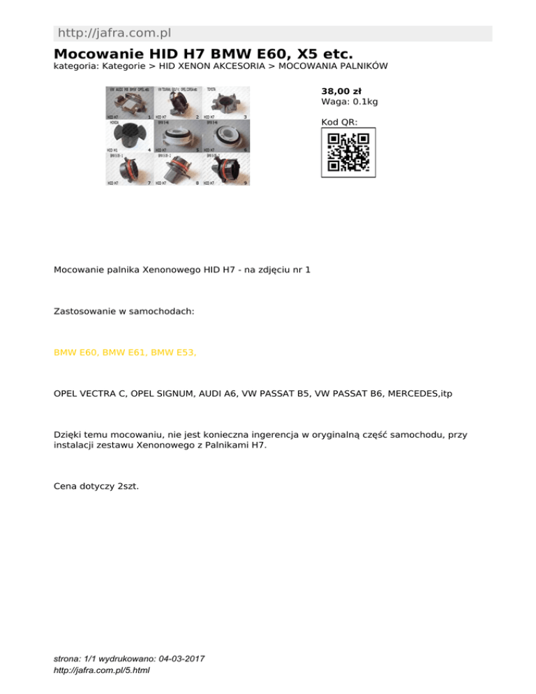 http://jafra.com.pl Mocowanie HID H7 BMW E60, X5 etc. kategoria: Kategorie > HID XENON AKCESORIA > MOCOWANIA PALNIKÓW 38,00 zł Waga: 0.1kg Kod QR: Mocowanie palnika Xenonowego HID H7 - na zdjęciu nr 1 Zastosowanie w samochodach: BMW E60, BMW E61, BMW E53, OPEL VECTRA C, OPEL SIGNUM, AUDI A6, VW PASSAT B5, VW PASSAT B6, MERCEDES,itp Dzięki temu mocowaniu, nie jest konieczna ingerencja w oryginalną część samochodu, przy instalacji zestawu Xenonowego z Palnikami H7. Cena dotyczy 2szt. strona: 1/1 wydrukowano: 04-03-2017 http://jafra.com.pl/5.html