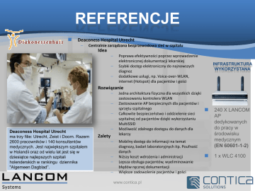 REFERENCJE Deaconess Hospital Utrecht Centralnie zarządzana bezprzewodowa sieć w szpitalu Idea Poprawa efektywności poprzez wprowadzenie elektronicznej dokumentacji lekarskiej Szybki dostęp elektroniczny do najnowszych diagnoz dodatkowe usługi, np. Voice-over-WLAN, internet (Hotspot) dla pacjentów i gości INFRASTRUKTURA WYKORZYSTANA Rozwiązanie Deaconess Hospital Utrecht ma trzy filie: Utrecht, Zeist i Doorn. Razem 2600 pracowników i 140 konsultantów medycznych. Jest największym szpitalem w Holandii oraz od wielu lat jest się w dziesiątce najlepszych szpitali holenderskich w rankingu dziennika "Algemeen Dagblad”. Zalety Jedna architektura fizyczna dla wszystkich dzięki zastosowaniu kontrolera WLAN Zastosowanie AP bezpiecznych dla pacjentów i sprzętu szpitalnego Całkowite bezpieczeństwo i oddzielenie sieci szpitalnej od pacjentów dzięki wykorzystaniu MultiSSID Możliwość zdalnego dostępu do danych dla lekarzy Mobilny dostęp do informacji na temat diagnozy, badań laboratoryjnych itp. Poufność danych Niższy koszt wdrożenia i administracji Lepsza obsługa pacjentów, wyeliminowanie błędów ręcznej dokumentacji Większe zadowolenie pacjentów i gości www.contica.pl 240 X LANCOM AP dedykowanych do pracy w środowisku medycznym (EN 60601-1-2) 1 x WLC 4100