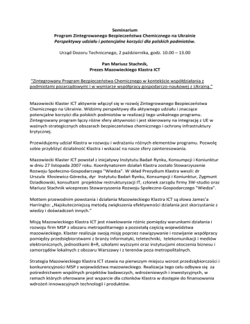 Seminarium Program Zintegrowanego Bezpieczeństwa Chemicznego na Ukrainie Perspektywy udziału i potencjalne korzyści dla polskich podmiotów. Urząd Dozoru Technicznego, 2 października, godz. 10.00 – 13.00 Pan Mariusz Stachnik, Prezes Mazowieckiego Klastra ICT "Zintegrowany Program Bezpieczeństwa Chemicznego w kontekście współdziałania z podmiotami pozarządowymi i w wymiarze współpracy gospodarczo-naukowej z Ukrainą." Mazowiecki Klaster ICT aktywnie włączył się w rozwój Zintegrowanego Bezpieczeństwa Chemicznego na Ukrainie. Widzimy perspektywy dla aktywnego udziału i znaczące potencjalne korzyści dla polskich podmiotów w realizacji tego unikalnego programu. Zintegrowany program łączy różne sfery aktywności i jest skierowany na integrację z UE w ważnych strategicznych obszarach bezpieczeństwa chemicznego i ochrony infrastruktury krytycznej. Przewidujemy udział Klastra w rozwoju i wdrażaniu różnych elementów programu. Pozwolę sobie przybliżyć działalność Klastra i wskazać na nasze sfery zainteresowania. Mazowiecki Klaster ICT powstał z inicjatywy Instytutu Badań Rynku, Konsumpcji i Koniunktur w dniu 27 listopada 2007 roku. Koordynatorem działań Klastra zostało Stowarzyszenie Rozwoju Społeczno-Gospodarczego "Wiedza". W skład Prezydium Klastra weszli: dr Urszula Kłosiewicz-Górecka, dyr Instytutu Badań Rynku, Konsumpcji i Koniunktur, Zygmunt Dziadkowski, konsultant projektów restrukturyzacji IT, członek zarządu firmy 3W-studio oraz Mariusz Stachnik wiceprezes Stowarzyszenia Rozwoju Społeczno-Gospodarczego "Wiedza". Mottem przewodnim powstania i działania Mazowieckiego Klastra ICT są słowa James’a Harringto: „Najskuteczniejszą metodą zwiększenia efektywności działania jest skorzystanie z wiedzy i doświadczeń innych.” Misją Mazowieckiego Klastra ICT jest niwelowanie różnic pomiędzy warunkami działania i rozwoju firm MSP z obszaru metropolitarnego a pozostałą częścią województwa mazowieckiego. Klaster realizuje swoją misję poprzez nawiązywanie i rozwijanie współpracy pomiędzy przedsiębiorstwami z branży informatyki, teletechniki, telekomunikacji i mediów elektronicznych, jednostkami B+R, szkołami wyższymi oraz instytucjami otoczenia biznesu i samorządów lokalnych z obszaru Warszawy i z terenów poza metropolitalnych. Strategia Mazowieckiego Klastra ICT stawia na pierwszym miejscu wzrost przedsiębiorczości i konkurencyjności MSP z województwa mazowieckiego. Realizacja tego celu odbywa się za pośrednictwem wspólnych projektów badawczych, wdrożeniowych i inwestycyjnych, w ramach których oferowane jest wsparcie dla członków Klastra w dostępie do finansowania wdrożeń innowacyjnych technologii i produktów. Te obszary naszej działalności skutecznie przenosimy na współpracę z naszymi partnerami ukraińskimi. Posiadamy rozwinięty program kontaktów z partnerami ukraińskimi, zarówno rządowymi, przemysłem i organizacjami pozarządowymi. Na etapie realizacji programu Zintegrowanego Bezpieczeństwa Chemicznego na Ukrainie kluczowe staje się staranne przygotowywanie grupy ukraińskich uczestników projektu, przedstawicieli odpowiednich instytucji, odpowiedzialnych za rozwój i realizację projektu oraz wdrażanie jego wyników. Z uwagi na fakt, iż dla zapewnienia właściwego poziomu szkolenia, wymiany najlepszych praktyk oraz wdrażania nowoczesnego zarządzania, zintegrowane ramy szkoleń dla zintegrowanego projektu, Klaster ICT proponuje przeprowadzenie szkoleń dla ukraińskich wykonawców projektu i wspólne opracowanie wstępnego studium wykonalności dla programu. Opracowanie wstępnego studium wykonalności byłoby pierwszym etapem zakrojonego na dużą skalę zaangażowania polskich podmiotów w rozwój i wdrażanie „programu zintegrowanego bezpieczeństwa chemicznego na Ukrainie” lub „zintegrowanego programu”, którego głównym celem jest opracowanie i wdrożenie programu zapewnienia bezpieczeństwa chemicznego we wszystkich obszarach działania ukraińskiego przemysłu i transportu oraz efektywnego przeciwdziałania zagrożeniom wynikającym z niepożądanego użyciu związków chemicznych. Wstępne studium wykonalności zintegrowanego programu ma umożliwić przetworzenie koncepcji projektu w konkretny program działań, odpowiadający wysokim standardom zarządzania i ściśle definiujący zawartość biznesplanu całego Projektu. Projekt ma być własnością właściwych instytucji ukraińskich, zaś jego program wymagać będzie zaangażowania wszystkich uczestników projektu, włączając w to rządy zaangażowanych krajów, organizacje międzynarodowe, centra badawcze i uczelnie oraz firmy prywatne. Realizatorzy zintegrowanego programu, którego partnerem jest Mazowiecki Klaster ICT wystąpią o fundusze w ramach programu Polska Pomoc na uzupełniający ale bardzo istotny element programu przygotowania wstępnego studium wykonalności Projektu, a mianowicie o wstępne szkolenie podstawowej grupy ukraińskich uczestników, reprezentujących głównych udziałowców projektu ze strony Ukrainy. Szkolenie ma być przeprowadzone w Polsce i na Ukrainie przez Mazowiecki Klaster ICT i przygotować partnerów ukraińskich zaangażowanych w zintegrowany program do udziału w jego opracowaniu oraz do efektywnego wdrażania opracowanych rozwiązań w swoim kraju. „Program zintegrowanego bezpieczeństwa chemicznego na Ukrainie” jest unikatowym projektem publiczno-prywatnym z szerokim poparciem międzynarodowym, bazującym na zasadach zrównoważonego rozwoju i zaawansowanego zarządzania. W ramach udziału Klastra chcemy wesprzeć opracowanie i wdrożenie odpowiednich przepisów prawnych i administracyjnych, wsparcie techniczne, a także przygotowanie kadr w celu wspierania bezpiecznej produkcji, transportu magazynowania i obrotu substancjami chemicznymi oraz wspieranie rozwoju skutecznych środków w zakresie zapobiegania, gotowości i reagowania wobec niezgodnego z 