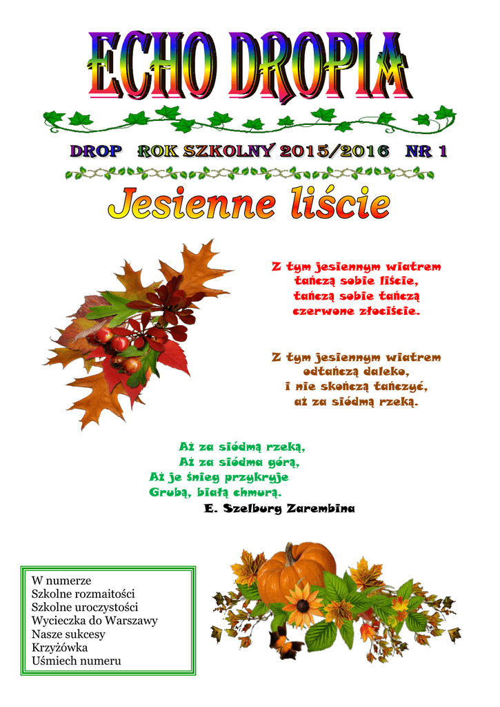 Z tym jesiennym wiatrem tańczą sobie liście, tańczą sobie tańczą czerwone złociście. Z tym jesiennym wiatrem odtańczą daleko, i nie skończą tańczyć, aż za siódmą rzeką. Aż za siódmą rzeką, Aż za siódma górą, Aż je śnieg przykryje Grubą, białą chmurą. E. Szelburg Zarembina W numerze Szkolne rozmaitości Szkolne uroczystości Wycieczka do Warszawy Nasze sukcesy Krzyżówka Uśmiech numeru Skład grona pedagogicznego w roku szkolnym 2015/2016 Stanisław Laszczka – historia, dyrektor szkoły Ewa Borys – religia, biblioteka Iwona Kościesza – oddział przedszkolny, muzyka Regina Śliwa– klasa III, kierownik świetlicy Elwira Piszczatowska – matematyka, zajęcia komputerowe, zajęcia rewalidacyjne Dorota Płochocka – przyroda, wychowanie fizyczne, wychowanie do życia w rodzinie Marzena Szczurowska – język polski, muzyka, plastyka, zajęcia techniczne Anna Wielgo– klasa II Bożena Kałuska– klasa I, wychowawca świetlicy Monika Mirosz – język angielski Hanna Ciok – zajęcia korekcyjno – kompensacyjne Ewa Charczuk – religia, pedagog specjalny Justyna Sasin - logopeda Wychowawstwa klas Oddział przedszkolny – wychowawca Iwona Kościesza Klasa pierwsza – wychowawca Bożena Kałuska Klasa druga – wychowawca Anna Wielgo Klasa trzecia – wychowawca Regina Śliwa Klasa czwarta – wychowawca Marzena Szczurowska Klasa piąta – wychowawca Dorota Płochocka Klasa szósta – wychowawca Elwira Piszczatowska Samorząd Uczniowski w roku szkolnym 2015/2016 Przewodniczący Przemysław Gers Z-ca Przewodniczącego Kacper Zagrodzki Skarbnik Zuzanna Wierzba Skład Prezydium Rady Rodziców w roku szkolnym 2015/2016 Przewodnicząca p. Agata Koseska Z-ca Przewodniczącej p. Andrzej Zagrodzki Skarbnik p. Agata Zagrodzka Sekretarz p. Rafał Gochna Skład Rady Rodziców w roku szkolnym 2015/2016 p. Andrzej Zagrodzki – oddział przedszkolny p. Katarzyna Gochna – klasa I p. Rafał Gochna– klasa II p. Agata Zagrodzka – klasa III p. Agata Koseska – klasa IV p. Sylwia Piotrowska – klasa V p. Beata Dobrowolska – klasa VI Francuzi mawiają: bon ton, savoir-vivre, faux pas, czyli w (do)wolnym tłumaczeniu: kultura na co dzień przenigdy nie bodzie! W tym roku szkolnym szczególną uwagę zwracamy na kulturę osobistą uczniów. Zachęcamy do stosowania na co dzień pięciu magicznych słów: PROSZĘ, DZIĘKUJĘ, PRZEPRASZAM, DZIEŃ DOBRY, DO WIDZENIA. To nie prima aprilis. To nie jest wiosenny kwiat. Chociaż łudząco podobny jest do wiosennego krokusa to nim nie jest. Kwiat ten to ZIMOWIT – zakwita w połowie września i jest zwiastunem jesieni, a nawet zimy, stąd jego nazwa. Jest to wieloletni kwiat cebulkowy posadzony przez dzieci z oddziału przedszkolnego. Dzieci z „zerówki” wraz z opiekunem każdego roku sadzą inne sadzonki realizując program np. „Dzień hiacynta” – wtedy sadzą hiacynty, „Dzień tulipana” i inne. Rabatka znajduje się przy wejściu do budynku, w którym uczą się dzieci z oddziału przedszkolnego. Najpiękniejsze okazy borowików można znaleźć tylko w Dropiu. Borowik szlachetny przedstawiony na zdjęciu został znaleziony przez uczniów klasy drugiej na boisku szkolnym. W pobliskich lasach można spotkać również inne grzyby, m.in.: podgrzybki, maślaki, koźlaki oraz na obrzeżach lasów przepiękne kanie. ALE UWAGA! Nie pomylcie kani z muchomorem sromotnikowym, zwanym „leśną śmiercią”, który w naszych lasach występuje bardzo licznie. Nasza rada: Jeśli nie jesteście pewni, czy grzyb jest jadalny czy trujący, zostawcie go w lesie. Po raz pierwszy nauczyciele, pracownicy, rodzice i uczniowie Szkoły Podstawowej im. Piotra Wysockiego w Dropiu wzięli aktywny udział w dożynkach gminnych. Pani Barbara Kalata z ogromnym zaangażowaniem wykonała przepiękny wieniec dożynkowy, który w konkursie na „Najpiękniejszy wieniec” zdobył IV miejsce. Otrzymaną nagrodę pieniężną przeznaczono na zakup piłek. Uczniowie bardzo chętnie zgłosili się do korowodu dożynkowego i godnie reprezentowali naszą szkołę. Chłopcy ubrani byli na galowo, a dziewczęta w jednakowe stroje przygotowane przez p. Bożenę Kałuską. Nauczyciele i Dyrektor przygotowali dekoracje kwiatowe na stoły. Aktywny udział w lokalnych uroczystościach jest okazją do wspólnych spotkań, nawiązywania wzajemnej współpracy. 18 września 2015 r. uczniowie naszej szkoły po raz kolejny wzięli aktywny udział w ogólnopolskiej akcji Sprzątanie Świata, która w tym roku przebiegała pod hasłem „Wyprawa – poprawa”. Dzieciaki z klas 0 -III uczestniczyły w ciekawych zajęciach i zabawach ze śmieciami w roli głównej. Okazało się, że wszystkie dzieci doskonale wiedzą, iż należy dbać o czystość środowiska; znają skutki pozostawiania śmieci w parku, na placu zabaw, w lesie czy na ulicy; odróżniają środowisko zdrowe od zanieczyszczonego. Wiedzą, co to jest recykling i segregacja śmieci. Potrafią bezbłędnie posegregować śmieci i wrzucić do odpowiednio oznakowanych worków. Po tak gruntownym przygotowaniu dzieciaki „uzbrojone” w rękawiczki i worki, w które zaopatrzył nas urząd gminy, ruszyły do akcji sprzątania. Ani jeden śmieć nie uszedł ich uwadze. Maluchy skrupulatnie metr po metrze oczyściły teren wokół naszej szkoły. Uczniowie klas IV – VI wraz z wychowawcami porządkowali teren w najbliższej okolicy szkoły, segregując śmieci do kolorowych worków. Po ciężkiej pracy na wszystkich czekał poczęstunek. Każdy otrzymał banana i butelkę wody. Wszyscy uczestnicy akcji byli bardzo dumni, ponieważ dzięki nim świat stał się piękniejszy, a człowiek nadal może cieszyć się pięknem otaczającej nas przyrody. Zgodnie z tradycją 14 października w naszej szkole odbyło się uroczyste pasowanie na ucznia. Część artystyczną przygotowała p. Bożena Kałuska. Na uroczystość pasowania zaproszeni zostali : dyrektor, wychowawcy, nauczyciele, uczniowie