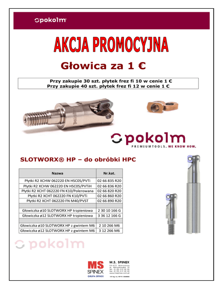 Głowica za 1 € Przy zakupie 30 szt. płytek frez fi 10 w cenie 1 € Przy zakupie 40 szt. płytek frez fi 12 w cenie 1 € SLOTWORX® HP – do obróbki HPC Nazwa Nr.kat. Płytki R2 XCHW 062220 EN HSC05/PVTi Płytki R2 XCHW 062220 EN HSC05/PVTiH Płytki R2 XCHT 062220 FN K10/Polerowana Płytki R2 XCHT 062220 FN K10/PVTi Płytki R2 XCHT 062220 FN M40/PVST 02 66 835 R20 02 66 836 R20 02 66 820 R20 02 66 860 R20 02 66 890 R20 Głowiczka ø10 SLOTWORX HP trzpieniowa Głowiczka ø12 SLOTWORX HP trzpieniowa 2 30 10 166 G 3 36 12 166 G Głowiczka ø10 SLOTWORX HP z gwintem M6 2 10 266 M6 Głowiczka ø12 SLOTWORX HP z gwintem M6 3 12 266 M6 SLOTWORX ® HP - narzędzie do obróbki wysokowydajnej HighPerformance. Główne zalety : - obróbka High Feed z dużymi posuwami (HF), - prędkości skrawania do Vc=300m/min Cechy narzędzia: - rzeczywisty promień naroża R2 – umożliwia obróbkę 3D - 3º wyluzowanie pozycji płytki (Kappa 93º), przydatne na dużych wysięgach - 11º wyluzowania dla optymalnej obróbki stali hartowanych - negatywowe gniazdo płytki dla zapewnienia lepszej stabilności w obróbce - cyrkulacyjne lub wgłębne osiowe zagłębianie - do obróbki stali, stali hartowanych, żeliwa, grafitu (płytka z pokryciem diamentowym) Konstrukcja głowicy oparta jest o system kieszeniowej obsady płytek, który zapewnia umieszczenie płytki skrawającej w pasowanej kieszeni wykonanej w korpusie głowicy. Dzięki takiej formie pozycjonowania płytki siły skrawania nie przenoszą się na śrubę mocującą i gwint lecz na korpus głowicy. Negatywowe ustawienie płytki w gnieździe w przypadku zastosowania w obróbce HP zapewnia większą stabilność obróbczą narzędzia. Kąt Kappa 93º zapewnia obniżenie sił promieniowych podczas frezowania rowków i ścian do kąta prostego. Płytki skrawające wykonane zostały z węglika spiekanego w gatunku HSC05 co pozwala na zastosowanie wysokich prędkości skrawania w strategii HSC oraz wydajnej obróbki stali hartownych. Zastosowanie pokryć PVTI, PVTiH oraz PVDIaN daje możliwość wydajnego wykorzystania narzędzia w materiałach takich jak: stale, żeliwa, stale hartowane czy stopy nieżelazne. Zastosowany rzeczywisty promień płytki R2 daje szersze możliwości jego wykorzystania. Dzięki pełnemu promieniowi SLOTWORX ® HP posiada geometrię narzędzia torusowego i świetnie sprawdza się przy obróbce 3D. Wszelkie informacje techniczne uzyskają Państwo poprzez kontakt z naszymi Przedstawicielami Terenowymi lub poprzez kontakt z biurem MS Spinex. MS SPINEX Ul. Klimontowska 19 04-672 Warszawa www.msspinex.com.pl tel. 0 22 512 50 10 fax. 0 22 512 50 50