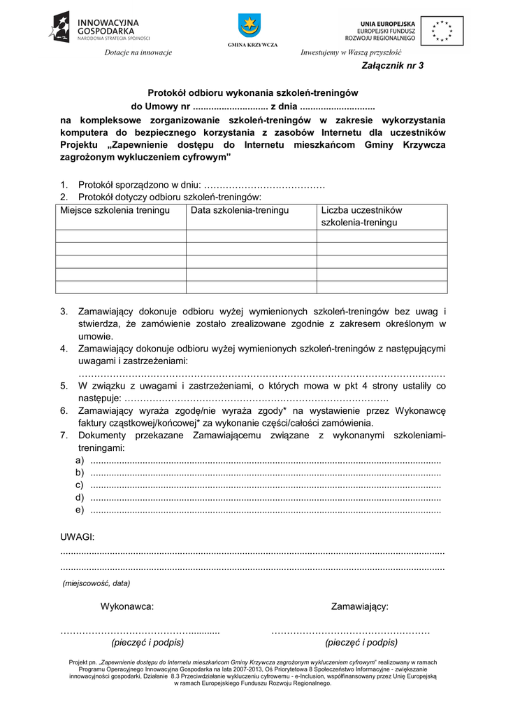 GMINA KRZYWCZA Dotacje na innowacje Inwestujemy w Waszą przyszłość Załącznik nr 3 Protokół odbioru wykonania szkoleń-treningów do Umowy nr ............................. z dnia ............................. na kompleksowe zorganizowanie szkoleń-treningów w zakresie wykorzystania komputera do bezpiecznego korzystania z zasobów Internetu dla uczestników Projektu „Zapewnienie dostępu do Internetu mieszkańcom Gminy Krzywcza zagrożonym wykluczeniem cyfrowym” 1. Protokół sporządzono w dniu: ………………………………… 2. Protokół dotyczy odbioru szkoleń-treningów: Miejsce szkolenia treningu Data szkolenia-treningu Liczba uczestników szkolenia-treningu 3. 4. 5. 6. 7. Zamawiający dokonuje odbioru wyżej wymienionych szkoleń-treningów bez uwag i stwierdza, że zamówienie zostało zrealizowane zgodnie z zakresem określonym w umowie. Zamawiający dokonuje odbioru wyżej wymienionych szkoleń-treningów z następującymi uwagami i zastrzeżeniami: …………………………………………………………………………………………………….… W związku z uwagami i zastrzeżeniami, o których mowa w pkt 4 strony ustaliły co następuje: …………………………………………………………………………. Zamawiający wyraża zgodę/nie wyraża zgody* na wystawienie przez Wykonawcę faktury cząstkowej/końcowej* za wykonanie części/całości zamówienia. Dokumenty przekazane Zamawiającemu związane z wykonanymi szkoleniamitreningami: a) ....................................................................................................................................... b) ....................................................................................................................................... c) ....................................................................................................................................... d) ....................................................................................................................................... e) ....................................................................................................................................... UWAGI: .................................................................................................................................................... .................................................................................................................................................... (miejscowość, data) Wykonawca: ……………………………………........... (pieczęć i podpis) Zamawiający: …………………………………………… (pieczęć i podpis) Projekt pn. „Zapewnienie dostępu do Internetu mieszkańcom Gminy Krzywcza zagrożonym wykluczeniem cyfrowym” realizowany w ramach Programu Operacyjnego Innowacyjna Gospodarka na lata 2007-2013, Oś Priorytetowa 8 Społeczeństwo Informacyjne - zwiększanie innowacyjności gospodarki, Działanie 8.3 Przeciwdziałanie wykluczeniu cyfrowemu - e-Inclusion, współfinansowany przez Unię Europejską w ramach Europejskiego Funduszu Rozwoju Regionalnego.