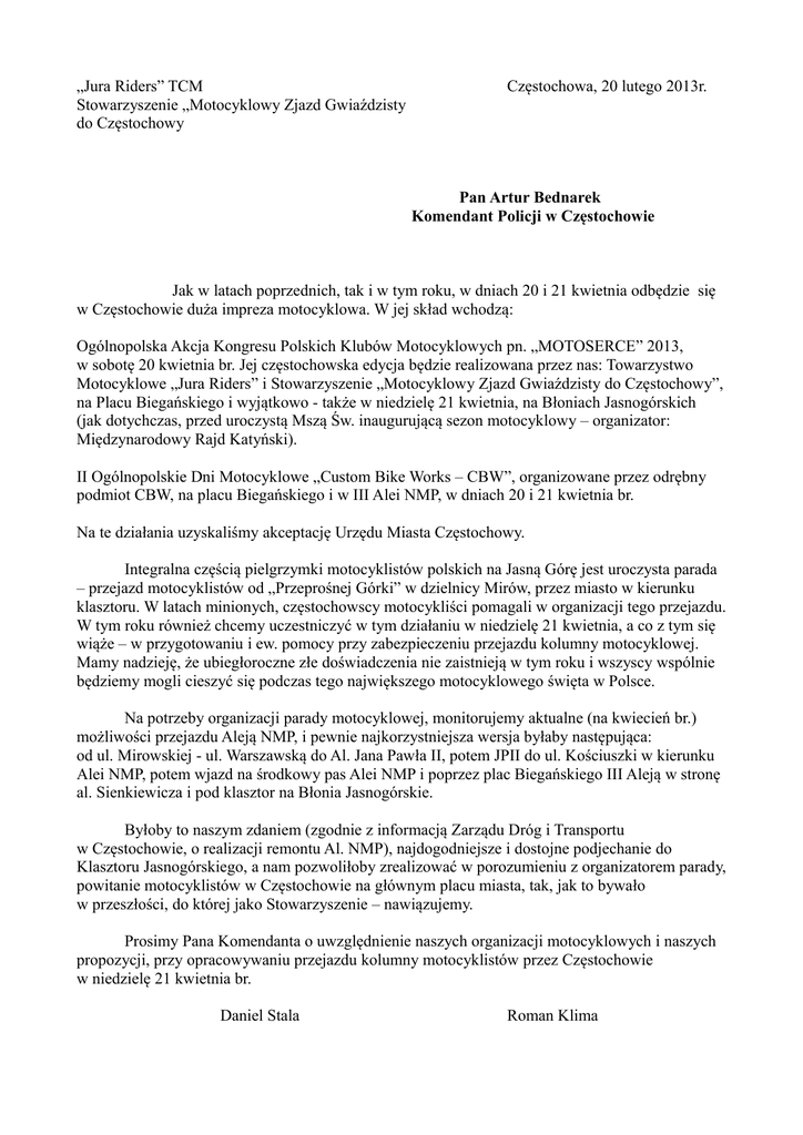 „Jura Riders” TCM Stowarzyszenie „Motocyklowy Zjazd Gwiaździsty do Częstochowy Częstochowa, 20 lutego 2013r. Pan Artur Bednarek Komendant Policji w Częstochowie Jak w latach poprzednich, tak i w tym roku, w dniach 20 i 21 kwietnia odbędzie się w Częstochowie duża impreza motocyklowa. W jej skład wchodzą: Ogólnopolska Akcja Kongresu Polskich Klubów Motocyklowych pn. „MOTOSERCE” 2013, w sobotę 20 kwietnia br. Jej częstochowska edycja będzie realizowana przez nas: Towarzystwo Motocyklowe „Jura Riders” i Stowarzyszenie „Motocyklowy Zjazd Gwiaździsty do Częstochowy”, na Placu Biegańskiego i wyjątkowo - także w niedzielę 21 kwietnia, na Błoniach Jasnogórskich (jak dotychczas, przed uroczystą Mszą Św. inaugurującą sezon motocyklowy – organizator: Międzynarodowy Rajd Katyński). II Ogólnopolskie Dni Motocyklowe „Custom Bike Works – CBW”, organizowane przez odrębny podmiot CBW, na placu Biegańskiego i w III Alei NMP, w dniach 20 i 21 kwietnia br. Na te działania uzyskaliśmy akceptację Urzędu Miasta Częstochowy. Integralna częścią pielgrzymki motocyklistów polskich na Jasną Górę jest uroczysta parada – przejazd motocyklistów od „Przeprośnej Górki” w dzielnicy Mirów, przez miasto w kierunku klasztoru. W latach minionych, częstochowscy motocykliści pomagali w organizacji tego przejazdu. W tym roku również chcemy uczestniczyć w tym działaniu w niedzielę 21 kwietnia, a co z tym się wiąże – w przygotowaniu i ew. pomocy przy zabezpieczeniu przejazdu kolumny motocyklowej. Mamy nadzieję, że ubiegłoroczne złe doświadczenia nie zaistnieją w tym roku i wszyscy wspólnie będziemy mogli cieszyć się podczas tego największego motocyklowego święta w Polsce. Na potrzeby organizacji parady motocyklowej, monitorujemy aktualne (na kwiecień br.) możliwości przejazdu Aleją NMP, i pewnie najkorzystniejsza wersja byłaby następująca: od ul. Mirowskiej - ul. Warszawską do Al. Jana Pawła II, potem JPII do ul. Kościuszki w kierunku Alei NMP, potem wjazd na środkowy pas Alei NMP i poprzez plac Biegańskiego III Aleją w stronę al. Sienkiewicza i pod klasztor na Błonia Jasnogórskie. Byłoby to naszym zdaniem (zgodnie z informacją Zarządu Dróg i Transportu w Częstochowie, o realizacji remontu Al. NMP), najdogodniejsze i dostojne podjechanie do Klasztoru Jasnogórskiego, a nam pozwoliłoby zrealizować w porozumieniu z organizatorem parady, powitanie motocyklistów w Częstochowie na głównym placu miasta, tak, jak to bywało w przeszłości, do której jako Stowarzyszenie – nawiązujemy. Prosimy Pana Komendanta o uwzględnienie naszych organizacji motocyklowych i naszych propozycji, przy opracowywaniu przejazdu kolumny motocyklistów przez Częstochowie w niedzielę 21 kwietnia br. Daniel Stala Roman Klima