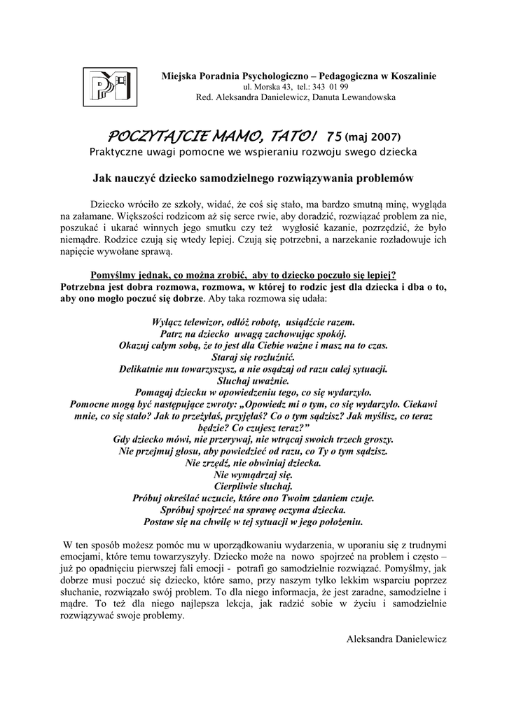 Miejska Poradnia Psychologiczno – Pedagogiczna w Koszalinie ul. Morska 43, tel.: 343 01 99 Red. Aleksandra Danielewicz, Danuta Lewandowska POCZYTAJCIE MAMO, TATO! 75 (maj 2007) Praktyczne uwagi pomocne we wspieraniu rozwoju swego dziecka Jak nauczyć dziecko samodzielnego rozwiązywania problemów Dziecko wróciło ze szkoły, widać, że coś się stało, ma bardzo smutną minę, wygląda na załamane. Większości rodzicom aż się serce rwie, aby doradzić, rozwiązać problem za nie, poszukać i ukarać winnych jego smutku czy też wygłosić kazanie, pozrzędzić, że było niemądre. Rodzice czują się wtedy lepiej. Czują się potrzebni, a narzekanie rozładowuje ich napięcie wywołane sprawą. Pomyślmy jednak, co można zrobić, aby to dziecko poczuło się lepiej? Potrzebna jest dobra rozmowa, rozmowa, w której to rodzic jest dla dziecka i dba o to, aby ono mogło poczuć się dobrze. Aby taka rozmowa się udała: Wyłącz telewizor, odłóż robotę, usiądźcie razem. Patrz na dziecko uwagą zachowując spokój. Okazuj całym sobą, że to jest dla Ciebie ważne i masz na to czas. Staraj się rozluźnić. Delikatnie mu towarzyszysz, a nie osądzaj od razu całej sytuacji. Słuchaj uważnie. Pomagaj dziecku w opowiedzeniu tego, co się wydarzyło. Pomocne mogą być następujące zwroty: „Opowiedz mi o tym, co się wydarzyło. Ciekawi mnie, co się stało? Jak to przeżyłaś, przyjęłaś? Co o tym sądzisz? Jak myślisz, co teraz będzie? Co czujesz teraz?” Gdy dziecko mówi, nie przerywaj, nie wtrącaj swoich trzech groszy. Nie przejmuj głosu, aby powiedzieć od razu, co Ty o tym sądzisz. Nie zrzędź, nie obwiniaj dziecka. Nie wymądrzaj się. Cierpliwie słuchaj. Próbuj określać uczucie, które ono Twoim zdaniem czuje. Spróbuj spojrzeć na sprawę oczyma dziecka. Postaw się na chwilę w tej sytuacji w jego położeniu. W ten sposób możesz pomóc mu w uporządkowaniu wydarzenia, w uporaniu się z trudnymi emocjami, które temu towarzyszyły. Dziecko może na nowo spojrzeć na problem i często – już po opadnięciu pierwszej fali emocji - potrafi go samodzielnie rozwiązać. Pomyślmy, jak dobrze musi poczuć się dziecko, które samo, przy naszym tylko lekkim wsparciu poprzez słuchanie, rozwiązało swój problem. To dla niego informacja, że jest zaradne, samodzielne i mądre. To też dla niego najlepsza lekcja, jak radzić sobie w życiu i samodzielnie rozwiązywać swoje problemy. Aleksandra Danielewicz Miejska Poradnia Psychologiczno – Pedagogiczna w Koszalinie ul. Morska 43, tel.: 343 01 99 Red. Aleksandra Danielewicz, Danuta Lewandowska POCZYTAJCIE MAMO, TATO! 75 (maj 2007) Praktyczne uwagi pomocne we wspieraniu rozwoju swego dziecka Bobek Jest dwadzieścia minut po wyznaczonym czasie. Wchodzi mama, a przed nią, Bobek, lat 4, rezolutny, dobrze mówiący, bystry chłopiec. Mama przyprowadziła go do poradni, bo się nie słucha ani jej, ani nikogo w domu. Jest taki mądry, wszyscy go kochają, a on się nie słucha. Nie wiadomo, co zrobić - mówi kobieta jednocześnie przewieszając bez pytania moją marynarkę na inny wieszak i wieszając w tym miejscu swoją. Bobek dzielnie wkracza do gabinetu i dopada półki z zabawkami. Bierze bez pytania samochodziki, wysypuje z pojemnika drobne zabawki. Po chwili otwiera torebkę mamy i wyjmuje portfel. Mama nie reaguje, ja czekam, co zrobi. Bobek porzuca maminą torebkę i podchodzi teraz do biurka. Bez pytania bierze do ręki stoper pytając co to? i już sięgając drugą ręką po leżące tuż obok kredki. Wyjaśniam, jak działa stoper i przy okazji mówię, że będę zadowolona, gdy spyta mnie, czy może wziąć to, co go ciekawi. Wydostaję z szuflady biały arkusz – weź kredki i kartkę, narysuj, co chcesz. Patrzy na mnie zaskoczony, ale kiwa głową ze zrozumieniem. Kobietę oblewa rumieniec. Zorientowała się, że powinna była zareagować. Cieszę się w duchu, że to mądra, choć roztargniona osoba. Mama Bobka zaczyna chaotycznie tłumaczyć się ze spóźnienia. Opowiada o synu, jaki jest zdolny, mądry i jakie szczęście daje całej rodzinie. Taka zmiana w jej wypowiedziach to dobra prognoza. Widać, że kobieta kocha swojego synka, tylko boi się stawiać mu granice, uczyć go zasad. Bobek z zaangażowaniem rysuje domek. Po chwili pyta, czy może dostać gumkę, bo chce coś poprawić w rysunku. Uśmiecham się do niego i podaję. Do gabinetu puka następna osoba. Musimy kończyć. Zabrakło czasu, więc wyznaczam nowy termin. Mama zmieszana obiecuje, że się nie spóźni i poleca Bobkowi odłożenie kredek i gumki do pudełka. Wychodzą mimo wszystko uśmiechnięci. Danuta Lewandowska <<<<<<<<<<<<<<<<<<<<<<<<<POLECAMY>>>>>>>>>>>>>>>>>>>>>> B. Jakubowska: „Jak mądrze kochać dzieci. Poradnik dla zagubionych rodziców”, wyd. WAB Warszawa 2001 Często myślimy, że jako rodzice jesteśmy beznadziejni. Nie radzimy sobie z dziećmi, ich agresją, buntem, nadmierną samodzielnością. Zdarza się też, że obarczamy je własnymi problemami, zaniedbujemy lub ranimy. Jak sobie radzić w takich przypadkach, co zrobić, by nie zawieść zaufania, które dzieci w nas pokładają? Może nam pomoc ta książka. Porady są tym bardziej cenne i rzeczowe, że są poparte opisami konkretnych sytuacji. To naprawdę dobry poradnik! Agnieszka Jakielaszek