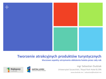 + Tworzenie atrakcyjnych produktów turystycznych kluczowe aspekty utrzymania obłożenia hotelu przez cały rok mgr Sebastian Dudziak Uniwersytet Szczeciński / Royal Park Hotel & SPA www.dudziak.me | [email protected] + Segmentacja rynku turystycznego Segmentacja rynku to podział na względnie jednorodne grupy konsumentów posiadających wspólne cechy, a różniące się reakcjami na dany produkt Celem segmentacji rynku jest dostosowanie ofert do wyodrębnionych grup konsumentów, których członkowie reprezentują inne potrzeby, preferencje i motywy podróżowania. Dokonując segmentacji rynku turystycznego należy wyróżnić cechy obiektywne konsumenta - tzw. kryteria segmentacji. www.dudziak.me + Kryteria segmentacji rynku Kryterium geograficzne: miejsce zamieszkania (miasto, wieś) wielkość miasta klimat ukształtowanie terenu Kryterium demograficzne: wiek płeć rasa wyznanie (np.: różne sposoby żywienia) pochodzenie etniczne wykształcenie stan cywilny zdrowie budowa ciała Kryterium społeczne: klasa społeczna styl życia stadium życia rodzinnego osobowość Kryterium ekonomiczne: zawód dochód na osobę dochód gospodarstwa domowego źródła dochodów Przyczyny podróżowania: odwiedziny krewnych, znajomych poznanie innych kultur, tradycji zwiedzanie zabytków, krajów żądza przygód chęć uprawiania sportu chęć poprawy zdrowia nauka i doskonalenie kwalifikacji www.dudziak.me + Identyfikacja potrzeb klientów POTRZEBY: Nocleg, wyżywienie, bezpieczeństwo WYMAGANIA: Kategoria hotelu, standard, lokalizacja OCZEKIWANIA: Spełnienie wymagań, klimat obiektu, kultura, profesjonalizm personelu, identyfikacja i realizacja potrzeb, komunikacja, czystość, wygoda, cena Słuchaj swoich klientów i uświadamiaj im ich potrzeby www.dudziak.me + Tematy do dyskusji: Jaki klient odwiedza nadmorskie miejscowości turystyczne w sezonie, a jaki poza sezonem? + Zadanie: Wymień jak najwięcej metod promowania ofert turystycznych, np. Last Minute www.dudziak.me + Rozwiązanie Przykładowe metody promowania ofert turystycznych: Oferta z rabatem Last minute First minute Punkty za usługi 1+1=3 (dodatkowa doba gratis) Bonus do noclegu (obiadokolacja, masaż, parking) www.dudziak.me + Dystrybucja usług turystycznych www.dudziak.me + Zadanie: Wymień znane Ci nowoczesne kanały sprzedaży produktów turystycznych www.dudziak.me + Nowoczesne kanały sprzedaży produktów turystycznych Strona internetowa hotelu (booking engine) Internetowe Biura Podróży (np. Rainbow Tours) Globalne Systemy Dystrybucji (GDS, np. FRU.pl) Systemy rezerwacji On-Line (np. Booking.com) Serwisy zakupów grupowych (np. Groupon) Media społecznościowe (np. Facebook) Aplikacje mobilne (np. Ibis Hotels) www.dudziak.me