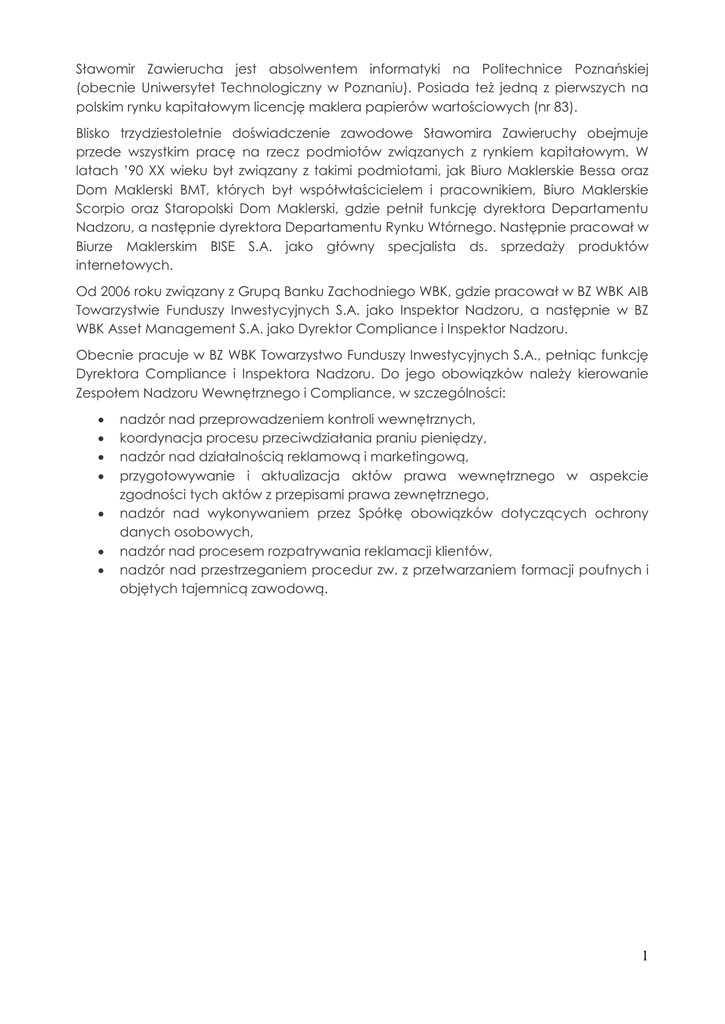 Sławomir Zawierucha jest absolwentem informatyki na Politechnice Poznańskiej (obecnie Uniwersytet Technologiczny w Poznaniu). Posiada też jedną z pierwszych na polskim rynku kapitałowym licencję maklera papierów wartościowych (nr 83). Blisko trzydziestoletnie doświadczenie zawodowe Sławomira Zawieruchy obejmuje przede wszystkim pracę na rzecz podmiotów związanych z rynkiem kapitałowym. W latach ’90 XX wieku był związany z takimi podmiotami, jak Biuro Maklerskie Bessa oraz Dom Maklerski BMT, których był współwłaścicielem i pracownikiem, Biuro Maklerskie Scorpio oraz Staropolski Dom Maklerski, gdzie pełnił funkcję dyrektora Departamentu Nadzoru, a następnie dyrektora Departamentu Rynku Wtórnego. Następnie pracował w Biurze Maklerskim BISE S.A. jako główny specjalista ds. sprzedaży produktów internetowych. Od 2006 roku związany z Grupą Banku Zachodniego WBK, gdzie pracował w BZ WBK AIB Towarzystwie Funduszy Inwestycyjnych S.A. jako Inspektor Nadzoru, a następnie w BZ WBK Asset Management S.A. jako Dyrektor Compliance i Inspektor Nadzoru. Obecnie pracuje w BZ WBK Towarzystwo Funduszy Inwestycyjnych S.A., pełniąc funkcję Dyrektora Compliance i Inspektora Nadzoru. Do jego obowiązków należy kierowanie Zespołem Nadzoru Wewnętrznego i Compliance, w szczególności: nadzór nad przeprowadzeniem kontroli wewnętrznych, koordynacja procesu przeciwdziałania praniu pieniędzy, nadzór nad działalnością reklamową i marketingową, przygotowywanie i aktualizacja aktów prawa wewnętrznego w aspekcie zgodności tych aktów z przepisami prawa zewnętrznego, nadzór nad wykonywaniem przez Spółkę obowiązków dotyczących ochrony danych osobowych, nadzór nad procesem rozpatrywania reklamacji klientów, nadzór nad przestrzeganiem procedur zw. z przetwarzaniem formacji poufnych i objętych tajemnicą zawodową. 1