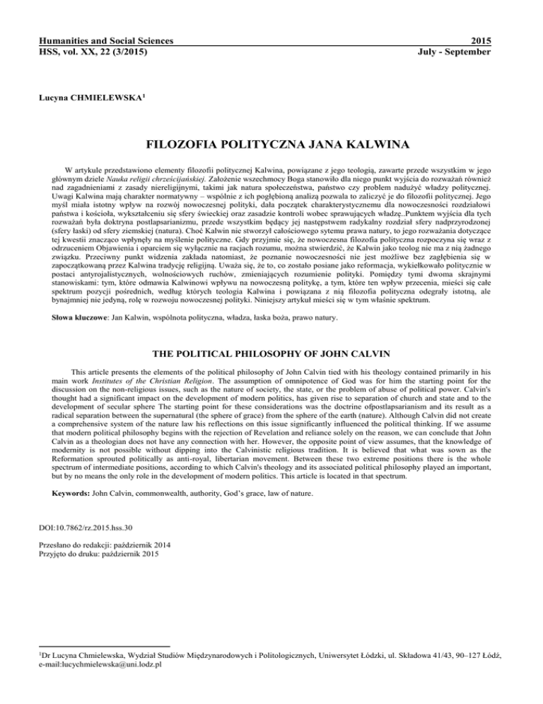 FILOZOFIA POLITYCZNA JANA KALWINA
