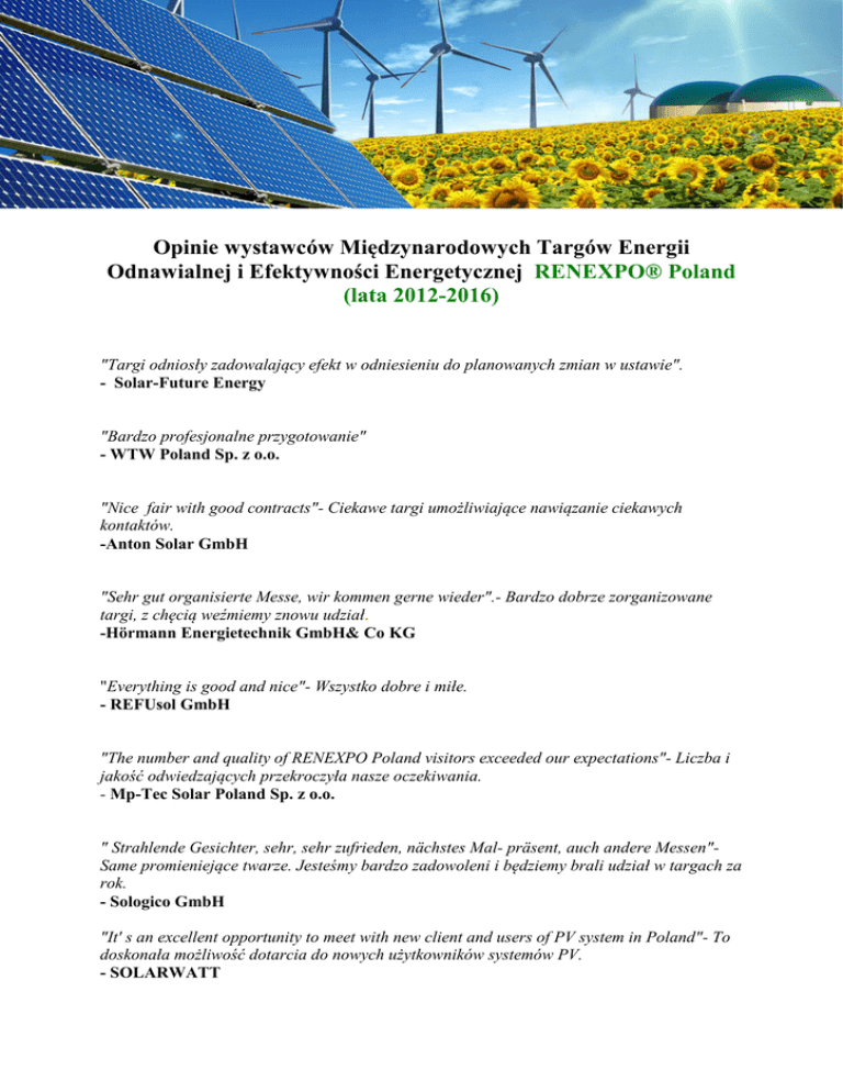 Opinie wystawców Międzynarodowych Targów Energii Odnawialnej i Efektywności Energetycznej RENEXPO® Poland (lata 2012-2016) "Targi odniosły zadowalający efekt w odniesieniu do planowanych zmian w ustawie". - Solar-Future Energy "Bardzo profesjonalne przygotowanie" - WTW Poland Sp. z o.o. "Nice fair with good contracts"- Ciekawe targi umożliwiające nawiązanie ciekawych kontaktów. -Anton Solar GmbH "Sehr gut organisierte Messe, wir kommen gerne wieder".- Bardzo dobrze zorganizowane targi, z chęcią weźmiemy znowu udział. -Hörmann Energietechnik GmbH& Co KG "Everything is good and nice"- Wszystko dobre i miłe. - REFUsol GmbH "The number and quality of RENEXPO Poland visitors exceeded our expectations"- Liczba i jakość odwiedzających przekroczyła nasze oczekiwania. - Mp-Tec Solar Poland Sp. z o.o. " Strahlende Gesichter, sehr, sehr zufrieden, nächstes Mal- präsent, auch andere Messen"Same promieniejące twarze. Jesteśmy bardzo zadowoleni i będziemy brali udział w targach za rok. - Sologico GmbH "It' s an excellent opportunity to meet with new client and users of PV system in Poland"- To doskonała możliwość dotarcia do nowych użytkowników systemów PV. - SOLARWATT "Good information and follow ups". - Dobra obsługa i wsparcie. - Swedish Exergy AB "Very good, above our expetations". - Jesteśmy bardzo zadowoleni, targi przerosły nasze oczekiwania" - Jetion Solar (China) Co., Ltd. "Good exhibition, right place". - Dobra wystawa, dobre miejsce. - Platinum GmbH "Duże zadowolenie z przygotowania targów przez organizatorów". - Rehau Energy Solutions GmbH "Guite good. No complaints". - Alusin Solar "Profesjonalna obsługa targowa połączona z dużą wiedzą techniczną". - Thermaflex "Wszystko ok". - Galmet Sp. Z o. o. "W tym roku mieliśmy okazję po raz pierwszy wystawiać się na RENEXPO. To był bardzo udany debiut, ponieważ nasze stoisko cieszyło się dużym zainteresowaniem,. Targi były bardzo dobrą okazją na prezentacje naszej oferty. Jeszcze podczas wystawy zawarliśmy kilka ciekawych kontraktów". - Paweł Wiktorowicz, Project Manager, Corab Sp. Z o.o. "Inicjatywa jak najbardziej godna polecenia i powinna byc rozpropagowana nie tylko wśród firm z branży, ale w jak najszerszym spektrum zastosowania informacji z OZE". - Daikin Airconditioning Poland Sp. z o.o. "Rzetelna i profesjonalna obsługa". - Krajowa Izba Gospodarcza ''To był bardzo dobry wybór. Organizatorzy wykazali się pełnym profesjonalizmem i zadbali o najmniejszy szczegół. Dopisali zwiedzający, z których znakomita część stanowiła naszą grupę docelową. Z całą pewnością możemy stwierdzić, że miniona edycja targów należała z naszego punktu widzenia do bardzo udanych.'' - PV Kits Direct ''Jesteśmy bardzo zadowoleni z tegorocznego uczestnictwa w targach. Nawiązaliśmy wiele kontaktów, które – mamy nadzieję – okażą się owocne w skutkach. Na pochwałę zasługuje również cały zespół targów, który stanął na wysokości zadania, zapewniając sprawną obsługę i rzetelną informację nie tylko podczas rozmów wstępnych, ale również przez trzy dni trwania targów.'' - NOVEAIDEA