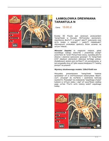 ŁAMIGŁOWKA DREWNIANA TARANTULA N Cena: 15.00 zł Eureka 3D Puzzle jest cenionym producentem ?amig?ówek w Europie. Ró?norodny asortyment, niezmienna dba?o?? o wysok? jako?? wykonania oraz du?a troska o estetyk? i warto?? intelektualn? oferowanych produktów zjedna?y firmie uznanie na ca?ym ?wiecie. Warsztat Gepetto to magiczne miejsce, gdzie wszelkiego rodzaju zwierz?ta i przedmioty zostaj? powo?ane do ?ycia! Pomys?owe wzory, wysokiej jako?ci drewno i staranne wykonanie sprawiaj?, ?e ?amig?ówki b?d? idealnym elementem dekoracji ka?dego pokoju. Dodatkowym atutem jest mo?liwo?? ich pomalowania, w tym przypadku liczy si? tylko wasza kreatywno??! ?wietny pomys? na prezent! Wymiary zbudowanego modelu: 220x215x85 mm Wszystkie prezentowane ?amig?ówki ?wietnie sprawdzaj? si? w zró?nicowanym towarzystwie. Bawi?, ucz?, zmuszaj? do my?lenia i uwolnienia twórczej wyobra?ni. Pozwalaj? na znalezienie "wspólnego j?zyka" ludziom w ró?nym wieku i staj? si? pocz?tkiem wielkiej pasji, cz?sto ??cz?c ca?e rodziny wokó? wspólnego hobby. 1/1 Powered by TCPDF (www.tcpdf.org)