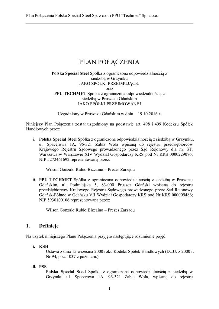 Plan Połączenia Polska Special Steel Sp. z o.o. i PPU ”Techmet” Sp. z o.o. PLAN POŁĄCZENIA Polska Special Steel Spółka z ograniczona odpowiedzialnością z siedzibą w Grzymku JAKO SPÓŁKI PRZEJMUJĄCEJ oraz PPU TECHMET Spółka z ograniczona odpowiedzialnością z siedzibą w Pruszczu Gdańskim JAKO SPÓŁKI PRZEJMOWANEJ Uzgodniony w Pruszczu Gdańskim w dniu 19.10.2016 r. Niniejszy Plan Połączenia został uzgodniony na podstawie art. 498 i 499 Kodeksu Spółek Handlowych przez: i. Polska Special Steel Spółka z ograniczona odpowiedzialnością z siedzibą w Grzymku, ul. Spacerowa 1A, 96-321 Żabia Wola wpisaną do rejestru przedsiębiorców Krajowego Rejestru Sądowego prowadzonego przez Sąd Rejonowy dla m. ST. Warszawa w Warszawie XIV Wydział Gospodarczy KRS pod Nr KRS 0000229076; NIP 5272461692 reprezentowaną przez: Wilson Gonzalo Rubio Bizcaino – Prezes Zarządu ii. PPU TECHMET Spółka z ograniczona odpowiedzialnością z siedzibą w Pruszczu Gdańskim, ul. Podmiejska 5, 83-000 Pruszcz Gdański wpisaną do rejestru przedsiębiorców Krajowego Rejestru Sądowego prowadzonego przez Sąd Rejonowy Gdańsk-Północ w Gdańsku VII Wydział Gospodarczy KRS pod Nr KRS 000009486; NIP 5930100106 reprezentowaną przez: Wilson Gonzalo Rubio Bizcaino – Prezes Zarządu 1. Definicje Na użytek niniejszego Planu Połączenia przyjęto następujące rozumienie pojęć: i. KSH Ustawa z dnia 15 września 2000 roku Kodeks Spółek Handlowych (Dz.U. z 2000 r. Nr 94, poz. 1037 z późn. zm.) ii. PSS Polska Special Steel Spółka z ograniczona odpowiedzialnością z siedzibą w Grzymku ul. Spacerowa 1A, 96-321 Żabia Wola, wpisaną do rejestru 1 Plan Połączenia Polska Special Steel Sp. z o.o. i PPU ”Techmet” Sp. z o.o. przedsiębiorców Krajowego Rejestru Sądowego prowadzonego przez Sąd Rejonowy dla m. ST. Warszawa w Warszawie XIV Wydział Gospodarczy KRS pod Nr KRS 0000229076; NIP 5272461692 iii. Techmet Przedsiębiorstwo Produkcyjno-Usługowe ”TECHMET” Spółka z ograniczona odpowiedzialnością z siedzibą w Pruszczu Gdańskim, ul. Podmiejska 5, 83-000 Pruszcz Gdański wpisaną do rejestru przedsiębiorców Krajowego Rejestru Sądowego prowadzonego przez Sąd Rejonowy Gdańsk-Północ w Gdańsku VII Wydział Gospodarczy KRS pod Nr KRS 000009486; NIP 5930100106 iv. Spółka Przejmująca Polska Special Steel Spółka z ograniczona odpowiedzialnością v. Spółka Przejmowana PPU TECHMET Spółka z ograniczona odpowiedzialnością vi. Spółki Polska Special Steel Spółka z ograniczona odpowiedzialnością oraz PPU TECHMET Spółka z ograniczona odpowiedzialnością vii. Dzień połączenia Dzień wpisania połączenia do rejestru właściwego według siedziby Spółki Przejmującej viii. 2. Plan Połączenia Niniejszy dokument Typ, Firma i siedziba każdej ze Spółek uczestniczących w połączeniu W połączeniu uczestniczą: i. Polska Special Steel Spółka z ograniczona odpowiedzialnością z siedzibą w Grzymku, ul. Spacerowa 1A; 96-321 Żabia Wola wpisaną do rejestru przedsiębiorców Krajowego Rejestru Sądowego prowadzonego przez Sąd Rejonowy dla m. ST. Warszawa w Warszawie XIV Wydział Gospodarczy KRS pod Nr KRS 0000229076; NIP 5272461692 reprezentowaną jako Spółka Przejmująca ii. PPU TECHMET Spółka z ograniczona odpowiedzialnością z siedzibą w Pruszczu Gdańskim, ul. Podmiejska 5, 83-000 Pruszcz Gdański wpisaną do rejestru przedsiębiorców Krajowego Rejestru Sądowego prowadzonego przez Sąd Rejonowy Gdańsk-Północ w Gdańsku VII Wydział Gospodarczy KRS pod Nr KRS 000009486; NIP 5930100106 jako Spółka Przejmowana 3. Sposób połączenia i jego podstawy prawne 3.1 Podstawy prawne i tryb połączenia 2 Plan Połączenia Polska Special Steel Sp. z o.o. i PPU ”Techmet” Sp. z o.o. Połączenie nastąpi w drodze przejęcia przez PSS spółki Techmet w trybie określonym w art. 492 § 1 pkt 1 KSH tj. przez przeniesienie całego majątku Spółki Przejmowanej na PSS. Spółka Przejmująca posiada 94,19 % udziałów Spółki Przejmowanej tj 4525 z 4804 udziałów Techmetu należą do PSS. Z uwagi na powyższe niniejsze połączenie zostanie przeprowadzone w trybie uproszczonym art. 516 KSH tj. z pominięciem: Art. 501 KSH (przygotowania sprawozdania zarządu uzasadniającego połączenie) Art. 502 KSH (badania planu połączenia przez biegłego rewidenta Art. 503 KSH (opinii biegłego) Art. 505 § 1 pkt 4 i 5 (możliwość przeglądania przez wspólników sprawozdania zarządów uzasadniających połączenie, opinii biegłych) v. Art. 512 KSH (reg. dot. odpowiedzialność organów) vi. Art. 513 KSH (reg. dot. odpowiedzialności biegłego) i. ii. iii. iv. Zgodnie z Art. 515 KSH połączenie zostanie przeprowadzone bez podwyższenia kapitału zakładowego Spółki przejmującej. W celu umożliwienia objęcia udziałów wspólnikom Spółki Przejmowanej Spółka przejmująca może nabyć własne udziały o łącznej wartości nominalnej 13.950,00 PLN co stanowi 0,58 % kapitału zakładowego Spółki Przejmującej czyli zgodnie z art. 515 § 2 nie przekracza 10% kapitału zakładowego. 3.2 Uchwała walnego zgromadzenia wspólników Spółki Przejmującej oraz uchwała zgromadzenia wspólników Spółki Przejmowanej W oparciu o art. 506 KSH podstawę połączenia stanowić będą zgodne uchwały zgromadzenia wspólników Spółki Przejmującej i zgromadzenia wspólników Spółki Przejmowanej. Uchwały powyższe, objęte protokołem sporządzonym przez notariusza zawierać będą zgodę na plan połączenia oraz zmianę w Umowie Spółki Przejmującej w kwestii ilości i wartości udziałów Spółki bez zmiany kapitału zakładowego Spółki. Projekt uchwał stanowi Załącznik nr 1 i 2 do Planu Połączenia. 3.3 Brak podwyższenia kapitału zakładowego PSS związanego z połączeniem Na skutek połączenia Spółek, kapitał zakładowy PSS nie ulegnie podwyższeniu. W celu umożliwienia objęcia udziałów wspólnikom Spółki Przejmowanej Spółka