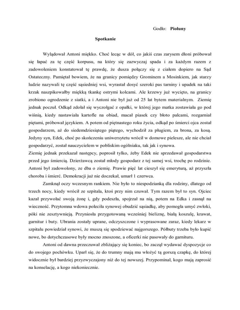 Godło: Piołuny Spotkanie Wylądował Antoni miękko. Choć lecąc w dół, co jakiś czas zarysem dłoni próbował się łapać za tę część korpusu, na który się zazwyczaj spada i za każdym razem z zadowoleniem konstatował tę prawdę, że dusza połączy się z ciałem dopiero na Sąd Ostateczny. Pamiętał bowiem, że na granicy pomiędzy Grominem a Mosinkiem, jak starzy ludzie nazywali tę część sąsiedniej wsi, wyrastał dosyć szeroki pas tarniny i upadek na taki krzak naszpikowałby miękką tkankę ostrymi kolcami. Ale krzewy już wycięto, na granicy zrobiono ogrodzenie z siatki, a i Antoni nie był już od 25 lat bytem materialnym. Ziemię jednak poczuł. Odkąd zdołał się wyczołgać z opałki, w której jego matka zostawiała go pod wiśnią, kiedy nastawiała kartofle na obiad, macał piasek czy błoto palcami, rozgarniał piętami, próbował językiem. A potem od piętnastego roku życia, odkąd po śmierci ojca został gospodarzem, aż do siedemdziesiątego piątego, wychodził za pługiem, za brona, za kosą. Jedyny syn, Edek, choć po skończeniu uniwersytetu wrócił w domowe pielesze, ale nie chciał gospodarzyć, został nauczycielem w pobliskim ogólniaku, tak jak i synowa. Ziemię jednak przekazał następcy, poprosił tylko, żeby Edek nie sprzedawał gospodarstwa przed jego śmiercią. Dzierżawcą został młody gospodarz z tej samej wsi, trochę po rodzinie. Antoni był zadowolony, ze dba o ziemię. Prawie pięć lat cieszył się emeryturą, aż przyszła choroba i śmierć. Demokracji już nie doczekał, umarł 1 czerwca. Zamknął oczy wczesnym rankiem. Nie było to niespodzianką dla rodziny, dlatego od trzech nocy, kiedy wrócił ze szpitala, ktoś przy nim czuwał. Tym razem był to syn. Ojciec kazał przywołać swoją żonę i, gdy podeszła, spojrzał na nią, potem na Edka i zasnął na wieczność. Przytomna wdowa poleciła synowej obudzić sąsiadkę, aby pomogła umyć zwłoki, póki nie zesztywnieją. Przyniosła przygotowaną wcześniej bieliznę, białą koszulę, krawat, garnitur i buty. Ubrania zostały uprane, odczyszczone i wyprasowane zaraz, kiedy lekarz w szpitalu powiedział synowi, że muszą się spodziewać najgorszego. Półbuty trzeba było kupić nowe, bo dotychczasowe były mocno znoszone, a oficerki nie pasowały do garnituru. Antoni od dawna przeczuwał zbliżający się koniec, bo zaczął wydawać dyspozycje co do swojego pochówku. Uparł się, że do trumny mają mu włożyć tą gorszą czapkę, do której widocznie był bardziej przyzwyczajony niż do tej nowszej. Przypominał, kogo mają zaprosić na konselację, a kogo niekoniecznie. Kiedy nieboszczyk wykąpany, ubrany i wyczesany oczekiwał na tapczanie pod czystym prześcieradłem na ostatni swój mebel, Edek wsiadł do malucha, który kupił mu ojciec za sprzedane trzy krowy i kasztankę i pojechał załatwiać formalności w urzędzie i kościele. Tymczasem kobiety przy pomocy sąsiadek i sąsiadów opróżniały największy pokój ze sprzętów, myły podłogi i zamiatały podwórze. Wnuki, bardziej jeszcze zdziwione niż zasmucone, snuły się po kątach i co chwila podchodziły, to do mamy, to do babci, żeby się na chwilę przytulić. Kiedy młodszy Adaś zaczął marudzić, sąsiadka skarciła go: - Bądź grzeczny, bo cię dziadek będzie straszył. I Adaś grzecznie poszedł do kuchni bawić się z siostrą. Koło południa sąsiad pojechał po trumnę traktorem, do którego przyczepiony był wóz. Jak ją przywiózł, powrócił właśnie od proboszcza Edek i przeniósł ciało ojca do ostatniego na Ziemi sprzętu. Wdowa wyposażyła małżonka we wszystko, co na tamtym świecie może się przydać: różaniec, obrazek patrona, chusteczkę do nosa, ulubioną czapkę i laskę – choć za życia jej nie używał. Następnie rodzina i sąsiedzi, którzy pomagali uklękli i odmówili litanię do św. Józefa, Wieczny odpoczynek… i odśpiewali Dobry Jezu, a nasz Panie…Dopiero przy śpiewie, i wdowie, i synowi, synowej, i wnukom popłynęły po policzkach łzy. Sąsiadka wzięła dzieciaki do siebie na obiad, bo w domu zmarłego tego dnia nie rozpalano ognia w kuchni, nie tylko z powodu braku czasu, ale też żeby nie podnosić temperatury, bo na dworze było dość ciepło. Przed wieczorem drugi sąsiad przywiózł krzyż i chorągiew, które w dzień wyprowadzenia będą niesione na czele konduktu, a teraz czarny sztandar będzie oznajmiał, że w tym domy zmarły oczekuje na wieczny spoczynek. W przygotowaniu jadła na stypę brały udział sąsiadki i kobiety z rodziny dzierżawcy. Ludzie ze wsi chętnie śpieszyli rodzinie zmarłego z usługą, bo sam Antoni jak i jego bliscy też nigdy pomocy nie odmawiali. Jak kto potrzebował młotka czy dłuta albo nawet wozu pożyczyć, to śmiało szli do tego gospodarza. A i Edek nie odmawiał podwiezienia maluchem. Dzieciak zachorował to szli, żeby podwiózł do ośrodka czy po lekarstwa do apteki. Dzieciakom wytłumaczył, jak rozwiązać zadanie z matematyki, a po drodze zawsze sąsiadki zabierał z przystanku. Nie trzeba było nikogo prosić, sami przychodzili, pytali, w czym pomóc. Proboszcz wyznaczył pogrzeb na sobotę, o 14-tej wyprowadzenie z domu, zaraz msza żałobna i na cmentarz. W dwa kolejne wieczory przed pogrzebem po oporządku przychodzili ludzie pomodlić się przy zmarłym – różaniec, litania, wieczny odpoczynek, pieśni za duszę, a i rodzinie było lżej znosić żałobę w takiej kompanii. Do niesienia trumny z nieboszczykiem nie trzeba było nikogo prosić. Jak umarł taki co dobrze się we wsi nie zasłużył, to rodzina musiała namawiać chłopaków, zazwyczaj za wódkę. Ale tu nie było takiej potrzeby. Od figury trumnę powiózł karawan z zakładu pogrzebowego, a żałobnicy pojechali wynajętym z PKS-u autokarem. Ksiądz pożegnał dobrego gospodarza i sprawiedliwego człowieka, nic nie ujmując, nic nie dodając. Na koniec trumna spoczęło w dole i zebrani za