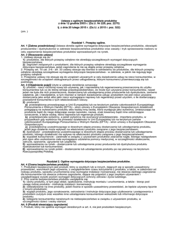 Ustawa o ogólnym bezpieczeństwie produktów z dnia 12 grudnia 2003 r. (Dz.U. Nr 229, poz. 2275) tj. z dnia 20 lutego 2015 r. (Dz.U. z 2015 r. poz. 322) (zm. ) Rozdział 1. Przepisy ogólne. Art. 1 [Zakres przedmiotowy] Ustawa określa ogólne wymagania dotyczące bezpieczeństwa produktów, obowiązki producentów i dystrybutorów w zakresie bezpieczeństwa produktów oraz zasady i tryb sprawowania nadzoru w celu zapewnienia bezpieczeństwa produktów wprowadzanych na rynek. Art. 2 [Stosowanie ustawy] 1. Ustawę stosuje się do: 1) produktów, dla których przepisy odrębne nie określają szczegółowych wymagań dotyczących bezpieczeństwa; 2) zagrożeń związanych z produktami, dla których przepisy odrębne określają szczegółowe wymagania dotyczące bezpieczeństwa, jeżeli zagrożenia te nie są objęte przez przepisy odrębne. 2. Przepisy art. 10 ust. 2-6 - art. 33 ustawy stosuje się również w odniesieniu do produktów, dla których przepisy odrębne określają szczegółowe wymagania dotyczące bezpieczeństwa - w zakresie, w jakim nie regulują tego przepisy odrębne. 3. Przepisów ustawy nie stosuje się do urządzeń używanych w celu świadczenia usług na rzecz konsumentów, w szczególności do urządzeń obsługiwanych przez usługodawcę, którymi konsumenci przemieszczają się lub podróżują. Art. 3 [Objaśnienie pojęć] Użyte w ustawie określenia oznaczają: 1) produkt - rzecz ruchomą nową lub używaną, jak i naprawianą lub regenerowaną przeznaczoną do użytku konsumentów lub co do której istnieje prawdopodobieństwo, że może być używana przez konsumentów, nawet jeżeli nie była dla nich przeznaczona, dostarczaną lub udostępnianą przez producenta lub dystrybutora, zarówno odpłatnie, jak i nieodpłatnie, w tym również w ramach świadczenia usługi; produktem nie jest rzecz używana dostarczana jako antyk albo jako rzecz wymagająca naprawy lub regeneracji przed użyciem, o ile dostarczający powiadomił konsumenta o tych właściwościach rzeczy; 2) producent: a) przedsiębiorcę prowadzącego w Unii Europejskiej lub na terytorium państw członkowskich Europejskiego Porozumienia o Wolnym Handlu (EFTA) - stron umowy o Europejskim Obszarze Gospodarczym działalność polegającą na wytwarzaniu produktu albo każdą inną osobę, która występuje jako wytwórca, umieszczając na produkcie bądź do niego dołączając swoje nazwisko, nazwę, znak towarowy bądź inne odróżniające oznaczenie, a także osobę, która naprawia lub regeneruje produkt, b) przedstawiciela wytwórcy, a jeżeli wytwórca nie wyznaczył przedstawiciela - importera produktu, w przypadkach gdy wytwórca nie prowadzi działalności w Unii Europejskiej lub na terytorium państw członkowskich Europejskiego Porozumienia o Wolnym Handlu (EFTA) - stron umowy o Europejskim Obszarze Gospodarczym, c) przedsiębiorcę uczestniczącego w dowolnym etapie procesu dostarczania lub udostępniania produktu, jeżeli jego działanie może wpływać na właściwości produktu związane z jego bezpieczeństwem; 3) dystrybutor - przedsiębiorcę uczestniczącego w dowolnym etapie procesu dostarczania lub udostępniania produktu, którego działalność nie wpływa na właściwości produktu związane z jego bezpieczeństwem; 4) wypadek konsumencki - zaistniałe w związku z używaniem produktów zdarzenie nagłe, którego następstwem jest zgon albo uszkodzenie ciała wymagające udzielenia pomocy medycznej, w szczególności skaleczenie, zatrucie, oparzenie, ugryzienie lub użądlenie; 5) wprowadzenie na rynek - dostarczanie lub udostępnianie przez producenta lub dystrybutora produktu dystrybutorowi lub konsumentowi; 6) wprowadzenie na rynek polski - dostarczenie lub udostępnienie produktu po raz pierwszy na terytorium Rzeczypospolitej Polskiej. Rozdział 2. Ogólne wymagania dotyczące bezpieczeństwa produktów. Art. 4 [Ocena bezpieczeństwa produktu] 1. Produktem bezpiecznym jest produkt, który w zwykłych lub w innych, dających się w sposób uzasadniony przewidzieć, warunkach jego używania, z uwzględnieniem czasu korzystania z produktu, a także, w zależności od rodzaju produktu, sposobu uruchomienia oraz wymogów instalacji i konserwacji, nie stwarza żadnego zagrożenia dla konsumentów lub stwarza znikome zagrożenie, dające się pogodzić z jego zwykłym używaniem i uwzględniające wysoki poziom wymagań dotyczących ochrony zdrowia i życia ludzkiego. 2. Przy ocenie bezpieczeństwa produktu uwzględnia się: 1) cechy produktu, w tym jego skład, opakowanie, instrukcję montażu i uruchomienia, a także - biorąc pod uwagę rodzaj produktu - instrukcję instalacji i konserwacji; 2) oddziaływanie na inne produkty, jeżeli można w sposób uzasadniony przewidzieć, że będzie używany łącznie z innymi produktami; 3) wygląd produktu, jego oznakowanie, ostrzeżenia i instrukcje dotyczące jego użytkowania i postępowania z produktem zużytym oraz wszelkie inne udostępniane konsumentowi wskazówki lub informacje dotyczące produktu; 4) kategorie konsumentów narażonych na niebezpieczeństwo w związku z używaniem produktu, w szczególności dzieci i osoby starsze. Art. 5 [Produkt stwarzający zagrożenie] 1. Produkt, który nie spełnia wymagań określonych w art. 4, nie jest produktem bezpiecznym. 2. Do stwierdzenia, że produkt nie jest bezpieczny, nie wystarcza możliwość osiągnięcia wyższego poziomu bezpieczeństwa lub dostępność innych produktów stwarzających mniejsze zagrożenia dla konsumentów. 3. Przy dokonywaniu oceny, czy produkt stwarza poważne zagrożenie, przez które rozumie się wymagające natychmiastowych działań naruszenie wymagań bezpieczeństwa, uwzględnia się bezpośrednie lub odsunięte w czasie skutki używania produktu, w tym stopień i prawdopodobieństwo utraty zdrowia lub życia przez konsumentów, stopień narażenia poszczególnych kategorii konsumentów oraz możliwość prawidłowej oceny ryzyka przez ko