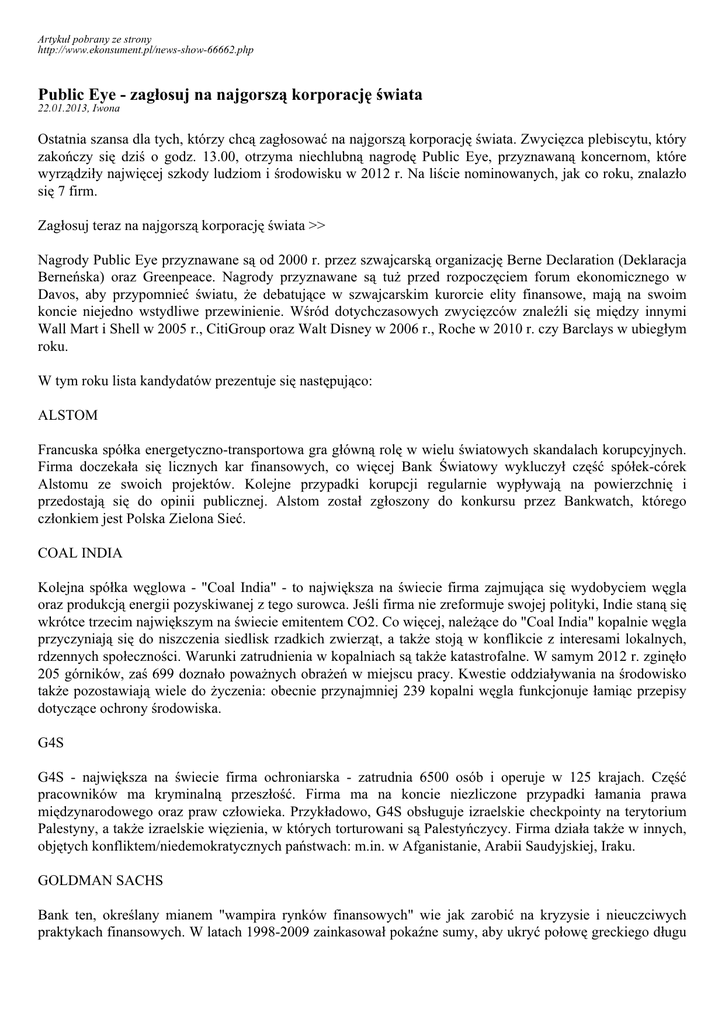 Artykuł pobrany ze strony http://www.ekonsument.pl/news-show-66662.php Public Eye - zagłosuj na najgorszą korporację świata 22.01.2013, Iwona Ostatnia szansa dla tych, którzy chcą zagłosować na najgorszą korporację świata. Zwycięzca plebiscytu, który zakończy się dziś o godz. 13.00, otrzyma niechlubną nagrodę Public Eye, przyznawaną koncernom, które wyrządziły najwięcej szkody ludziom i środowisku w 2012 r. Na liście nominowanych, jak co roku, znalazło się 7 firm. Zagłosuj teraz na najgorszą korporację świata >> Nagrody Public Eye przyznawane są od 2000 r. przez szwajcarską organizację Berne Declaration (Deklaracja Berneńska) oraz Greenpeace. Nagrody przyznawane są tuż przed rozpoczęciem forum ekonomicznego w Davos, aby przypomnieć światu, że debatujące w szwajcarskim kurorcie elity finansowe, mają na swoim koncie niejedno wstydliwe przewinienie. Wśród dotychczasowych zwycięzców znaleźli się między innymi Wall Mart i Shell w 2005 r., CitiGroup oraz Walt Disney w 2006 r., Roche w 2010 r. czy Barclays w ubiegłym roku. W tym roku lista kandydatów prezentuje się następująco: ALSTOM Francuska spółka energetyczno-transportowa gra główną rolę w wielu światowych skandalach korupcyjnych. Firma doczekała się licznych kar finansowych, co więcej Bank Światowy wykluczył część spółek-córek Alstomu ze swoich projektów. Kolejne przypadki korupcji regularnie wypływają na powierzchnię i przedostają się do opinii publicznej. Alstom został zgłoszony do konkursu przez Bankwatch, którego członkiem jest Polska Zielona Sieć. COAL INDIA Kolejna spółka węglowa - "Coal India" - to największa na świecie firma zajmująca się wydobyciem węgla oraz produkcją energii pozyskiwanej z tego surowca. Jeśli firma nie zreformuje swojej polityki, Indie staną się wkrótce trzecim największym na świecie emitentem CO2. Co więcej, należące do "Coal India" kopalnie węgla przyczyniają się do niszczenia siedlisk rzadkich zwierząt, a także stoją w konflikcie z interesami lokalnych, rdzennych społeczności. Warunki zatrudnienia w kopalniach są także katastrofalne. W samym 2012 r. zginęło 205 górników, zaś 699 doznało poważnych obrażeń w miejscu pracy. Kwestie oddziaływania na środowisko także pozostawiają wiele do życzenia: obecnie przynajmniej 239 kopalni węgla funkcjonuje łamiąc przepisy dotyczące ochrony środowiska. G4S G4S - największa na świecie firma ochroniarska - zatrudnia 6500 osób i operuje w 125 krajach. Część pracowników ma kryminalną przeszłość. Firma ma na koncie niezliczone przypadki łamania prawa międzynarodowego oraz praw człowieka. Przykładowo, G4S obsługuje izraelskie checkpointy na terytorium Palestyny, a także izraelskie więzienia, w których torturowani są Palestyńczycy. Firma działa także w innych, objętych konfliktem/niedemokratycznych państwach: m.in. w Afganistanie, Arabii Saudyjskiej, Iraku. GOLDMAN SACHS Bank ten, określany mianem "wampira rynków finansowych" wie jak zarobić na kryzysie i nieuczciwych praktykach finansowych. W latach 1998-2009 zainkasował pokaźne sumy, aby ukryć połowę greckiego długu publicznego, co zakończyło się finansową katastrofą Grecji i poważnym kryzysem w całej strefie euro. W tym samym czasie zręcznie doprowadził do napompowania bańki wokół kredytów subprime, która, gdy pękła, zakończyła się amerykańskim kryzysem m.in. na rynku nieruchomości. LONMIN Południowoafrykański Lonmin jest właścicielem kopalń m.in. rzadszego niż złoto pierwiastka - platyny. Ogarnięte platynową gorączką szefostwo spółki przekonało ministerstwo do spraw kopalń RPA, aby przy pacyfikacji strajków w kopalniach wykorzystać pomoc wojska i policji. Efekt jest wstrząsający: 34 strajkujących zostało zastrzelonych przez policję, 78 doznało poważnych obrażeń, kolejnych 10 osób zmarło podczas protestów. Dzień po masakrze Lonmin zagroził pozostałym pracownikom, że zostaną zwolnieni, jeśli strajk się nie zakończy. REPOWER Szwajcarska firma energetyczna REPOWER przymierza się do wybudowania olbrzymiej elektrowni węglowej we włoskiej Calabrii pomimo sprzeciwu lokalnych społeczności oraz samorządu. Co więcej, potencjalna lokalizacja elektrowni mieści się na terenie "administrowanym" przez organizację przestępczą "Ndrangheta". Zdaniem lokalnych działaczy antymafijnych, REPOWER będzie musiał współpracować w "Ndranghetą" jeśli zdecyduje się na konstrukcję elektrowni. Mieszkańcy nie dysponują jednak żadnymi demokratycznymi metodami, które umożliwią im zawetowanie planów budowy elektrowni, która okazać się może społeczno-ekologiczną katastrofą. SHELL Shell już po raz drugi ubiega się o tę nagrodę. W 2005 r. chodziło o łamanie praw człowieka w delcie Nigru, dziś Shell jest na cenzurowanym z powodu planów dot. wydobywania ropy naftowej w niezwykle wrażliwym środowisku Arktyki. Odwierty na Arktyce stają się możliwe dzięki sukcesywnemu zmniejszaniu się pokrywy lodowej. A lód topnieje z powodu globalnego wzrostu temperatury, do czego w znacznym stopniu przyczynia się handlujący paliwem kopalnym Shell. Odwierty w rejonie bieguna północnego stanowią poważne zagorożenie dla klimatu, żyjących w pobliżu zwierząt oraz czterech milionów ludzi. Zagłosuj teraz na najgorszą korporację świata >> Na podstawie: Public Eye (http://www.publiceye.ch/en/vote/)