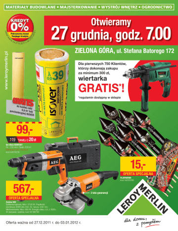 MATERIAŁY BUDOWLANE ■ MAJSTERKOWANIE ■ WYSTRÓJ WNĘTRZ ■ OGRODNICTWO k re d 7.0 1.2 012 r. Otwieramy yt wa żn yo do d 27 .12.2011 r. 0 27 grudnia, godz. 7.00 www.leroymerlin.pl ZIELONA GÓRA, ul. Stefana Batorego 172 Dla pierwszych 750 Klientów, którzy dokonają zakupu za minimum 300 zł, wiertarka GRATIS*! * regulamin dostępny w punkcie informacyjnym sklepu *regulamin dostępny w sklepie d o k a żd ej rolk 6,9 m2 f i paroizo lacyjnej olii ISOVER 119 99,TANIEJ O 20 zł Uni-Mata KOMFORT Gr.: 150 mm. Opak.: 6,9 m2. Cena za 1 m2: 14,35 zł. kod 44075276 15,- OFERTA SPECJALNA 567,- OFERTA SPECJALNA Zestaw AEG Szlifierka kątowa. Moc: 2100 W. Prędkość obrotowa: 6400 obr./min. Śr. tarczy: 230 mm. Młotowiertarka. Moc: 650 W. Energia udaru: 2,5 J. SDS+ W zestawie: walizka. kod 44186730 Oferta ważna od 27.12.2011 r. do 03.01.2012 r. FAJERWERKI kod 44220785 3 lata gwarancji specjalna OFERTA OTWARCIOWA Gwarantujemy ie zy zakup wałek pr y 7,5 l farbPORY ROKU CZTERY najniższą cenę 556 7,90 szt. Beton komórkowy szary Wym.: 24 x 24 x 59 cm. kod 43947106 599 TANIEJ O 24% Podkład cementowy PRESTIGE Opak.: 25 kg. Cena za 1 kg: 0,24 zł. kod 44167774 3490 3699 42,81 TANIEJ O 18% Emulsyjna farba lateksowa do ścian i sufitów CZTERY PORY ROKU Poj.: 2,5 l. Dostępna w 18 kolorach. Cena za 1 l: 13,96 zł. kod 42704046 Lateksowa farba do ścian i sufitów LUXENS Poj.: 2,5 l. Wykończenie: mat. Dostępna w 34 kolorach + biały. Cena za 1 l: 14,80 zł. kod 43502424 * ACRYL a DULUX biała farb y zakupie 10 l rz za 1 zł* p LORY ŚWIATA O K X DULU MATT 3 l 19 99 Akrylowa farba do ścian i sufitów ŚNIEŻKA ACRYL WHITE Poj.: 10 l. Kolor: biały. Wykończenie: mat. Cena za 1 l: 1,99 zł. kod 43732122 28,24 TANIEJ O 29% nka druga pia Wraz z zespołem mam przyjemność zaprosić Was do nowego sklepu Leroy Merlin w Zielonej Górze. Chcemy podzielić się pasją do ulepszania komfortu życia. Wierzę, że nasze propozycje i aranżacje będą inspiracją, a doradcy handlowi podzielą się z Wami pomysłami na techniczne rozwiązania dla domu. Nowy sklep to świeże spojrzenie i wyjątkowo atrakcyjne oferty na powitanie. Zapraszamy! Dariusz Legucki dyrektor sklepu 9,70 770 TANIEJ O 20% Cement II 32,5 Opak.: 25 kg. Cena za 1 kg: 0,31 zł. kod 42895503 1669 21,98 TANIEJ O 24% Gładź szpachlowa EXTRA BIAŁA Opak.: 20 kg. Zużycie: ok. 1 kg/1 m2/1 mm grubości warstwy. Cena za 1 kg: 0,83 zł. kod 42761110 104 89,TANIEJ O 15 zł Farba DULUX KOLORY ŚWIATA Poj.: 5 l. Dostępna w 66 kolorach. Cena za 1 l: 17,80 zł. kod 42850332 wałek 18 produkt polski 1448 cm OFERTA SPECJALNA Piana montażowa zimowa HELIOS Poj.: 750 ml. Cena za 1 l: 19,31 zł. kod 42789782 PLAN SKLEPU 141 opak. 58 TANIEJ O 4,30 zł Wełna izolacyjna Gr.: 150 mm. Opak.: 7,2 m2. Zastosowanie: izolacja termiczna, akustyczna poddaszy użytkowych. Cena za 1 m2: 8,06 zł. kod 44178344 175,- 99,TANIEJ O 5370 219 TANIEJ O 44 zł Drabina aluminiowa Liczba stopni: 3 x 7. Wys. całkowita: 3,78 m. Waga: 10,8 kg. Obciążenie: 150 kg. kod 43227072 42 zł Farba strukturalna do ścian SILHOUETTE IMPRESSION Poj.: 10 l. Kolor: biały. Cena za 1 l: 9,90 zł. kod 43074381 1290 szt. 14,98 TANIEJ O 13% Płyta GKB Wym.: 1200 x 2000 mm. Gr.: 12,5 mm. kod 42169372 1980 opak. 29 TANIEJ O 9,20 zł Płytka elewacyjna CATANIA Opak.: 0,5 m2. Cena za 1 m2: 39,60 zł. kod 44145206 2 KREDYT 0% od 27.12.2011 r. do 07.01.2012 r. specjalna OFERTA OTWARCIOWA Oferujemy 129 ierteł Zestaw skrzynek narzędziowych: 22” + 12” Zintegrowany podwójny organizer w modelu 22”. kod 43682191 40 90 cm 176,- cm 249 119,- Wiertarka udarowa SKIL Moc: 550 W. Prędkość obrotowa: 0-3000 obr./min. Maks. śr. wiercenia w drewnie: 35 mm. W zestawie: ogranicznik głębokości i klucz wiertarski. kod 43769971 159,TANIEJ O 40 zł Wyrzynarka z podcinaniem SKIL Moc: 800 W. Walizka w komplecie. kod 44133495 73 zł 199,- 299 TANIEJ O 100 zł Pilarka spalinowa HARDER PN 4500 Moc: 2 KM. Poj. skokowa silnika: 45,2 cm3. Dł. prowadnicy: 40 cm. Waga: 6 kg. kod 43834056 drugi akumulator w komplecie zestaw akcesoriów w komplecie 180 cm obciążenie na półkę do 300 kg TANIEJ O szczotka Odkurzacz uniwersalny KÄRCHER WD 3.200 (mokro/sucho) Moc: 1400 W. Maks. siła ssania: 210 mbar. Poj. zbiornika: 17 l. Waga: 7,5 kg. Wąż ssący: 2 m. Kabel zasilający: 4 m. kod 43952713 OFERTA SPECJALNA 199 178 zł maks. ciśnienie 130 barów zestaw w 33,50 TANIEJ O 17% TANIEJ O Myjka wysokociśnieniowa K 4.85 KÄRCHER Moc: 1900 W. Maks. wydajność: 440 l/h. Maks. temp. wody: 40°C. Dł. węża: 6 m. Waga: 8,5 kg. kod 43932490 funkcja wydmuchu w zestawie: filtr typu cartridge, torebka filtracyjna 30 zł Szlifierka kątowa SKIL Moc: 550 W. Śr. tarczy: 115 mm. Prędkość obrotowa: 11 000 obr./min. kod 44053982 2497 858 2 rury przedłużające (2 x 0,5 m) 99,TANIEJ O 680,- program lojalnościowy blokada wrzeciona produkt polski 159,- 199 TANIEJ O 40 zł Wkrętarka SKIL Poj. akumulatora: 1,2 Ah. Maks. prędkość obrotowa: 1100 obr./min. Rodzaj akumulatora: NiCd. Maks. czas ładowania: 3 h. kod 44172891 sekator podwójny manometr walizka i drugi akumulator w komplecie 199,- 278 TANIEJ O 79 zł 147 Kompresor olejowy 24 l SCHEPPACH Wyd.: 220 l/min. Poj.: 24 l. Waga: 25,5 kg. kod 43649214 99,TANIEJ O 48 zł Siekiera rozłupująca FISKARS kod 43994601 5499 68,84 TANIEJ O 13,85 zł 119 578,- 79,TANIEJ O 748 40 zł Regał ocynkowany z półką z płyty wiórowej Wym.: 180 x 90 x 40 cm. kod 43977584 4 TANIEJ O 170 zł Wiertarkowkrętarka MAKITA 6271 DWAE Napięcie akumulatora: 12 V. Bateria niklowo-kadmowa. Poj. akumulatora: 2 Ah. Prędkość obrotowa I: 350 obr./min. Prędkość obrotowa II: 1200 obr./min. Waga: 1,5 kg. Maks. śr. wiercenia: stal: 10 mm, drewno: 25 mm. kod 43646274 KREDYT 0% od 27.12.2011 r. do 07.01.2012 r. 648,- 807 TANIEJ O 159 zł Generator prądu LT 2500 Moc znamionowa: 2000 W. Maks. moc: 2200 W. Silnik czterosuwowy. Zbiornik paliwa o poj. 15 l. kod 43343944 Drabina aluminiowa 4-stopniowa Dopus
