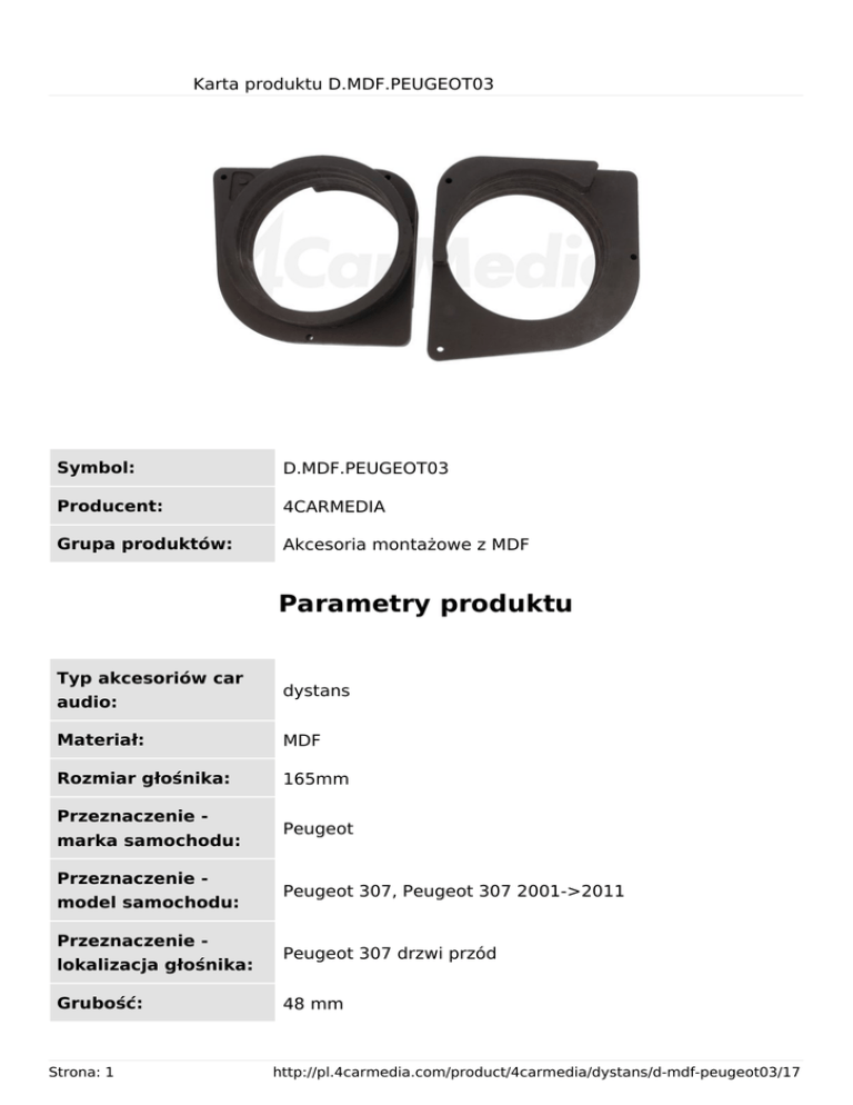 Karta produktu D.MDF.PEUGEOT03 Symbol: D.MDF.PEUGEOT03 Producent: 4CARMEDIA Grupa produktów: Akcesoria montażowe z MDF Parametry produktu Typ akcesoriów car audio: dystans Materiał: MDF Rozmiar głośnika: 165mm Przeznaczenie marka samochodu: Przeznaczenie model samochodu: Przeznaczenie lokalizacja głośnika: Grubość: Strona: 1 Peugeot Peugeot 307, Peugeot 307 2001->2011 Peugeot 307 drzwi przód 48 mm http://pl.4carmedia.com/product/4carmedia/dystans/d-mdf-peugeot03/17 Karta produktu D.MDF.PEUGEOT03 Właściwości car audio: impregnowany Informacje dodatkowe Masa brutto: Strona: 2 0,77 kg http://pl.4carmedia.com/product/4carmedia/dystans/d-mdf-peugeot03/17