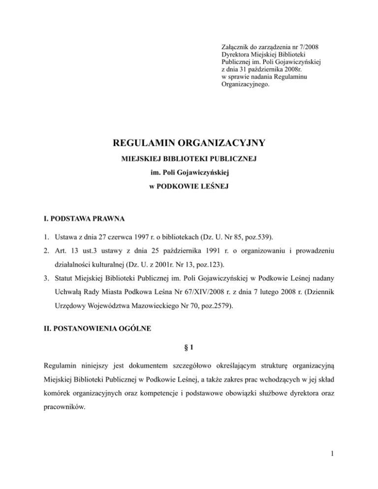 Załącznik do zarządzenia nr 7/2008 Dyrektora Miejskiej Biblioteki Publicznej im. Poli Gojawiczyńskiej z dnia 31 października 2008r. w sprawie nadania Regulaminu Organizacyjnego. ! ! ! REGULAMIN ORGANIZACYJNY MIEJSKIEJ BIBLIOTEKI PUBLICZNEJ im. Poli Gojawiczyńskiej w PODKOWIE LEŚNEJ ! ! I. PODSTAWA PRAWNA ! 1. Ustawa z dnia 27 czerwca 1997 r. o bibliotekach (Dz. U. Nr 85, poz.539). 2. Art. 13 ust.3 ustawy z dnia 25 października 1991 r. o organizowaniu i prowadzeniu działalności kulturalnej (Dz. U. z 2001r. Nr 13, poz.123). 3. Statut Miejskiej Biblioteki Publicznej im. Poli Gojawiczyńskiej w Podkowie Leśnej nadany Uchwałą Rady Miasta Podkowa Leśna Nr 67/XIV/2008 r. z dnia 7 lutego 2008 r. (Dziennik Urzędowy Województwa Mazowieckiego Nr 70, poz.2579). II. POSTANOWIENIA OGÓLNE ! ! §1 Regulamin niniejszy jest dokumentem szczegółowo określającym strukturę organizacyjną Miejskiej Biblioteki Publicznej w Podkowie Leśnej, a także zakres prac wchodzących w jej skład komórek organizacyjnych oraz kompetencje i podstawowe obowiązki służbowe dyrektora oraz pracowników. ! ! ! (1 ! ! §2 Ilekroć w Regulaminie jest mowa o: ! 1. Bibliotece - należy przez to rozumieć Miejską Bibliotekę Publiczną w Podkowie Leśnej. 2. Dyrektorze - należy przez to rozumieć Dyrektora Miejskiej Biblioteki Publicznej w Podkowie Leśnej. ! §3 ! Biblioteka realizuje zadania określone w Statucie Biblioteki. ! ! ! ! ! III. STRUKTURA ORGANIZACYJNA BIBLIOTEKI ! §4 ! Funkcjonowanie Biblioteki oparte jest na zasadach jednoosobowego zarządzania, podporządkowania służbowego, wyraźnego podziału kompetencji i funkcji służbowych oraz całkowitej indywidualnej odpowiedzialności za realizację wszystkich powierzonych prac i zadań. ! ! §5 Na terenie miasta Podkowa Leśna działa jedna placówka będąca Biblioteką główną pełniącą rolę Wypożyczalni i Czytelni dla Dorosłych, Dzieci i Młodzieży oraz Czytelni Internetowej. ! ! Struktura organizacyjna Biblioteki: ! §6 1. Dyrektor Biblioteki 2. Dział Księgowo – Finansowy i Kadrowy 3. Wypożyczalnia i Czytelnia dla Dorosłych, Dzieci i Młodzieży (2 4. Czytelnia Internetowa 5. Dział Administracyjno - Gospodarczy ! ! IV. PODZIAŁ KOMPETENCJI ! A. DYREKTOR BIBLIOTEKI ! ! §7 Dyrektor Biblioteki podlega bezpośrednio Burmistrzowi Miasta. Zakres działania, obowiązki i uprawnienia Dyrektora Biblioteki określa statut Biblioteki. Prawo udzielania informacji o Bibliotece na zewnątrz przysługuje wyłącznie Dyrektorowi. ! §8 ! Dyrektor jest bezpośrednim zwierzchnikiem służbowym pracowników: 1) zarządza Biblioteką i kieruje całokształtem jej działalności; 2) wydaje zarządzenia zgodnie z zakresem działania Biblioteki; 3) może w miarę potrzeb tworzyć lub likwidować nowe komórki organizacyjne 4) nadaje ogólny kierunek działalności Biblioteki i sprawuje nad nią bezpośredni nadzór. ! §9 ! Dyrektorowi podlegają bezpośrednio: ! 1) Główny księgowy 2) Pracownicy merytoryczni ! ! 3) Kierownik Administracyjny i pracownicy obsługi § 10 Dyrektor reprezentuje Bibliotekę na zewnątrz i jest odpowiedzialny za całokształt jej działalności a w szczególności za: 1) Realizację zadań w zakresie działalności merytorycznej, finansowej i administracyjnej, systematyczne opracowywanie planów pracy instytucji, przygotowywanie analiz (3 opisowych oraz bieżących sprawozdań. 2) Opracowywanie, zatwierdzanie i wykonanie rocznych planów finansowych, zgodnie z zasadami dyscypliny budżetowej. 3) Prawidłowe i terminowe realizowanie należnych dochodów. 4) Ścisłe przestrzeganie zasad celowego i gospodarnego wykorzystania środków budżetowych. 5) Niedopuszczanie do zaciągania zobowiązań nie znajdujących pokrycia w zatwierdzonym planie finansowym na dany rok. 6) Bieżące analizowanie przebiegu wykonania zadań budżetowych i niezwłoczne oraz skuteczne podejmowanie działań eliminujących powstawanie nieprawidłowości w realizacji budżetu Biblioteki. 7) Składanie w imieniu Biblioteki oświadczeń woli oraz podejmowanie dwuosobowo (wraz z Głównym Księgowym) zobowiązań finansowych znajdujących pokrycie w budżecie Biblioteki. 8) Politykę kadrową i racjonalne gospodarowanie funduszem płac. 9) Kształt struktury organizacyjnej i funkcjonalnej Biblioteki. 10)Efektywne i sprawne funkcjonowanie wszystkich komórek organizacyjnych Biblioteki. 11)Właściwą organizację pracy i podział zadań. 12)Nadzór nad działalnością merytoryczną wszystkich komórek organizacyjnych. 13)Ustalanie zasad i nadzór merytoryczny nad polityką gromadzenia i udostępniania zbiorów. 14)Kontrolę merytoryczną oraz nadzorowanie terminowej realizacji planu skontrów zbiorów bibliotecznych. 15)Systematyczną, zgodną z obowiązującymi przepisami, selekcję zasobów bibliotecznych. 16)Egzekwowanie i ocenę poziomu wykonania zadań i bieżących poleceń służbowych. 17)Racjonalną i celową gospodarkę majątkiem Biblioteki. 18)Promocję i kreowanie pozytywnego obrazu placówki w środowisku. 19)Wdrażanie nowoczesnych technik pracy bibliotecznej i informacyjnej, sprawnych rozwiązań systemowych oraz skutecznych metod promocji książki i czytelnictwa. (4 20)Bezpieczeństwo i higienę pracy oraz ochronę p.poż. 21)Kontakty z władzami miasta oraz w miarę możliwości finansowo-kadrowych realizację ich zaleceń odnoszących się do działalności Biblioteki. 22)Współpracę i kontakty z innymi instytucjami kulturalnymi w kraju i poza jego granicami. ! ! ! ! § 11 1. Dyrektora w czasie jego nieobecności zastępuje Główny Księgowy Biblioteki, upoważniony na piśmie do sprawowania czynności zwykłego zarządu. 2. W przypadku nieobecności zarówno Dyrektora, jak i Głównego Księgowego Biblioteki czynności zwykłego zarządu sprawuje upoważniony na piśmie pracownik merytoryczny Biblioteki. 3. W przypadkach losowych powodujących niemożność sprawowania przez Dyrektora czynności zwykłego zarządu w związk