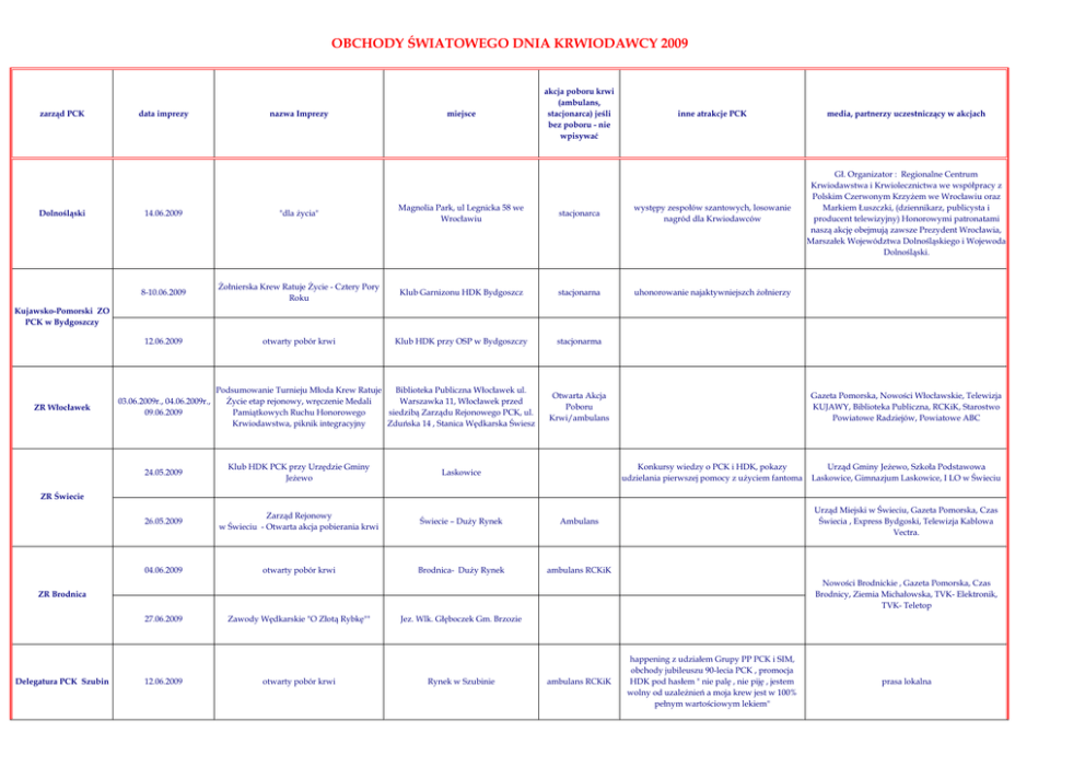 OBCHODY ŚWIATOWEGO DNIA KRWIODAWCY 2009 zarząd PCK Dolnośląski data imprezy nazwa Imprezy miejsce akcja poboru krwi (ambulans, stacjonarca) jeśli bez poboru - nie wpisywać inne atrakcje PCK media, partnerzy uczestniczący w akcjach Gł. Organizator : Regionalne Centrum Krwiodawstwa i Krwiolecznictwa we współpracy z Polskim Czerwonym KrzyŜem we Wrocławiu oraz Markiem Łuszczki, (dziennikarz, publicysta i producent telewizyjny) Honorowymi patronatami naszą akcję obejmują zawsze Prezydent Wrocławia, Marszałek Województwa Dolnośląskiego i Wojewoda Dolnośląski. 14.06.2009 "dla Ŝycia" Magnolia Park, ul Legnicka 58 we Wrocławiu stacjonarca występy zespołów szantowych, losowanie nagród dla Krwiodawców 8-10.06.2009 śołnierska Krew Ratuje śycie - Cztery Pory Roku Klub Garnizonu HDK Bydgoszcz stacjonarna uhonorowanie najaktywniejszch Ŝołnierzy 12.06.2009 otwarty pobór krwi Klub HDK przy OSP w Bydgoszczy stacjonarma Kujawsko-Pomorski ZO PCK w Bydgoszczy ZR Włocławek 03.06.2009r., 04.06.2009r., 09.06.2009 Podsumowanie Turnieju Młoda Krew Ratuje Biblioteka Publiczna Włocławek ul. śycie etap rejonowy, wręczenie Medali Warszawka 11, Włocławek przed Pamiątkowych Ruchu Honorowego siedzibą Zarządu Rejonowego PCK, ul. Krwiodawstwa, piknik integracyjny Zduńska 14 , Stanica Wędkarska Świesz Otwarta Akcja Poboru Krwi/ambulans 24.05.2009 Klub HDK PCK przy Urzędzie Gminy JeŜewo Laskowice 26.05.2009 Zarząd Rejonowy w Świeciu - Otwarta akcja pobierania krwi Świecie – DuŜy Rynek Ambulans 04.06.2009 otwarty pobór krwi Brodnica- DuŜy Rynek ambulans RCKiK Gazeta Pomorska, Nowości Włocławskie, Telewizja KUJAWY, Biblioteka Publiczna, RCKiK, Starostwo Powiatowe Radziejów, Powiatowe ABC Konkursy wiedzy o PCK i HDK, pokazy udzielania pierwszej pomocy z uŜyciem fantoma Urząd Gminy JeŜewo, Szkoła Podstawowa Laskowice, Gimnazjum Laskowice, I LO w Świeciu ZR Świecie Urząd Miejski w Świeciu, Gazeta Pomorska, Czas Świecia , Express Bydgoski, Telewizja Kablowa Vectra. Nowości Brodnickie , Gazeta Pomorska, Czas Brodnicy, Ziemia Michałowska, TVK- Elektronik, TVK- Teletop ZR Brodnica 27.06.2009 Delegatura PCK Szubin 12.06.2009 Zawody Wędkarskie "O Złotą Rybkę"" otwarty pobór krwi Jez. Wlk. Głęboczek Gm. Brzozie Rynek w Szubinie ambulans RCKiK happening z udziałem Grupy PP PCK i SIM, obchody jubileuszu 90-lecia PCK , promocja HDK pod hasłem " nie palę , nie piję , jestem wolny od uzaleŜnień a moja krew jest w 100% pełnym wartościowym lekiem" prasa lokalna ZR Inowrocław 20.06.2009r Memoriał Kazimierza Derendy w Strzelaniu z KBKS Kobylniki Lubelski 14.06.2009 r. spotkanie pod Pomnikiem "Honorowym Krwiodawcom PCK - Społeczeństwo" Lublin, ul. I Armii Wojska Polskiego 8 Lubuski 14.06.2009 "90 lat Polskiego Czerwonego KrzyŜa z Miastem Zielona Góra" - Uroczyste rozpoczęcie VI edycji konkursu "Potrzebna krew - Wakacje 2009" w Zielonej Górze i w województwie Pokazy ratownicze, podsumowanie akcji "Ratuj Busy RCKiK Zielona Ŝycie - weź apteczkę", otwarta scena muzyczna, Deptak w Zielonej Górze przy Ratuszu Góra (od 11.00 do punkty informacyjne PCK - HDK, konkursy 16.00) rodzinne i dla dzieci Radio ESKA, Radio Zachód, Radio Zielona Góra, TV Odra, TVP regionalna, Gazeta Lubuska , Gazeta Wyborcza. Partnerzy: Urząd Miasta Zielona Góra, Regionalne Centrum Krwiodawstwa i Krwio;ecznictwa w Zielonej Górze, Zielonogórski Ośrodek Kultury w Zielonej Górze. ZR PCK Pabianice 16.06.2009 spotkanie najbardziej aktywnych Honorowych Dawców Krwi PCK z Pabianic i powiatu pabianckiego siedziba Zarządu Rejonowego PCK w Pabianicach Tygodnik "Nowe śycie Pabianic", "śycie Pabianic", "BliŜej Ciebie" - Express Ilustrowany, Telewizja "ProMOK" ZR PCK Wieluń 12.06.2009 otwarta akcje pobierania krwi Masłowice ambulans Kulisy Powiatu ZR PCK Wieluń 15.06.2009 otwarta akcje pobierania krwi I LO Wieluń ambulans Radio ZW ZR PCK Radomsko 15.06.2009 Podsumowanie VI edycji Turnieju "Młoda Krew Ratuje śycie" Zespół Szkół Drzewnych i Ochrony Środowiska ul. Brzeźnicka 39 9 - 13.06.2009 33.Ogólnopolski Rajd Honorowych Dawców Krwi PCK"Czerwona RóŜa" Beskidz Sadecki, Baza Rajdu OW w Muszynie 20.06.2009 Uroczyste uhonorowanie wpisem do Księgi Honorowych dawców Krwi PCK ZasłuŜonych dla województwa Małopolskiego 20.06.2009 nie zawody towarzyszące, rzut lotką Panorama Kruszwicka, Gazeta Pomorska nie lubelskie media, przedstawiciele administracji rządowej i samorządowej, RCKiK w Lublinie poczęstunek, projekcja filmu nt. honorowego krwiodawstwa lokalne media radomszczańskie nie Konkursy wiedzy o PCK i HDK, Konkursy Oświatowe, Konkursy rekreacyjno-sportowe prasa lokalna Restauracjia śydowska "Ariel" Kraków,ul.Szeroka 18 godz.12.00 nie cześć artystyczna - wystep zepołu QUARTET KLEZMER TRIO krakowskie media Uroczyste obchody Światowego Dnia Krwiodawcy Starostwo Powiatowe w Krakowie, al.Słowackiego 20,I pietro- Sala Senacka godz.14.00 nie cześć artystyczna Dziennik Polski 27.06.2009 Międzynarodowa Spartakiada HDK Stadion Glinik Gorlice,ul. Sportowa Gorlicegodz.9.00 nie konkurencje sportowe, ognisko prasa lokaln , gazeta gorlicka, TV Gorlicka 20.06.2009 Rajd samochodowy Lelis - Lelis 14.06.2009 spotkanie poświęcone honorowemu krwiodawstwu Małkinia , Gminny Ośrodek Kultury 14.06.2009 śyczenia dla krwiodawców w mediach lokalnych Ciechanów Urząd Gminy w Lelisie, Klub HDK PCK przy OSP Lelis stacjonarna Urząd Gminy media lokalne, ZR PCK 12.06.2009r. II Rejonowe Zawody Strzeleckie Honorowych Dawców Krwi Polskiego Czerwonego KrzyŜa 13.06.2009r. Festyn z okazji Światowego Dnia Honorowego Krwiodawcy 14.06.2009r. "Światowy Dzień HDK" Rzeszów, "TESCO", ul. Armi Krajowej 23.06.2009r. "MoŜesz Pomóc" 27.06.2009r. Ozimek, strzelnica sportowa nie zawody "Wiadomości Ozimskie" stoisko promocyjne HDK PCK, loteria, podsumowanie VI edycji Tyurnieju Szkół ph. "Młoda Krew Ratuje śycie", pokazy pierwszej pomocy, konkursy wiedzy o hdk i PCK, zabawy dla