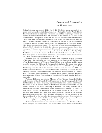 Control and Cybernetics vol. 36 (2007) No. 3 Stefan Rolewicz was born in 1932, March 15. His father was a mechanical engineer and his mother studied mathematics. During the World War II Stefan Rolewicz attended underground education and at this early stage showed exceptional mathematical abilities. He was one of the winners of the first Polish Mathematical Olympics in 1949/1950. In 1952 he married Danuta Przeworska. They have been collaborating successfully on many mathematical topics until today. Stefan Rolewicz completed mathematical studies at the University of Warsaw by writing a master thesis under the supervision of Stanislaw Mazur. The thesis appeared as a paper “On inversion of non-linear transformations” (Studia Math. 17 (1958)). In 1958 he defended his doctoral thesis. His advisor was again S. Mazur. An essential part of the thesis was published under the title “On a certain class of linear metric spaces” (Bull. Acad. Polon. Sci. 5 (1957)). In 1962 he received the degree of Doctor Habilitated, based on the dissertation “On spaces of holomorphic functions”, published in Studia Mathematica, 21 (1962), and was appointed professor in 1970. Between 1954 and 1958 Stefan Rolewicz held a position at the University of Warsaw. Since then he has been working at the Institute of Mathematics of the Polish Academy of Sciences, from 1970 on as a professor and for many years he headed the Division of Mathematical Analysis. He was a very active member of the Scientific Council of the Institute. In 1989 he organized the Publishing Department of the Institute and had been its head till 2006. He had longer scientific visits to Moscow University, University of Toronto, University of Karlsruhe, Monash University. He delivered invited lectures in Canada, USA, Germany, The Netherlands, Belgium, Soviet Union, Bulgaria, Hungary, Czechoslovakia, China, France, Greece, Yugoslavia, England, Sweden, Italy and Australia. Professor Rolewicz was elected Member of the Warsaw Scientific Society and President of the Council of the Foundation for the Development of Polish Mathematics. He was a recipient, together with his wife Danuta PrzeworskaRolewicz, of the S. Banach award of the Polish Mathematical Society. He got several awards of the Polish Academy of Sciences. For many years he was a treasurer of the main office of the Polish Mathematical Society. In 1969-1977 and 1983-87 he was the President of the Warsaw Branch of the Society. He has also been serving for a long time on the Scientific Council of the Systems Research Institute of the Polish Academy of Sciences. He is a member of the Editorial Boards of the journals: Applicationes Mathematicae, Commentationes Mathematicae, Control and Cybernetics, Zeitschrift für Analysis und ihre Anwendungen (till January 2007), Scientiae Mathematicae Japonicae. Professor Rolewicz’s main mathematical contributions are devoted to functional analysis and optimization. He is the author or co-author of more than 874 J. ZABCZYK 160 scientific papers and four mathematical monographs. He was an advisor to the following 14 PhD theses: Kazimierz Malanowski (1965) Kalindi Singbal-Vedak (India, 1968) Grażyna Pankiewicz (1972) Szymon Dolecki (1973) Quy Thi Kim Vu (Vietnam, 1974) Jerzy Wilkowski (1974) Czeslaw Siemaszko (1974) Phanh Quoc Khanh (Vietnam, 1978) Sodowyn Batsuren (Mongolia, 1983) Ewa Bednarczuk (1986) Alicja Sterna-Karwat (1987) Stanislaw Kryński (1989) Szczepan Perz (1990) Song Wen (China, 1997). Professor Rolewicz started his scientific work from the theory of metric linear spaces. Besides many papers on this subject, he wrote a book Metric Linear Spaces, published by PWN, Polish Scientific Publishers, in 1973. The book had a second edition in 1985 (Reidel and PWN) and is an authoritative source on the subject. Together with D. Przeworska-Rolewicz he developed an algebraic approach to the theory of linear operators. The results of their studies were summarized in the book Equations in Linear Spaces, published by PWN in 1968. He wrote, together with W. Żelazko, a series of important papers on linear topological algebras. One should mention in this context the paper Entire functions in B0-algebras (Studia Math. 21, 1962), co-authored with B. Mityagin and W. Żelazko. His paper On orbits of elements (Studia Math. 32, 1969), in which he constructed the first example of a hypercyclic operator in a Banach space, exerted a significant influence. The theory of hypercyclic operators is now developing very fast. In the paper On drop property (Studia Math. 85, 1986) he introduced and investigated an important functional-analytic concept, which attracted attention of many researchers. The interest in optimization and control theory was stimulated by Professor Rolewicz’s participation in famous Gelfand’s seminar in Moscow. He pioneered in Poland the applications of functional analysis to those more applied disciplines of mathematics. Since 1964 he runs, together with Professor D. Przeworska-Rolewicz, a seminar at the Institute of Mathematics of the Academy, devoted to applications of mathematics to engineering problems. This research activity culminated in the monograph Functional Analysis and Control Theory, published by PWN, in Polish in 1974 (2nd edition 1977, German edition by Springer Verlag, 1976, revised and extended English edition by Reidel and PWN, 1987). He was an advisor of several PhD theses devoted to control of distributed parameter systems. With D. Pallaschke he wrote a monograph Foundations of Mathematical Optimization, published by Kluwer in 1997. Recently, his research interests concentrate on optimization in metric spaces and, in particular, on what can be called convex analysis without linearity. The following most recent publications of Professor Rolewicz include: Paraconvex analysis (Control and Cybernetics 34, 2005), On the Rockafellar theorem for monotone multifunctions (Studia Math. 172, 2006), Paraconvex analysis on CE1,u-manifolds (Op